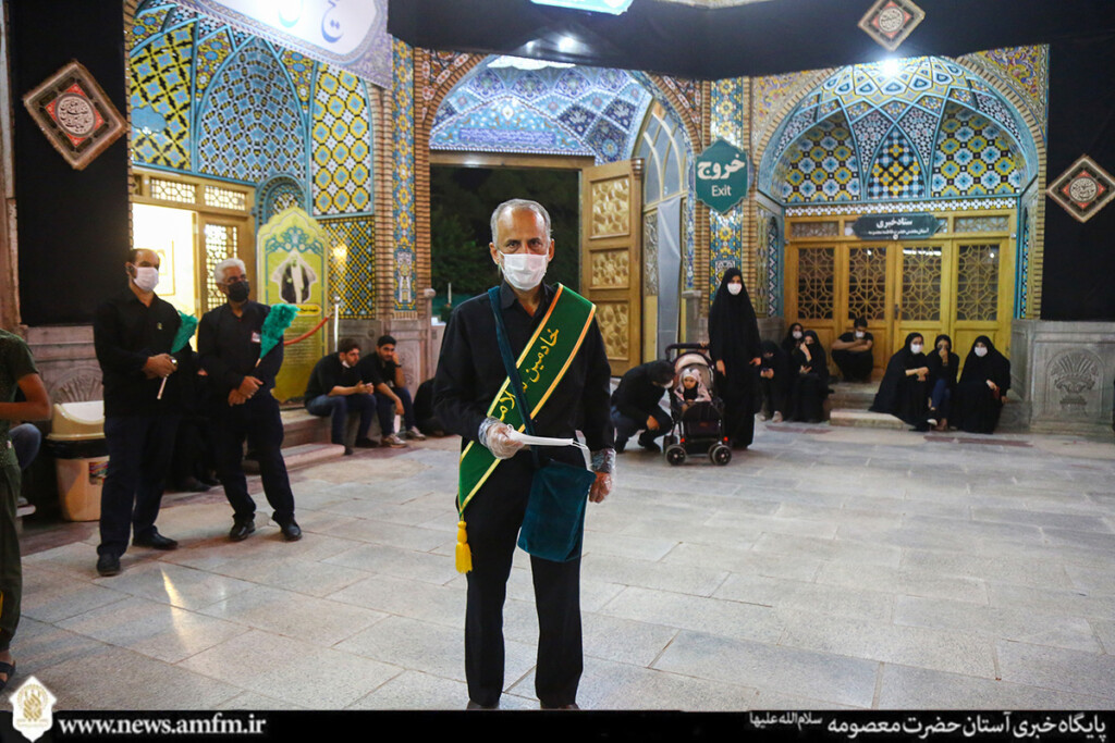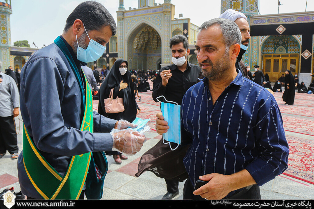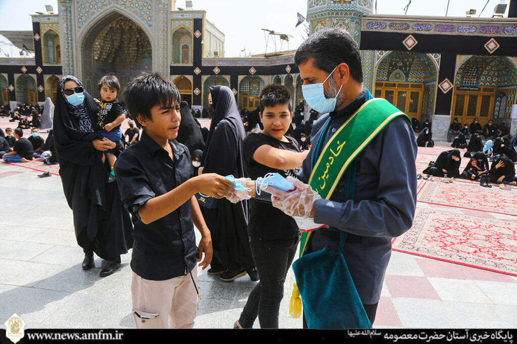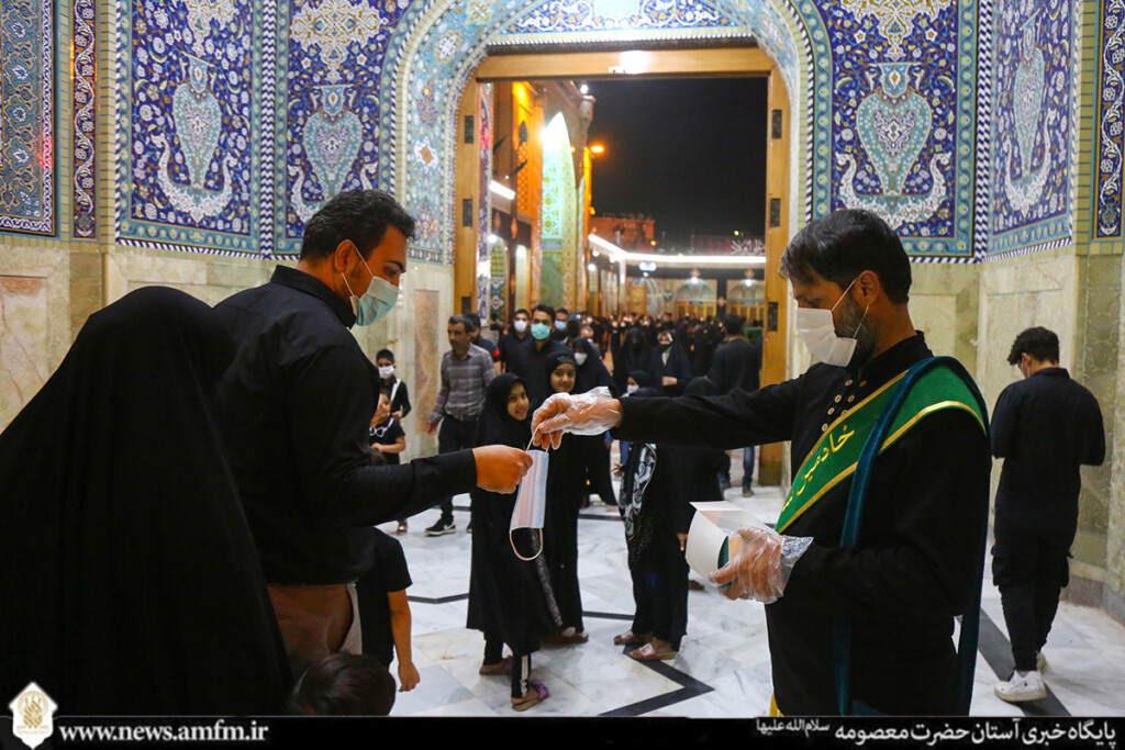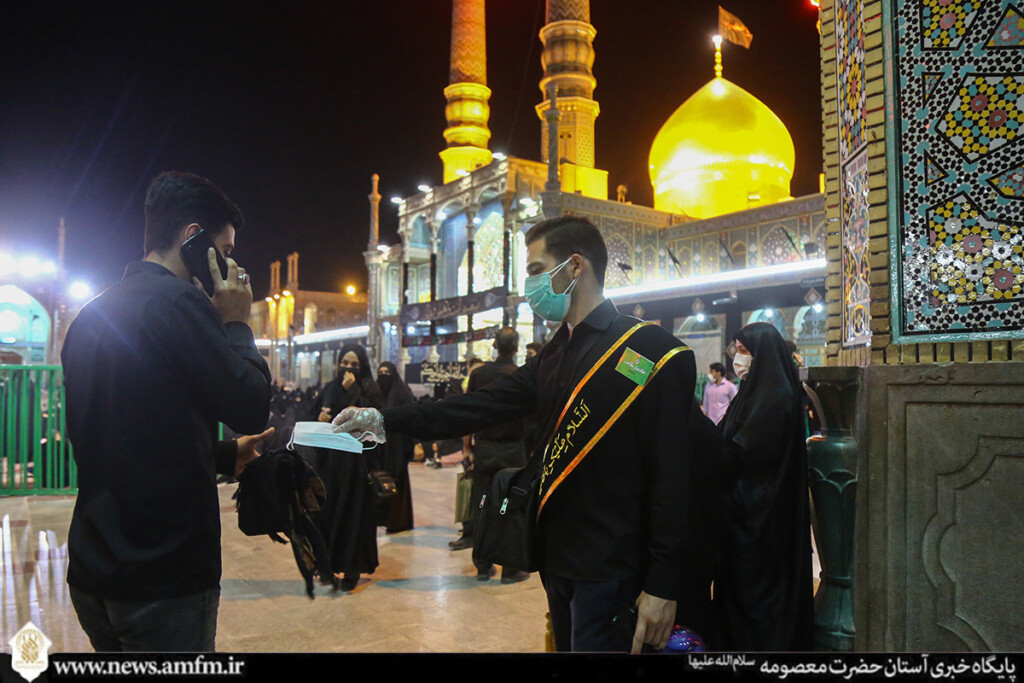 جمعی از خادمان حرم مطهر بانوی کرامت با توجه به افزایش جمعیت زائران حرم در روزهای تاسوعا و عاشورای حسینی، در قالب خادمان سلامت بسیج شده و رعایت دقیق شیوهنامههای بهداشتی به ویژه توزیع ماسک میان زائران را دنبال میکنند.