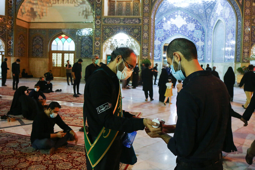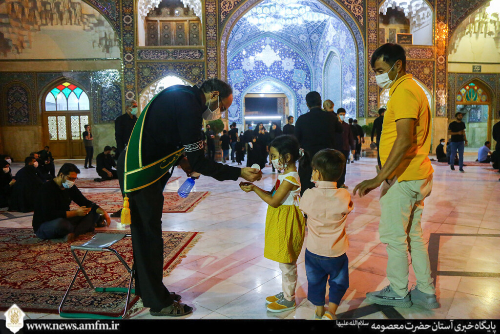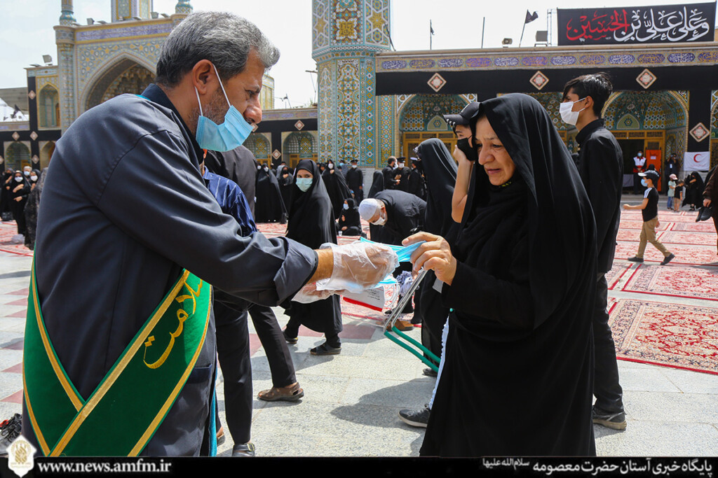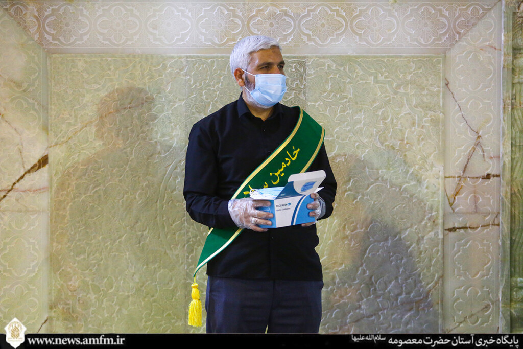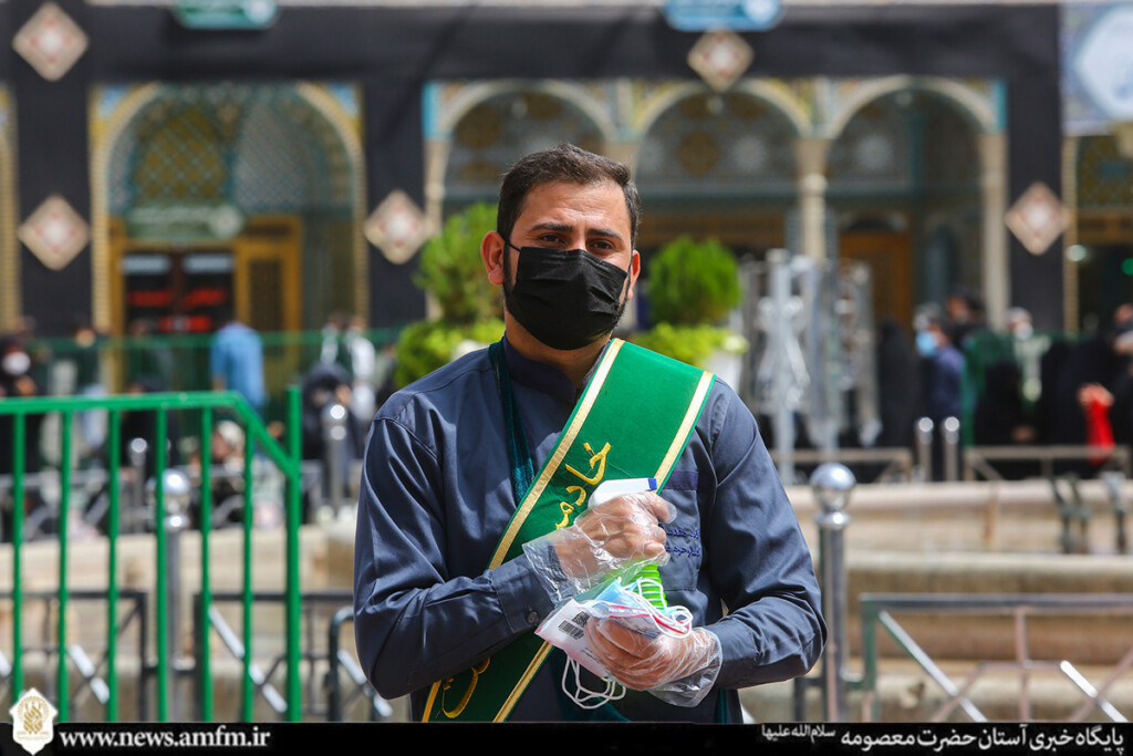 جمعی از خادمان حرم مطهر بانوی کرامت با توجه به افزایش جمعیت زائران حرم در روزهای تاسوعا و عاشورای حسینی، در قالب خادمان سلامت بسیج شده و رعایت دقیق شیوهنامههای بهداشتی به ویژه توزیع ماسک میان زائران را دنبال میکنند.