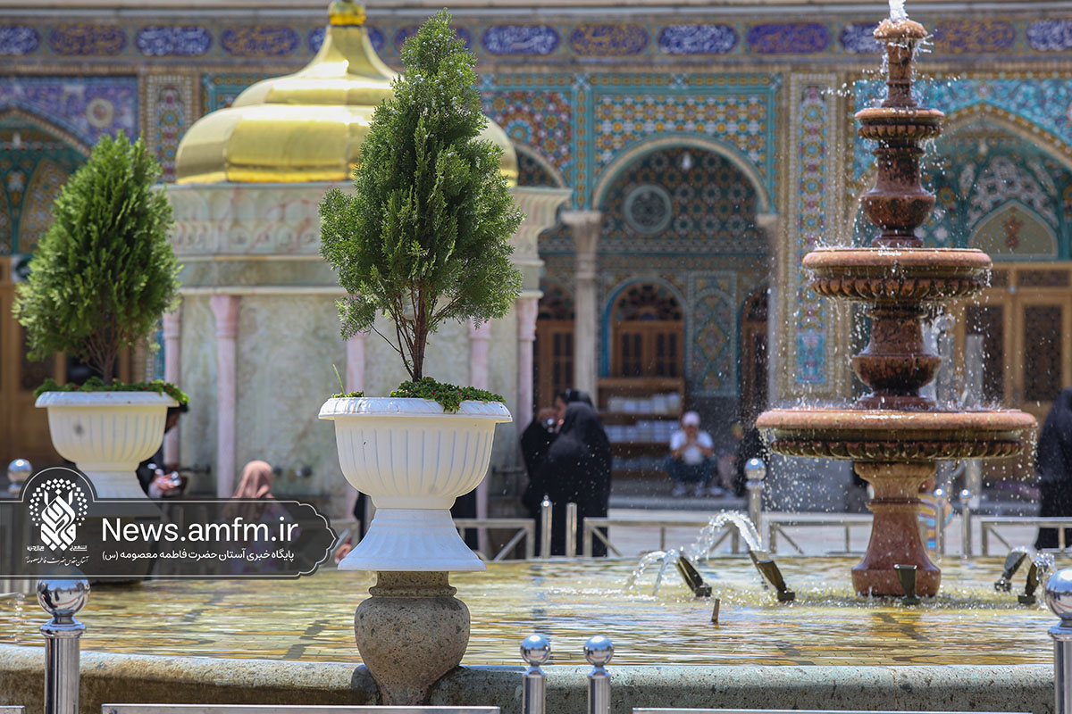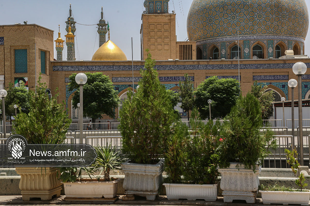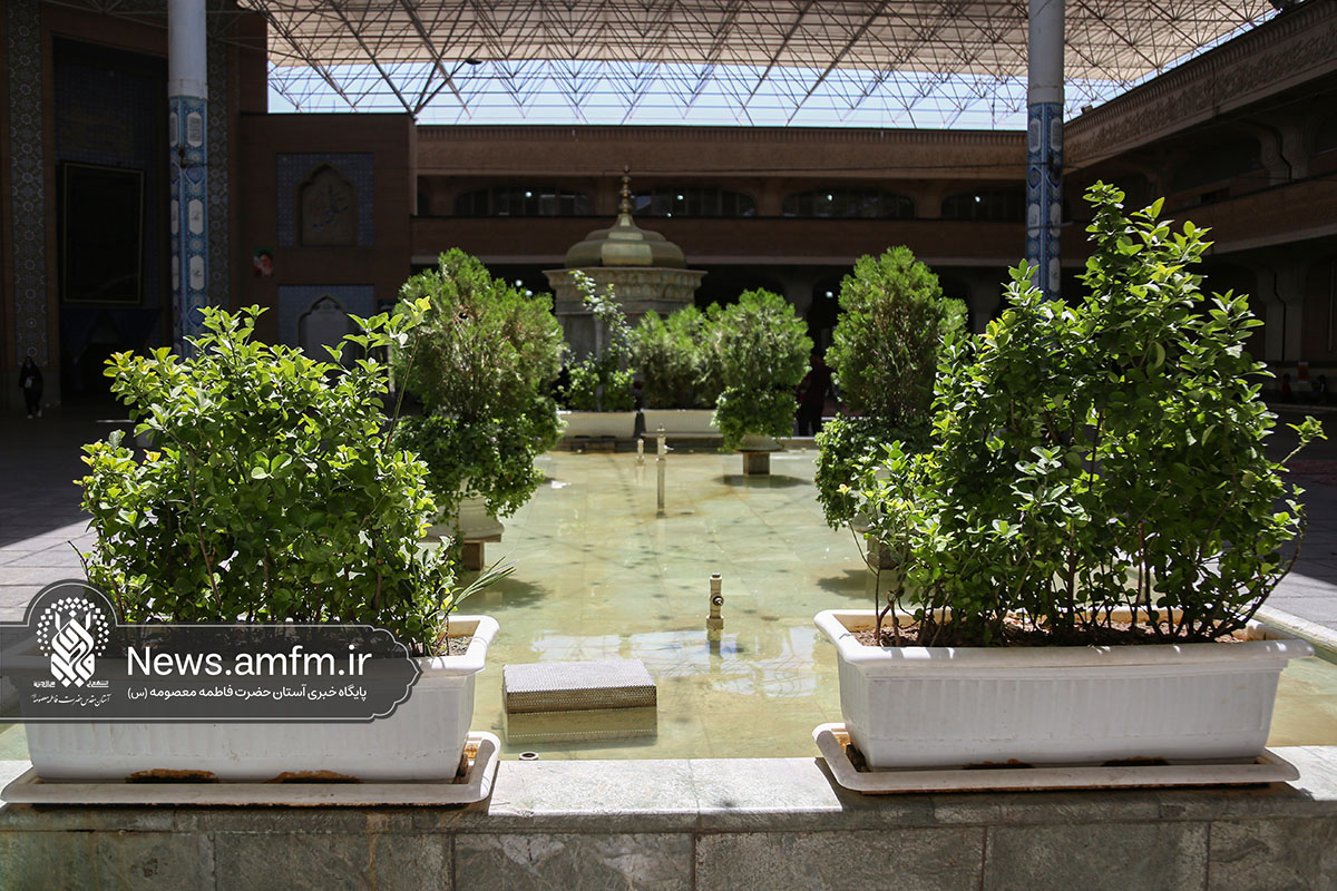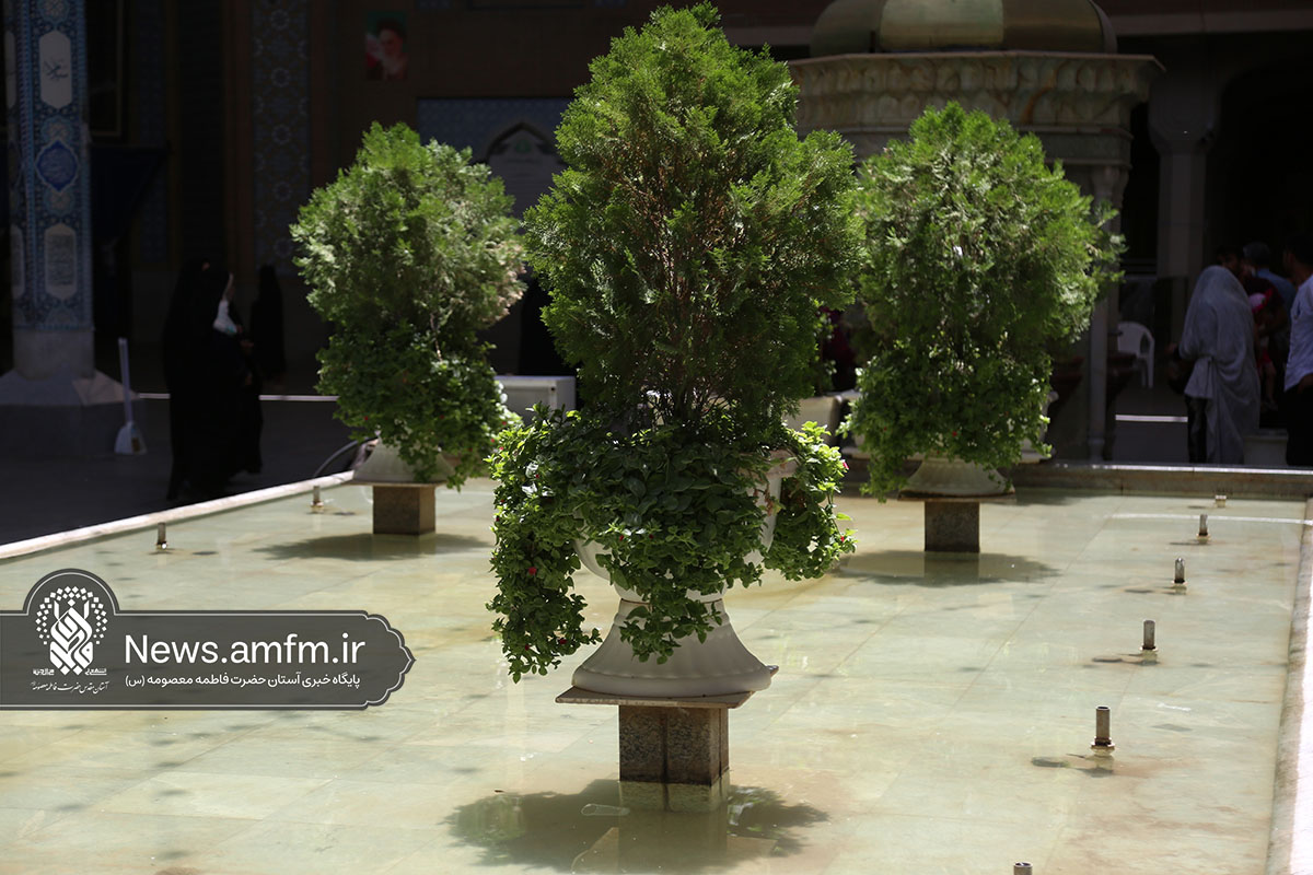 رئیس اداره خدمات اماکن حرم مطهر بانوی کرامت با بیان اینکه ۱۰ قطعه چمن در فضای صحن جواد الائمه علیه السلام وجود دارد، افزود: در داخل حرم مطهر حضرت معصومه سلام الله علیها ۱۱۰ اصله درخت کاشته شده است که از این تعداد ۷۰ اصله درخت مثمر از انواع انار، زیتون تلخ، زیتون شیرین، انجیر، توت، انگور، سنجد، زردآلو، شلیل و سیب و ۴۰ اصله درخت غیر مثمر از انواع نارون، کاج و سرو است.