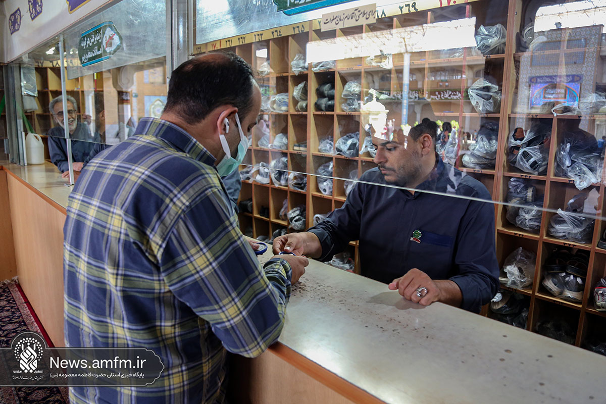 در حرم مطهر بانوی کرامت ۱۵ پیشخوان کفشداری مخصوص آقایان و خانوادگی و ۶ پیشخوان مخصوص بانوان وجود دارد که کفشداری های آقایان و خانوادگی توسط ۸۵۰ خادم آقا و کفشداری های مخصوص خواهران توسط ۳۷۷ خادم خواهر خدمت رسانی می کنند.