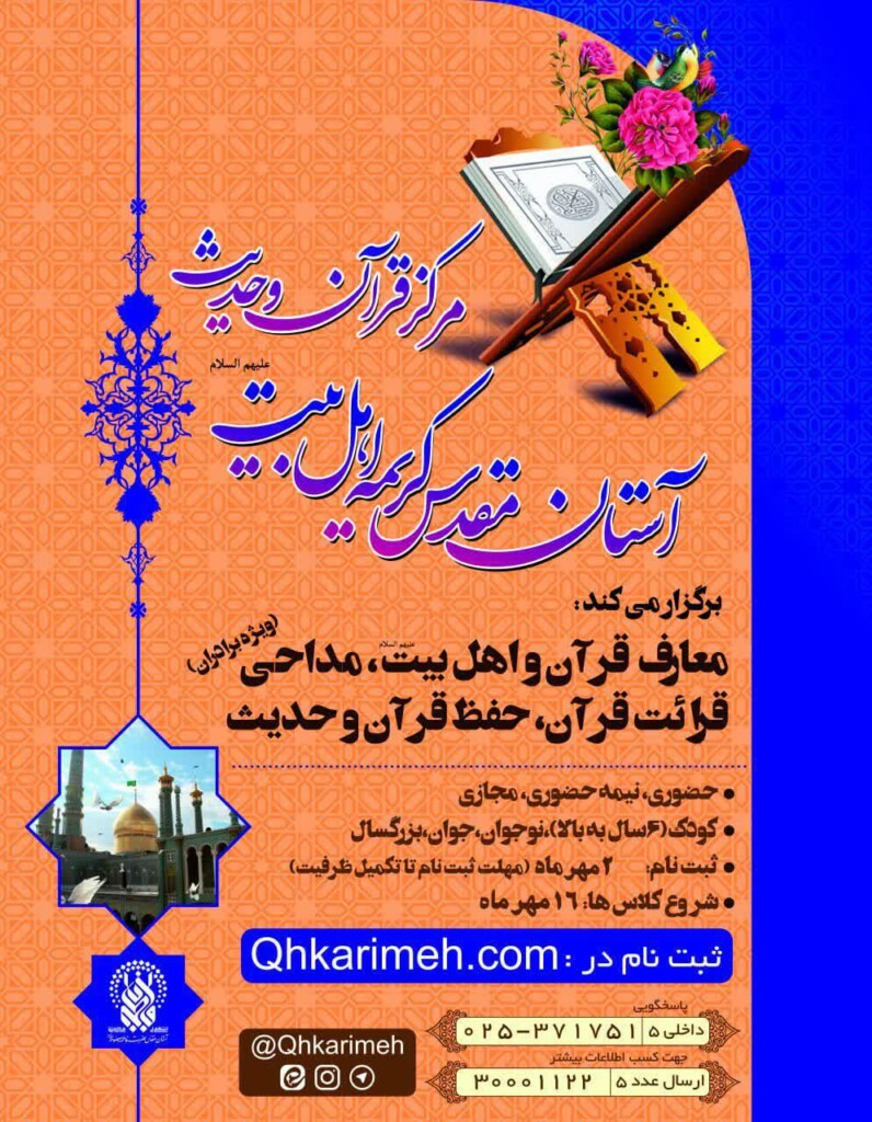 علاقمندان به آموزشهای قرآنی و معارفی با مراجعه به سایت مرکز قرآن و حدیث به آدرس Qhkarimeh.com می توانند به صورت حضوری، نیمه حضوری و مجازی در کلاسهای ترم پاییز این مرکز ثبت نام کنند.