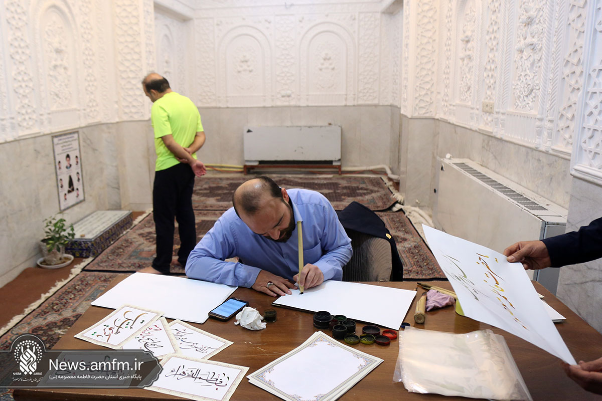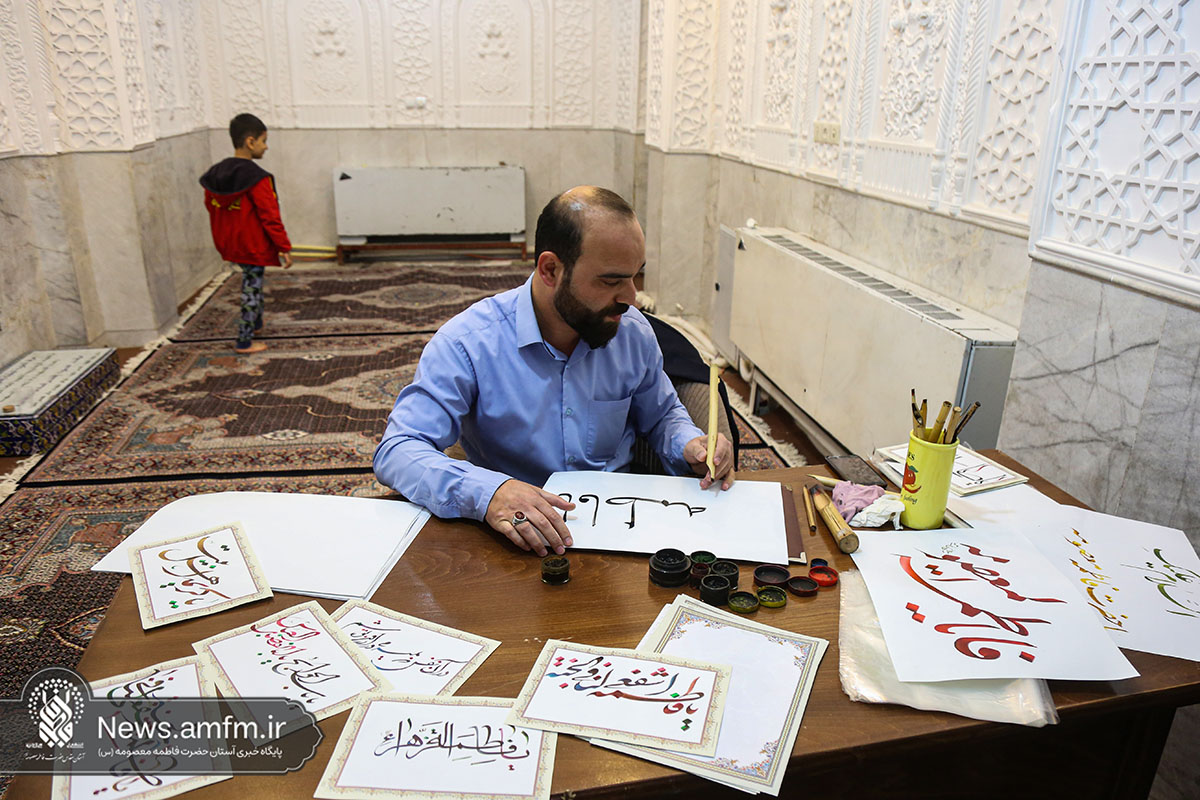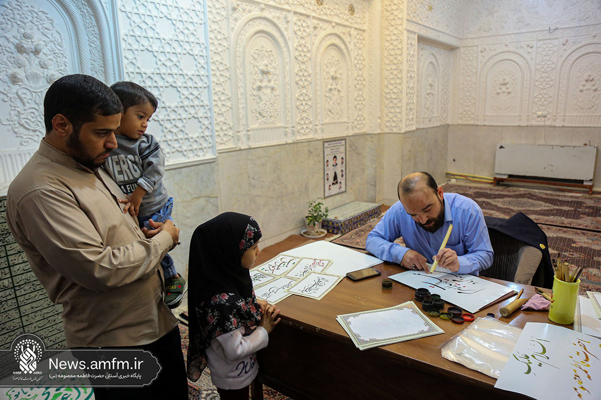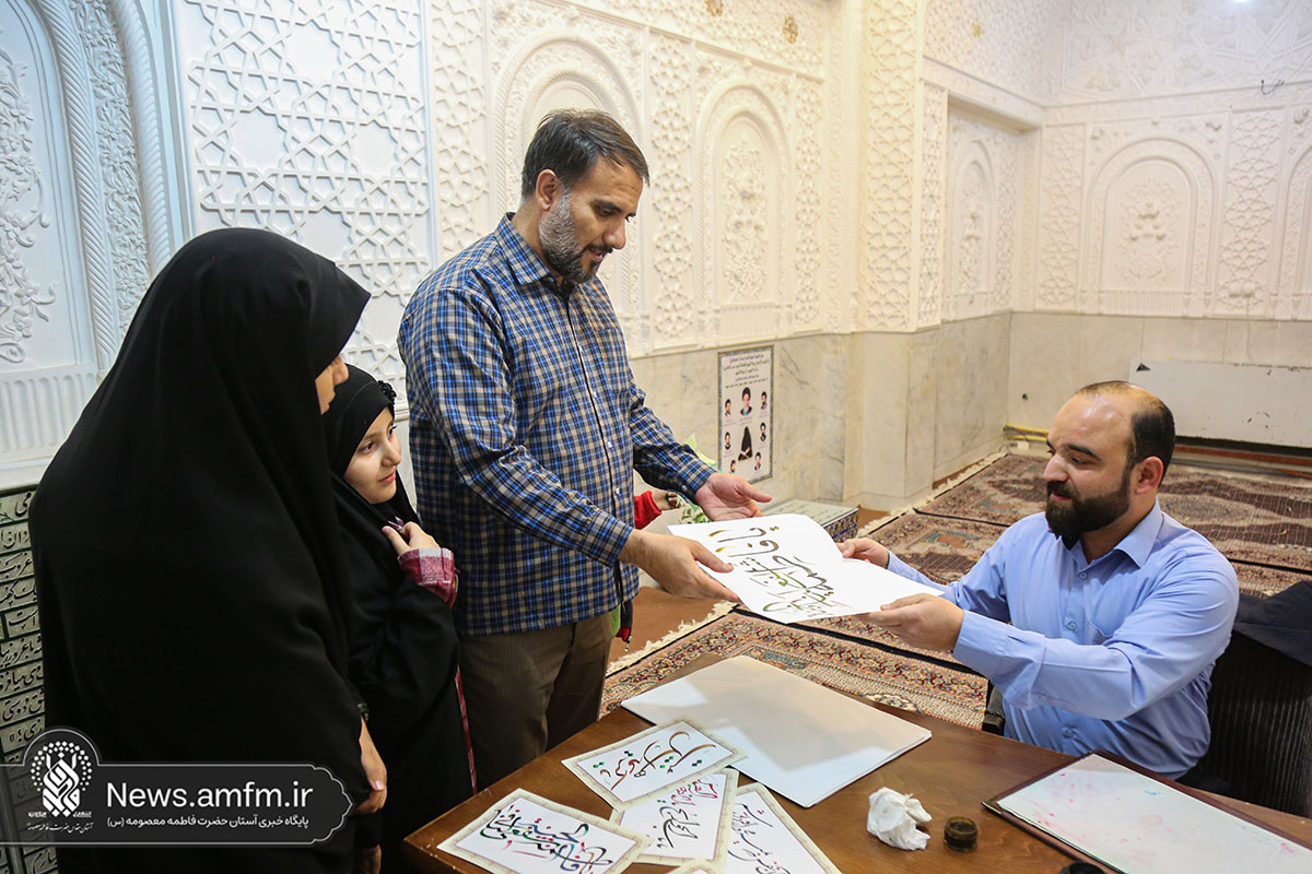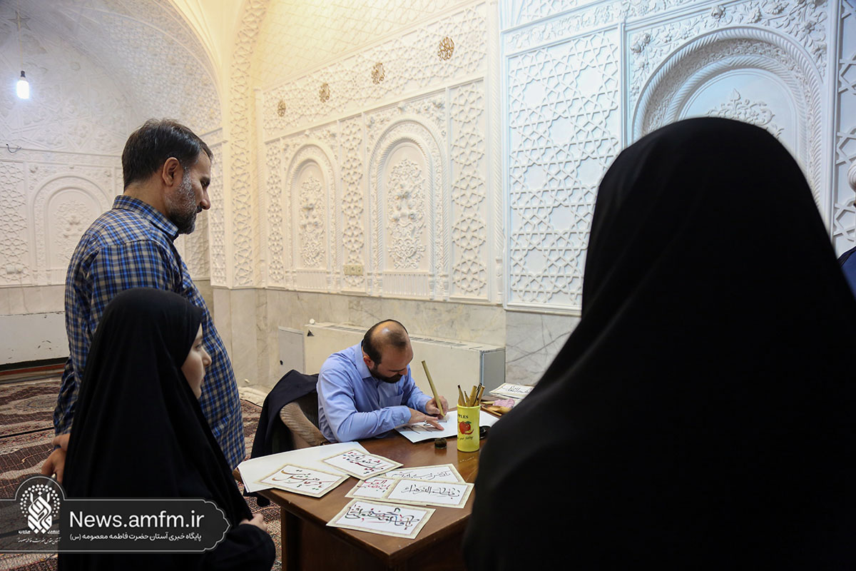 گفتنی است در این میز خوشنویسی اسامی و القاب حضرت معصومه سلام الله علیها و سایر اهل بیت عصمت و طهارت(ع) به سفارش زائران برای آنها نوشته و به آنها تقدیم می شود.