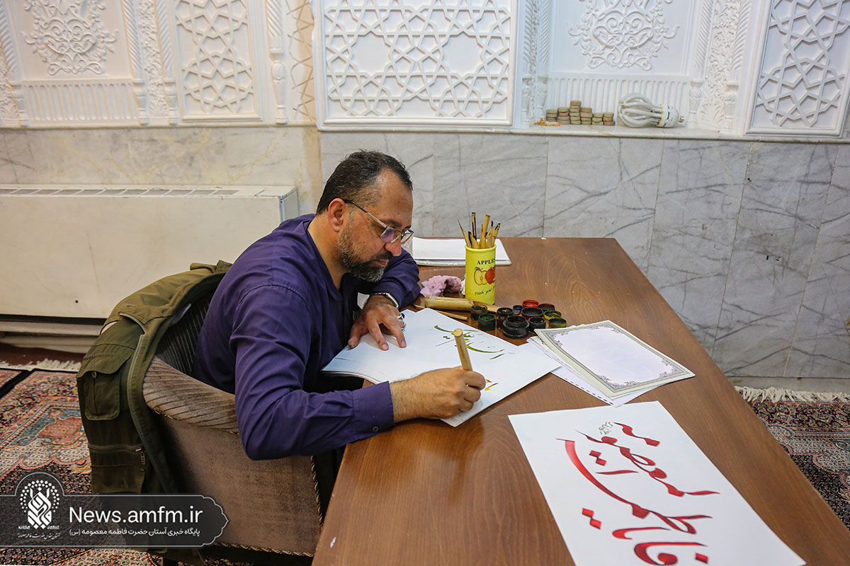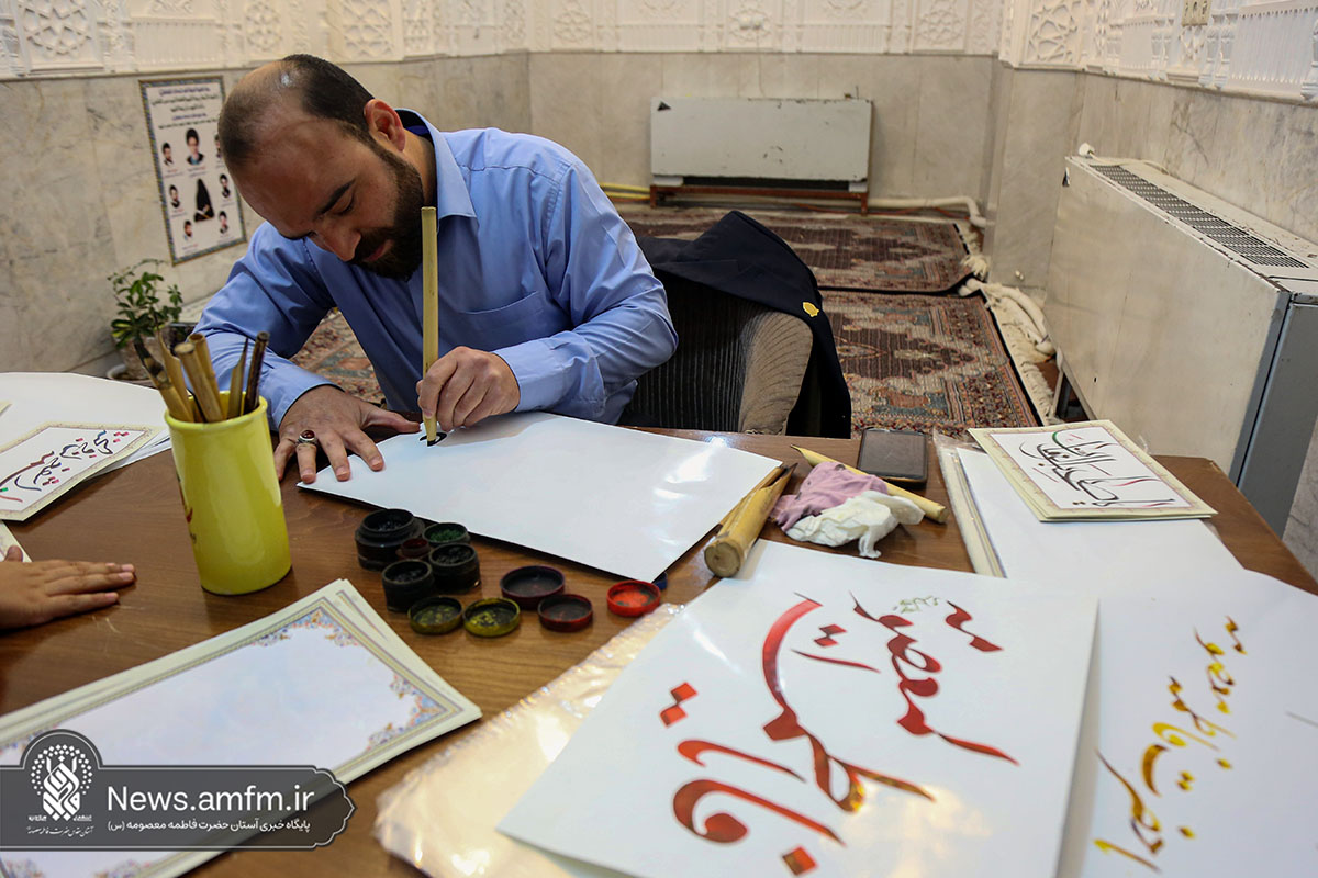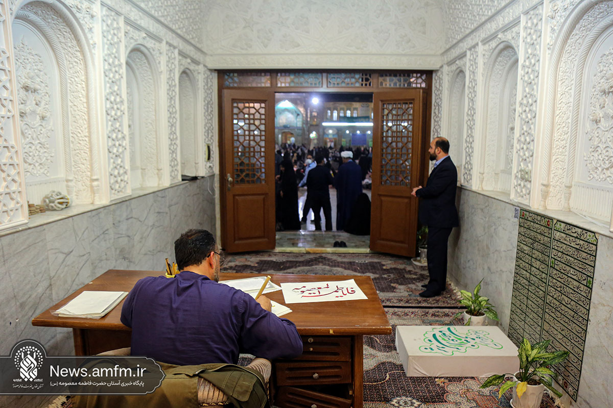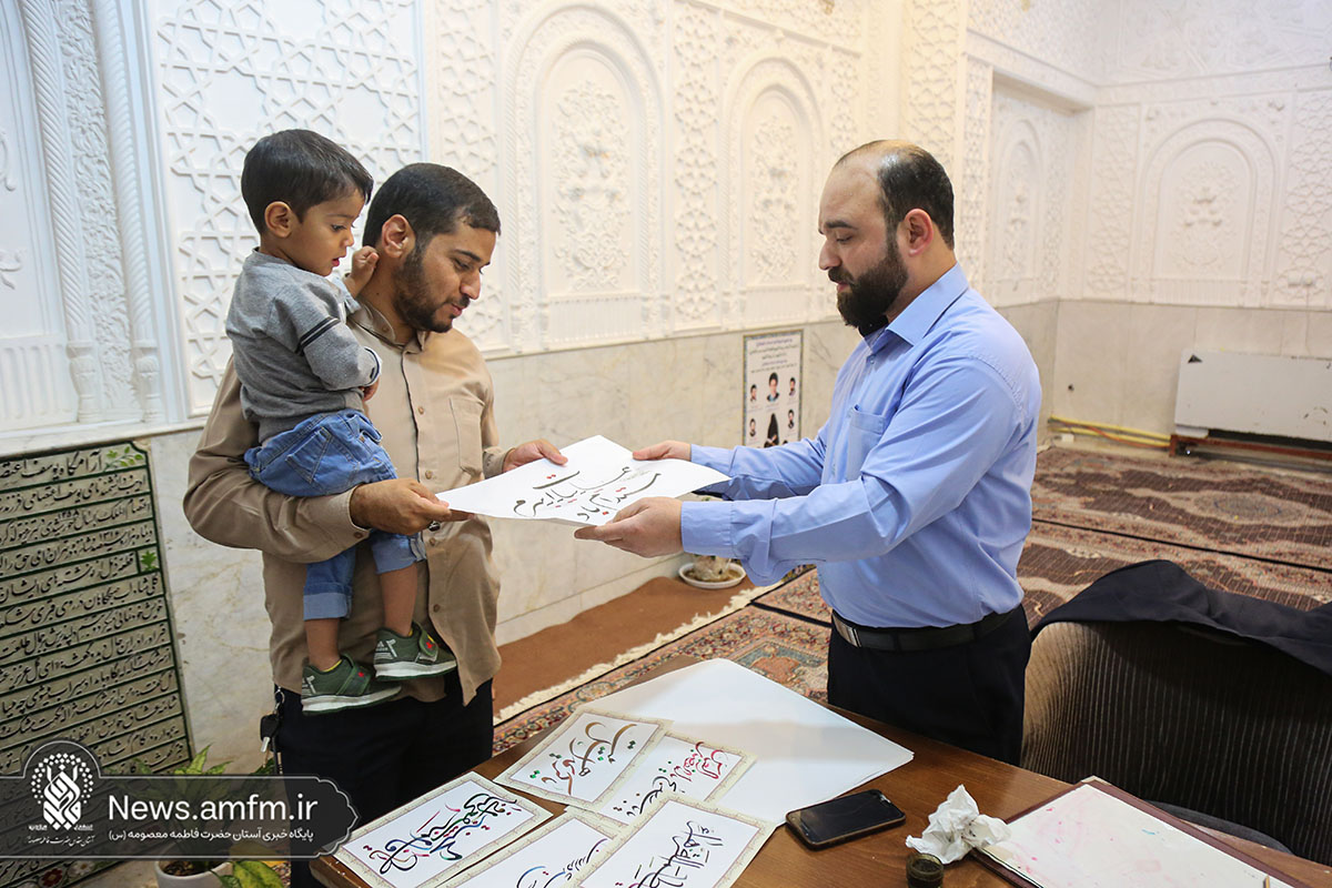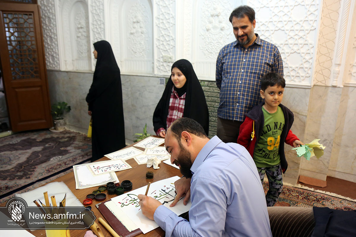 گفتنی است در این میز خوشنویسی اسامی و القاب حضرت معصومه سلام الله علیها و سایر اهل بیت عصمت و طهارت(ع) به سفارش زائران برای آنها نوشته و به آنها تقدیم می شود.
