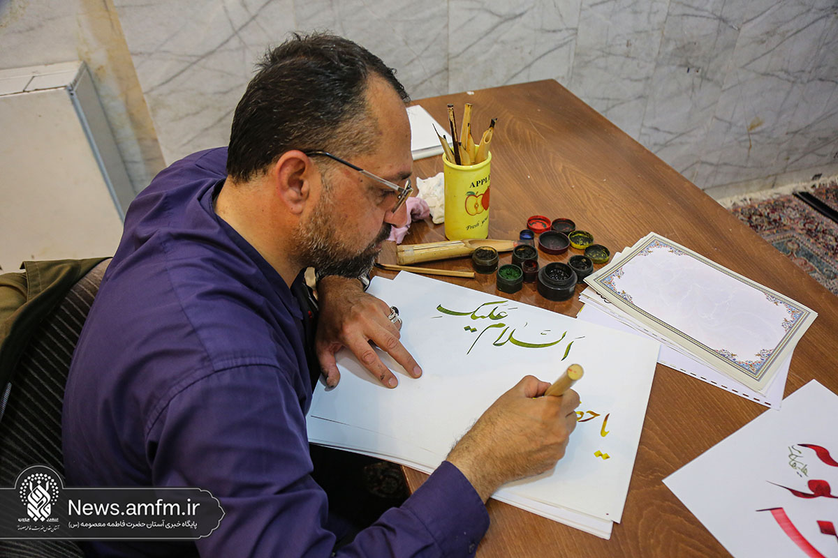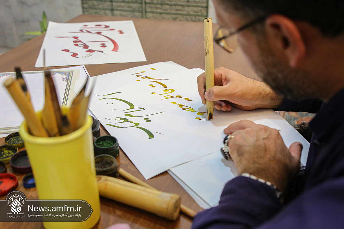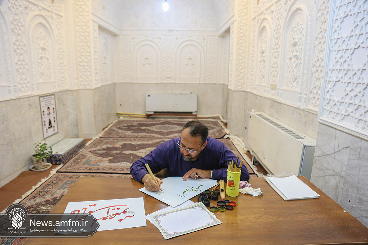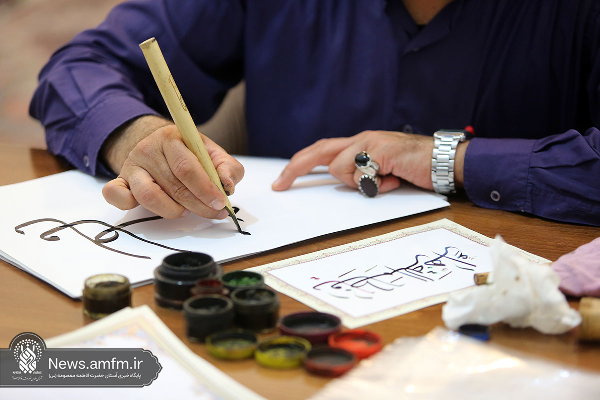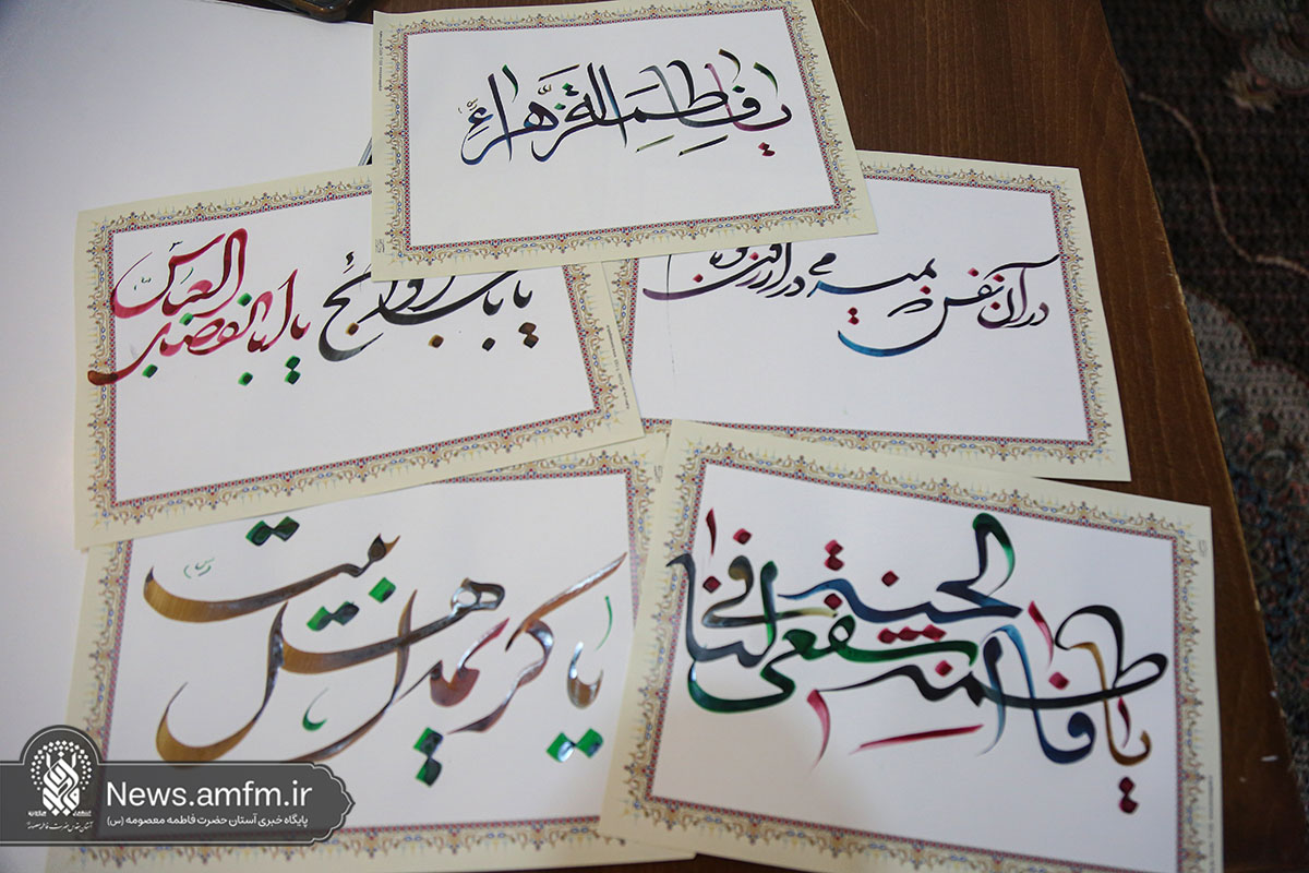 گفتنی است در این میز خوشنویسی اسامی و القاب حضرت معصومه سلام الله علیها و سایر اهل بیت عصمت و طهارت(ع) به سفارش زائران برای آنها نوشته و به آنها تقدیم می شود.