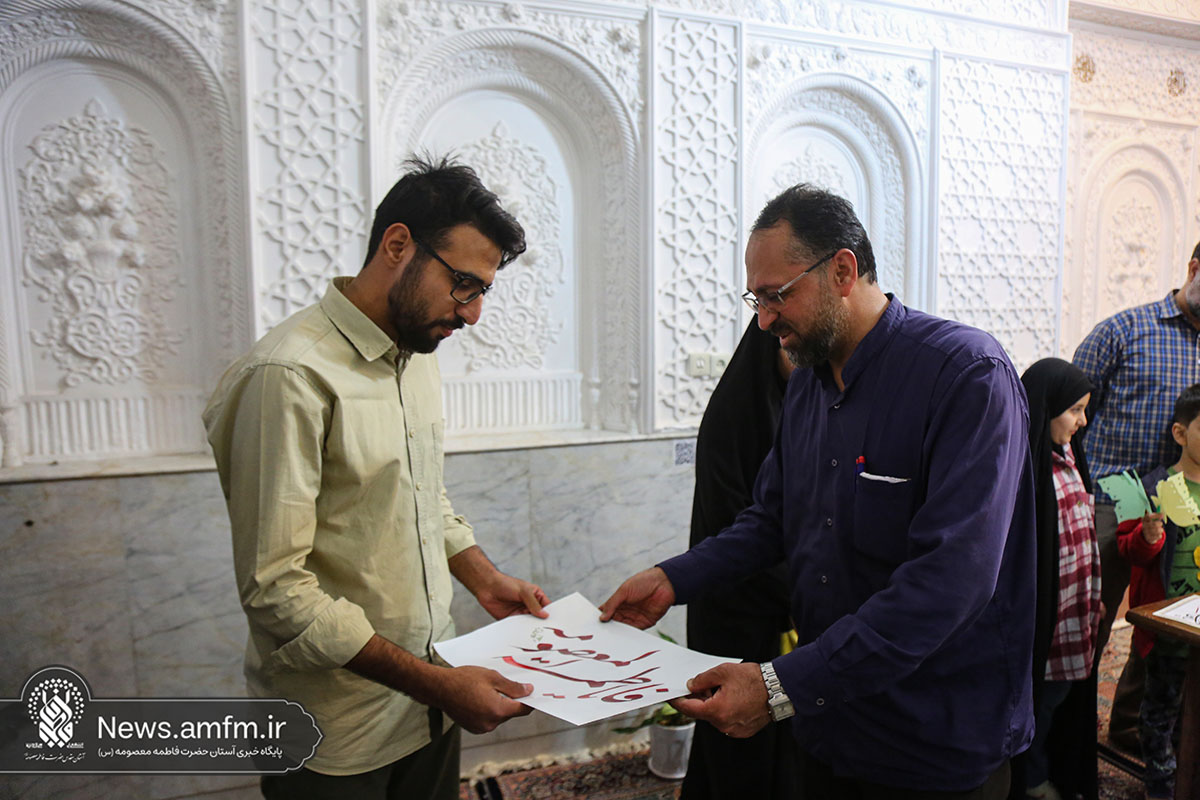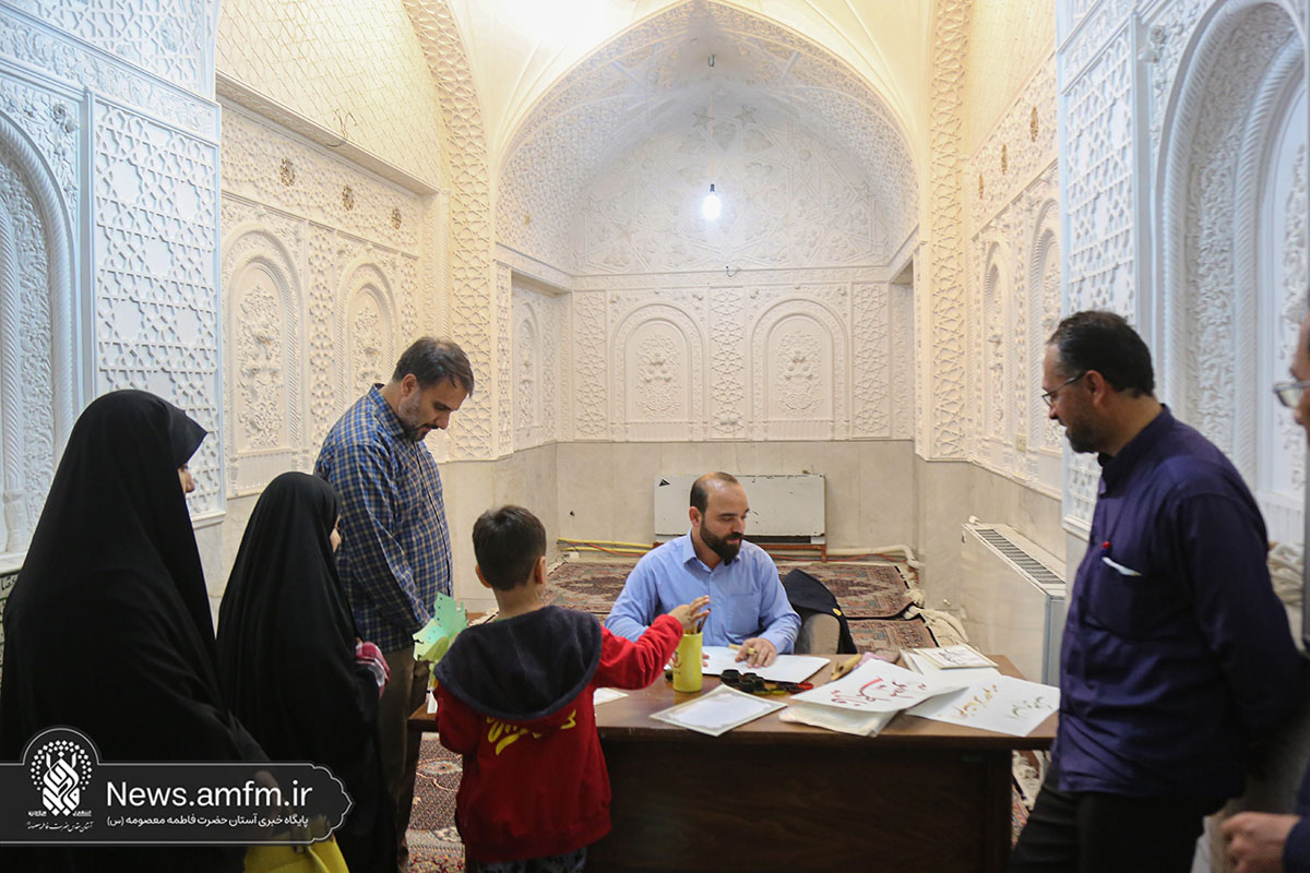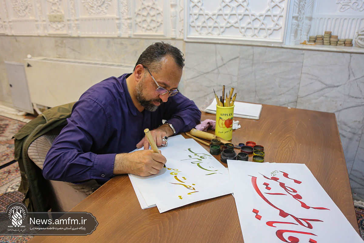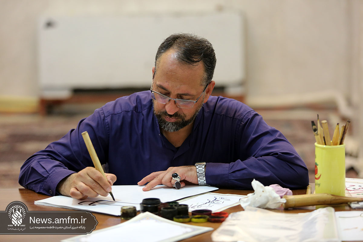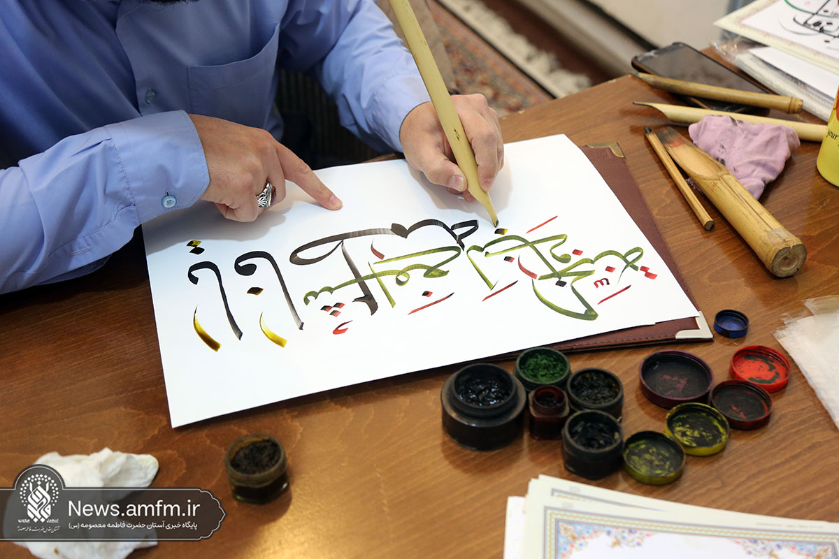 گفتنی است در این میز خوشنویسی اسامی و القاب حضرت معصومه سلام الله علیها و سایر اهل بیت عصمت و طهارت(ع) به سفارش زائران برای آنها نوشته و به آنها تقدیم می شود.