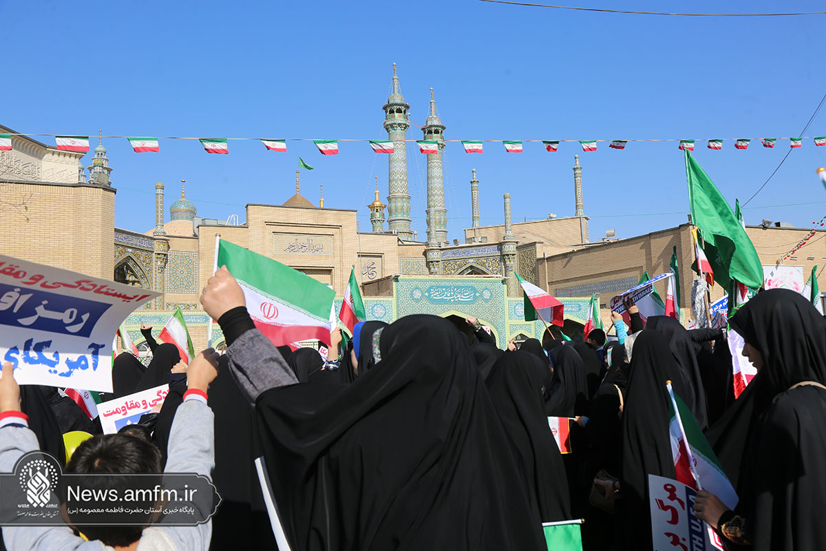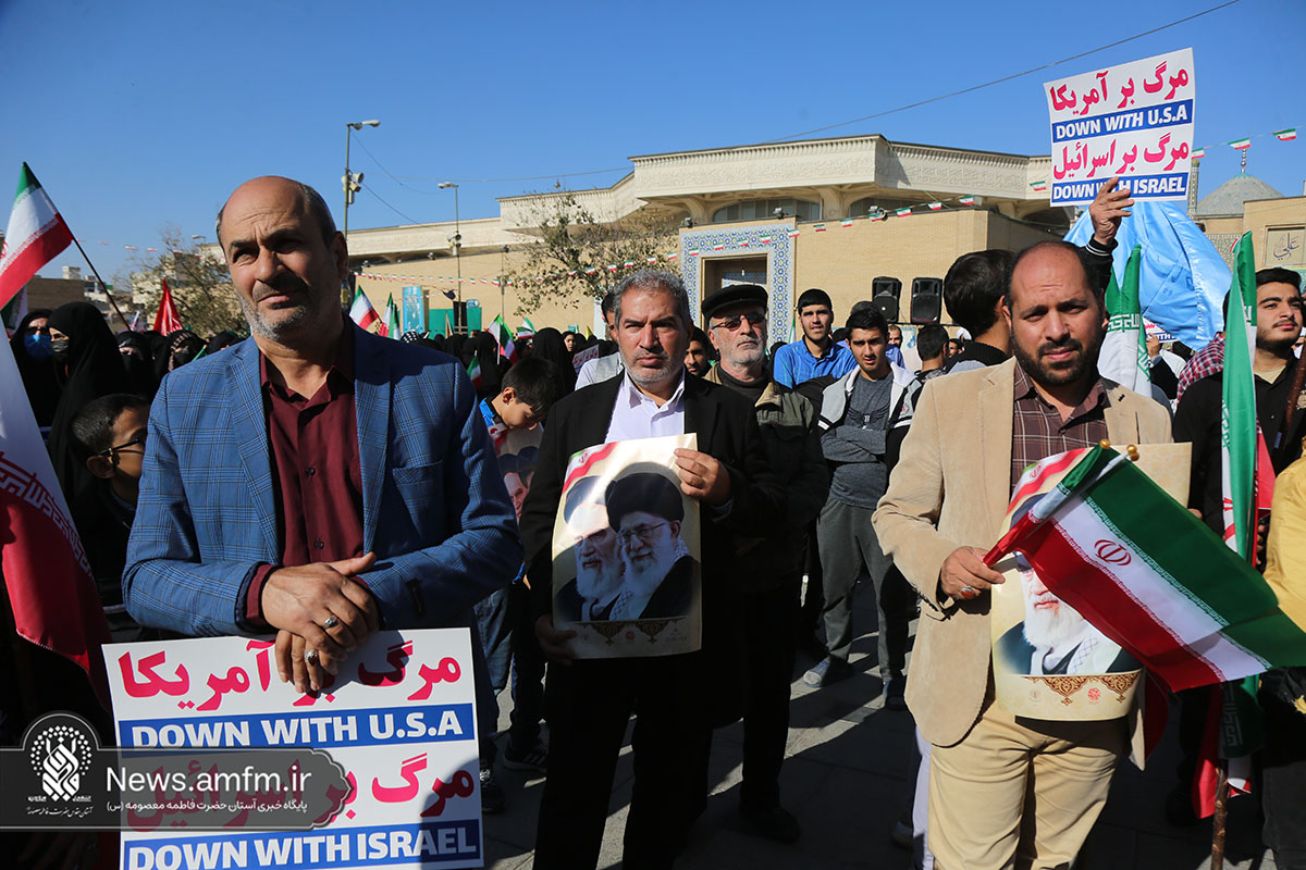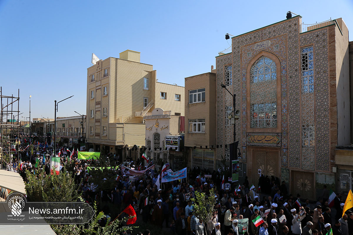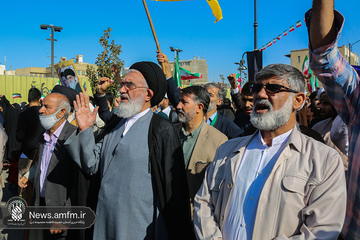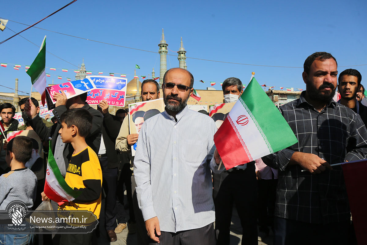 مراسم یوم الله ۱۳ آبان، همزمان با سراسر کشور در قم برگزار شد و مردم قم از حرم حضرت فاطمه معصومه سلامالله علیها به سمت مصلی قدس حرکت کرده و با شعارهایی علاوه بر انزجار از آمریکا، اسرائیل و دیگر حامیان آنان، ترور وحشیانه حرم حضرت شاهچراغ(ع) را هم محکوم کردند.