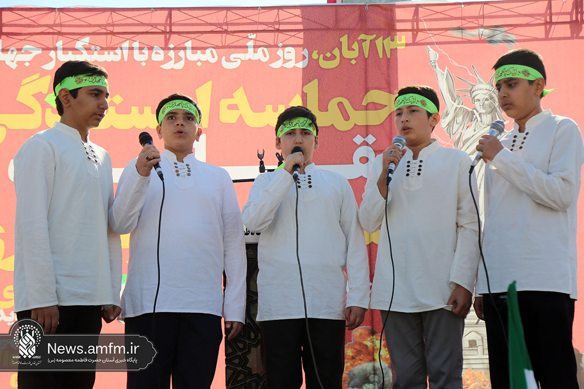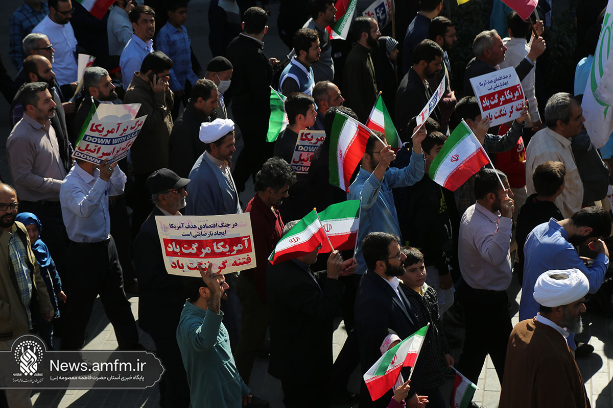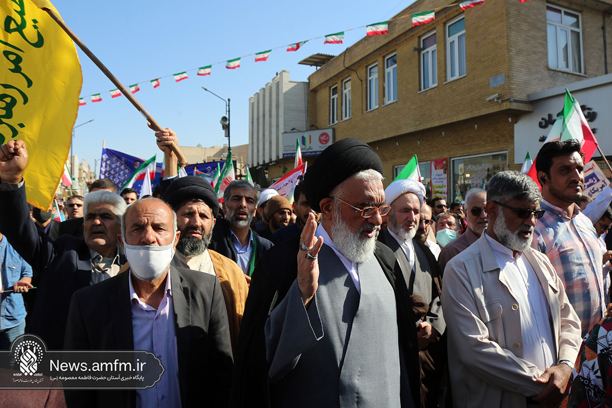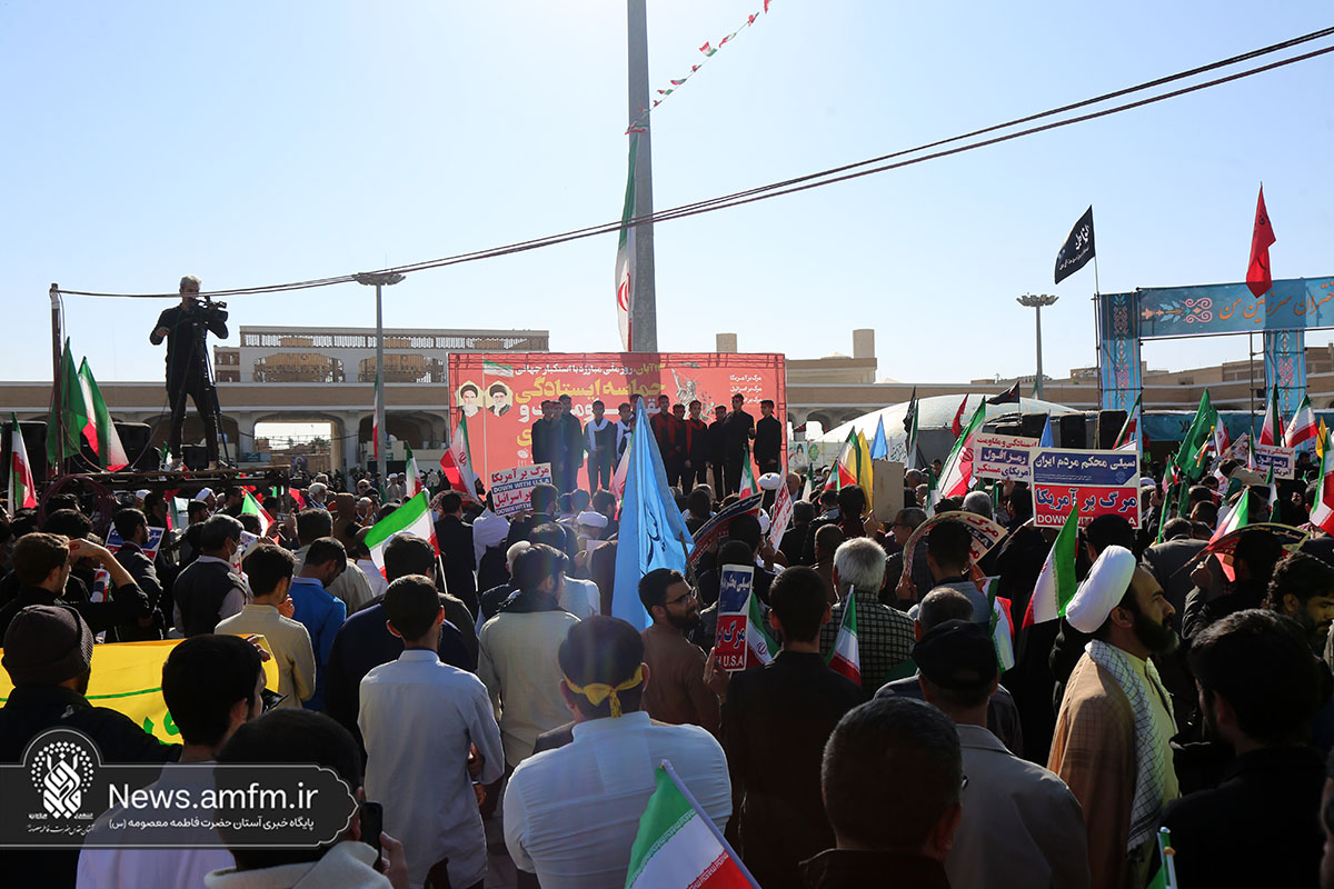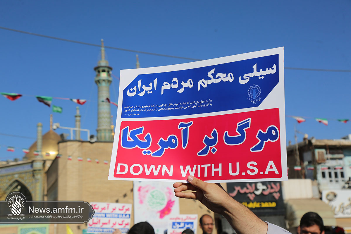 مراسم یوم الله ۱۳ آبان، همزمان با سراسر کشور در قم برگزار شد و مردم قم از حرم حضرت فاطمه معصومه سلامالله علیها به سمت مصلی قدس حرکت کرده و با شعارهایی علاوه بر انزجار از آمریکا، اسرائیل و دیگر حامیان آنان، ترور وحشیانه حرم حضرت شاهچراغ(ع) را هم محکوم کردند.