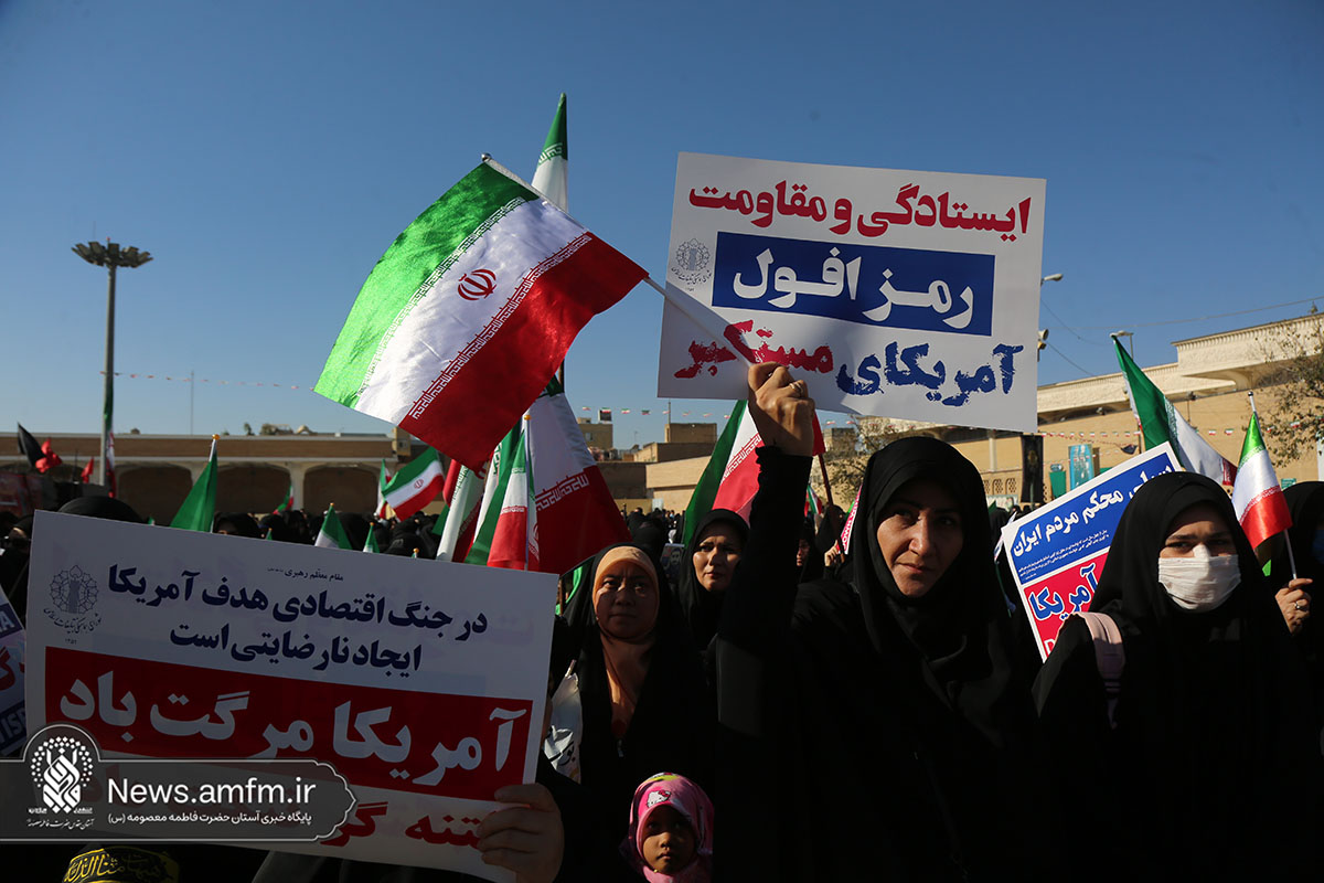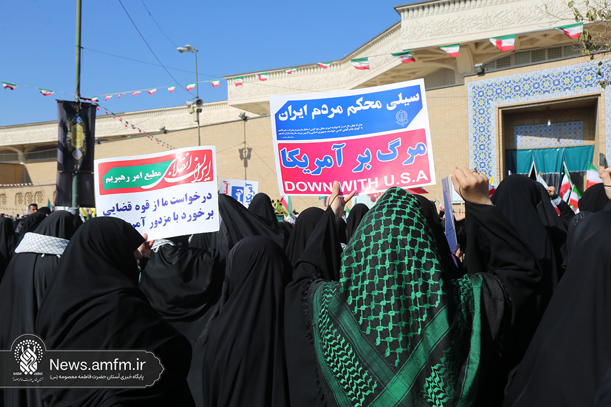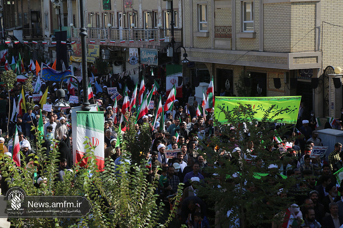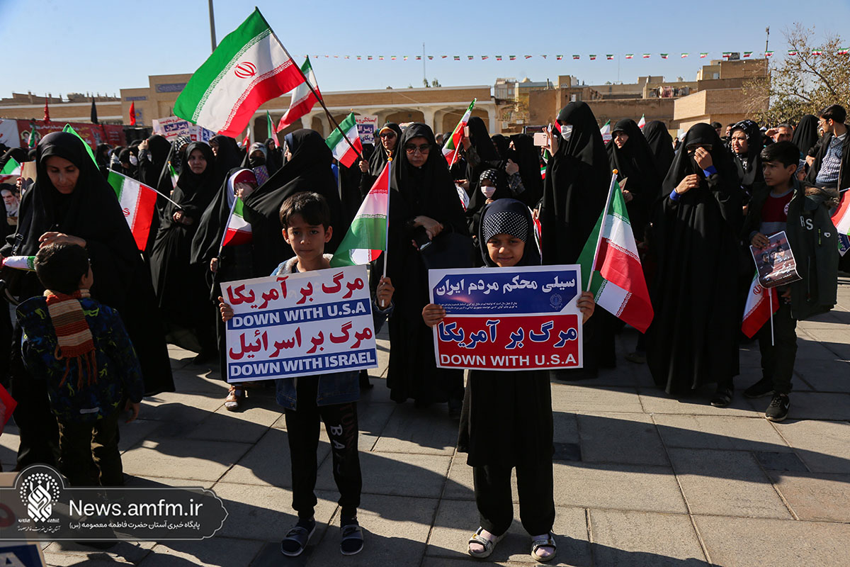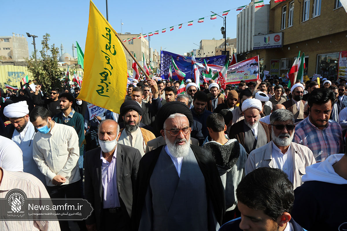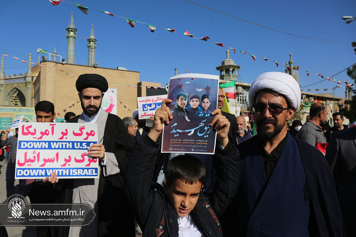 مراسم یوم الله ۱۳ آبان، همزمان با سراسر کشور در قم برگزار شد و مردم قم از حرم حضرت فاطمه معصومه سلامالله علیها به سمت مصلی قدس حرکت کرده و با شعارهایی علاوه بر انزجار از آمریکا، اسرائیل و دیگر حامیان آنان، ترور وحشیانه حرم حضرت شاهچراغ(ع) را هم محکوم کردند.