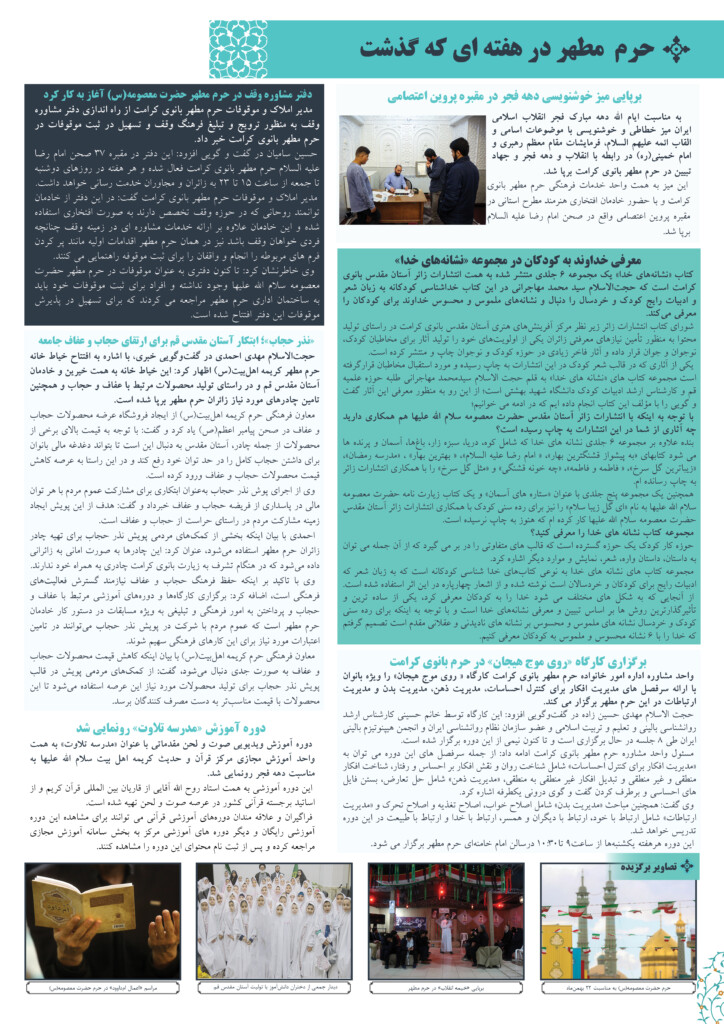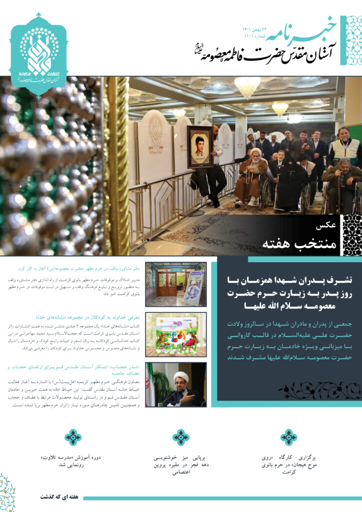 شماره دهم خبرنامه آستان مقدس حضرت فاطمه معصومه سلام الله علیها، ارائه کننده مهم ترین رویدادهای حرم مطهر در هفته گذشته، در نسخه الکترونیکی منتشر شد.