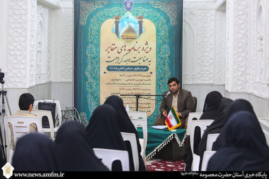 مقبره پروین اعتصامی واقع در صحن امام رضا علیه السلام حرم مطهر بانوی کرامت در سال گذشته در ۱۰۰ ساعت فعالیت میزبان محافل شعر مختلف و حضور هنرمندان زیادی بوده است که در مجموع ۳۸۰ نفر در این برنامه ها شرکت داشته اند.