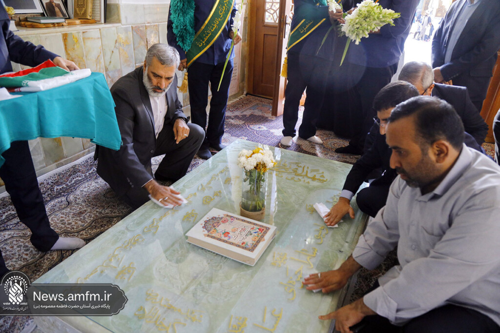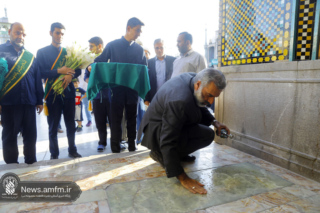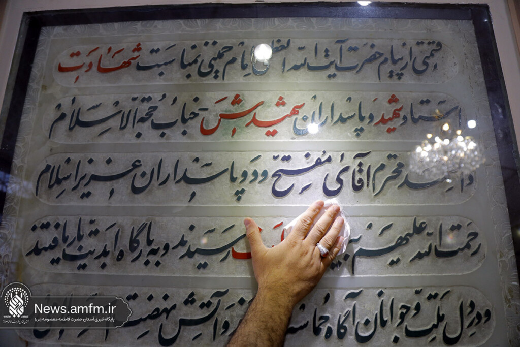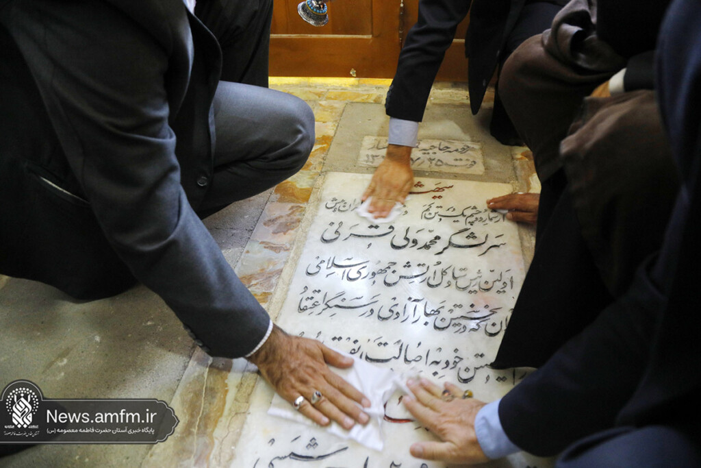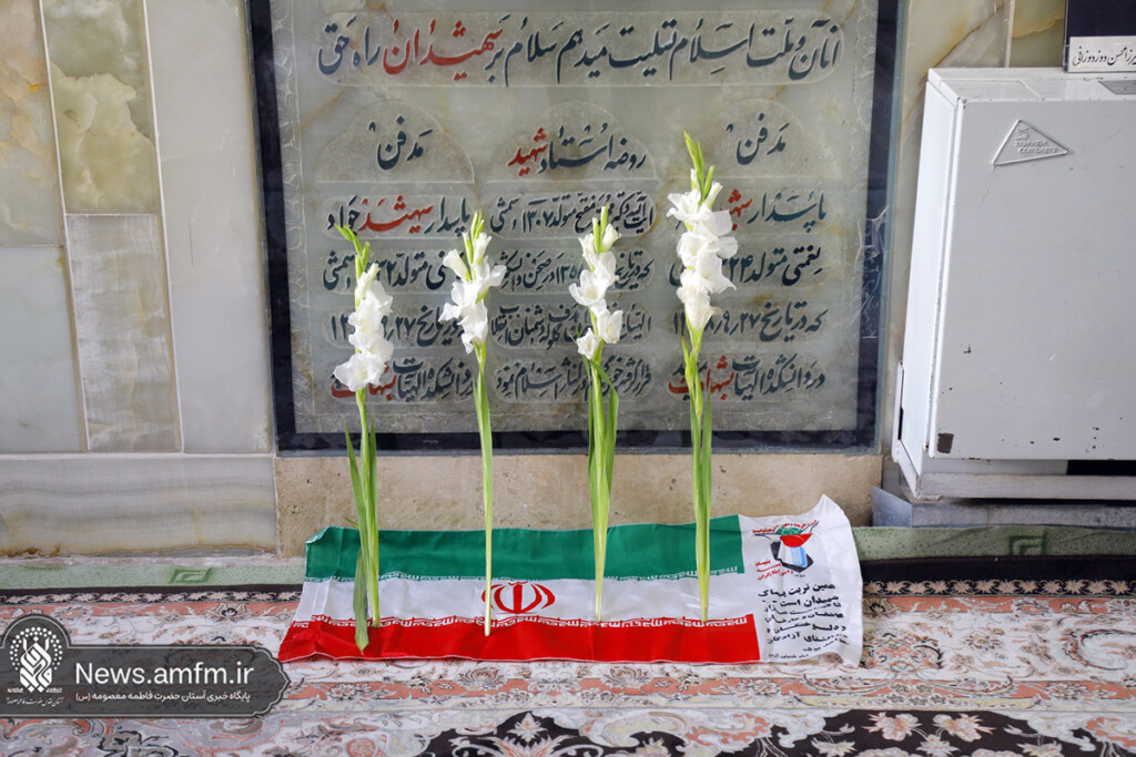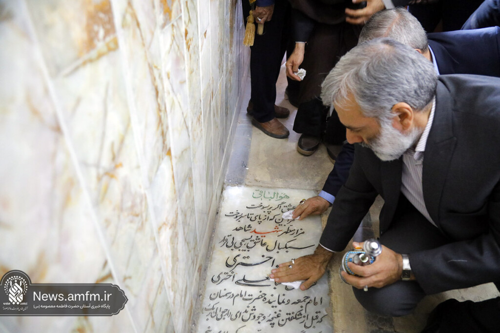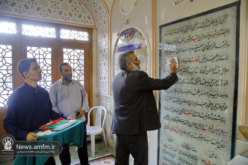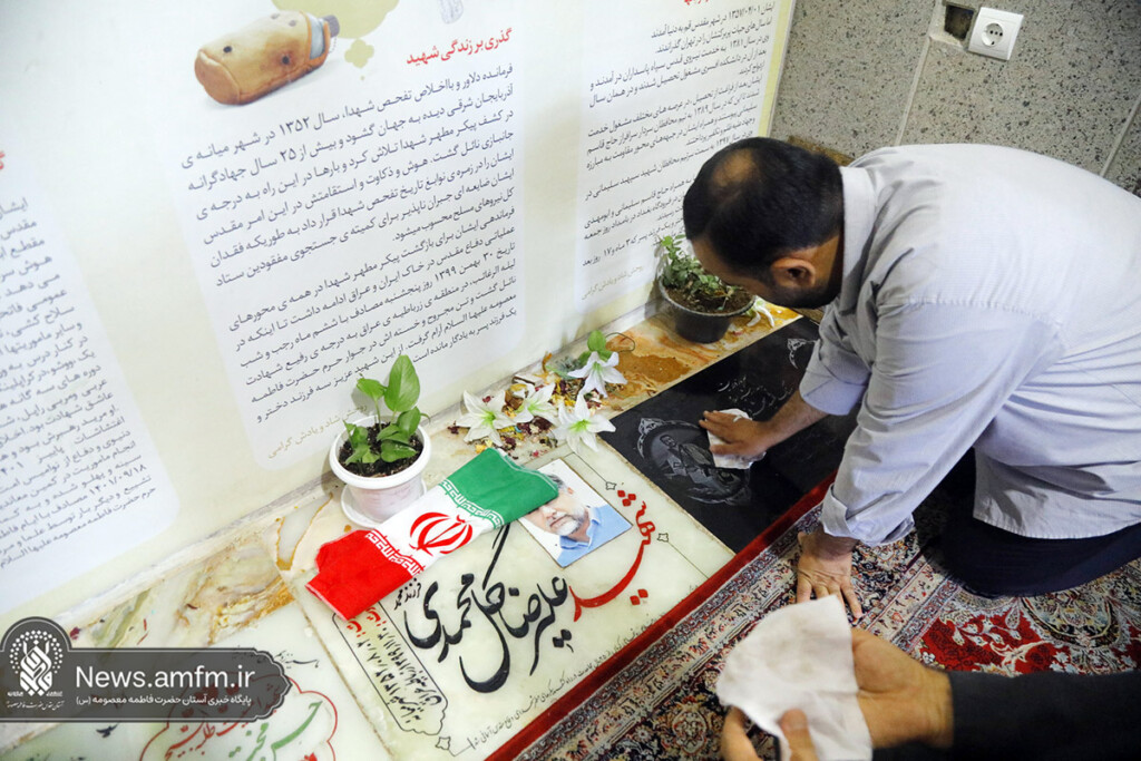خدام حرم حضرت معصومه سلام الله علیها همزمان با آیین غبارروبی مزار شهدا در سراسر کشور، قبور شهدای مدفون در حرم را عطرافشانی و غبارروبی کردند.