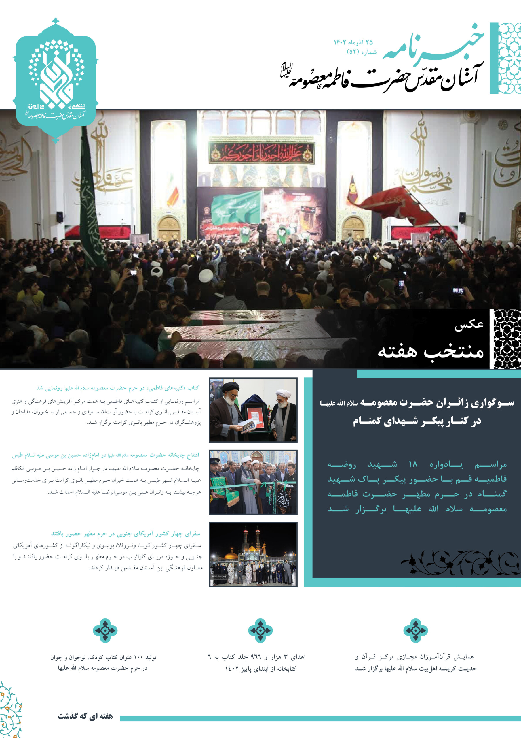 پنجاه و دومین شماره از خبرنامه دیجیتال آستان مقدس حضرت معصومه(س) برگرفته از اخبار مهم آستان مقدس در هفته گذشته، منتشر شد.