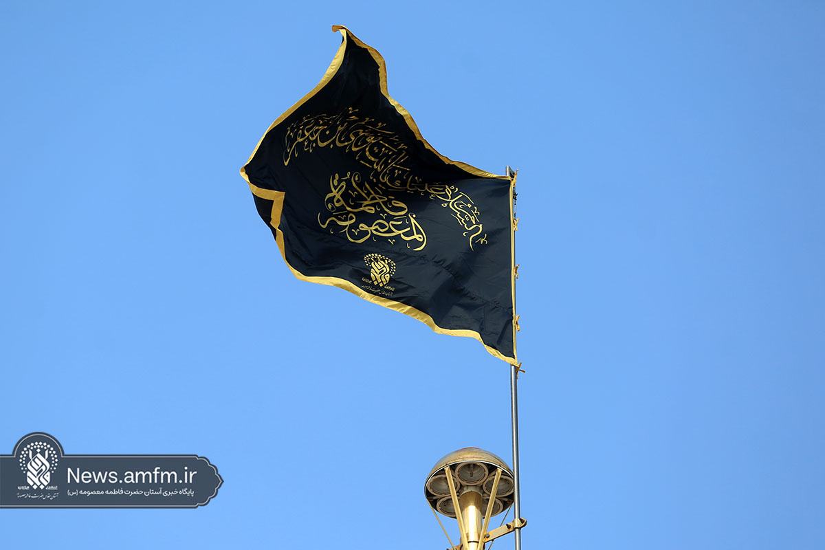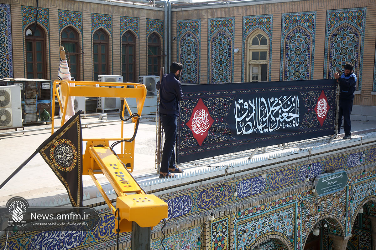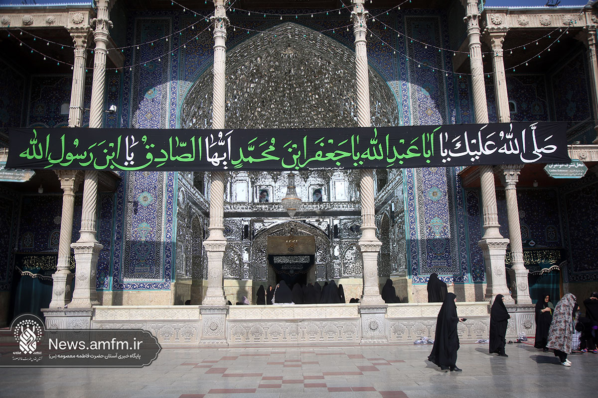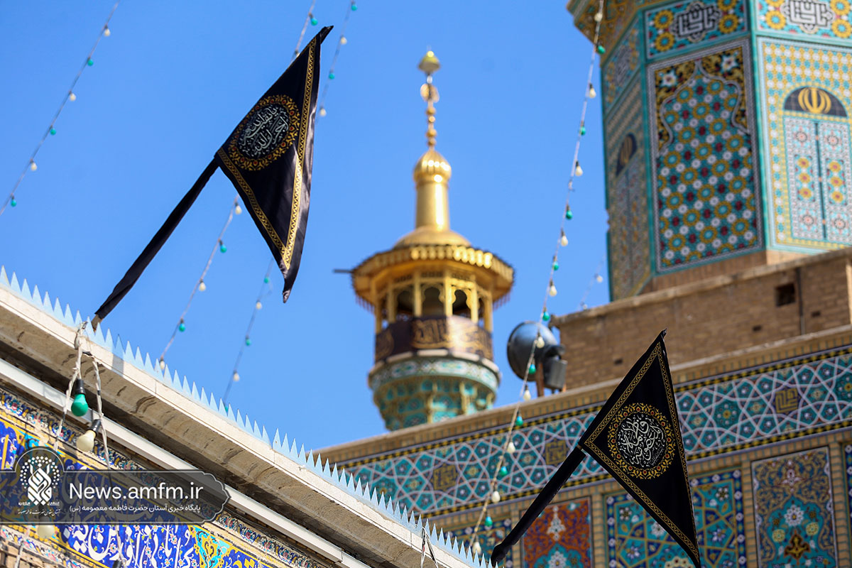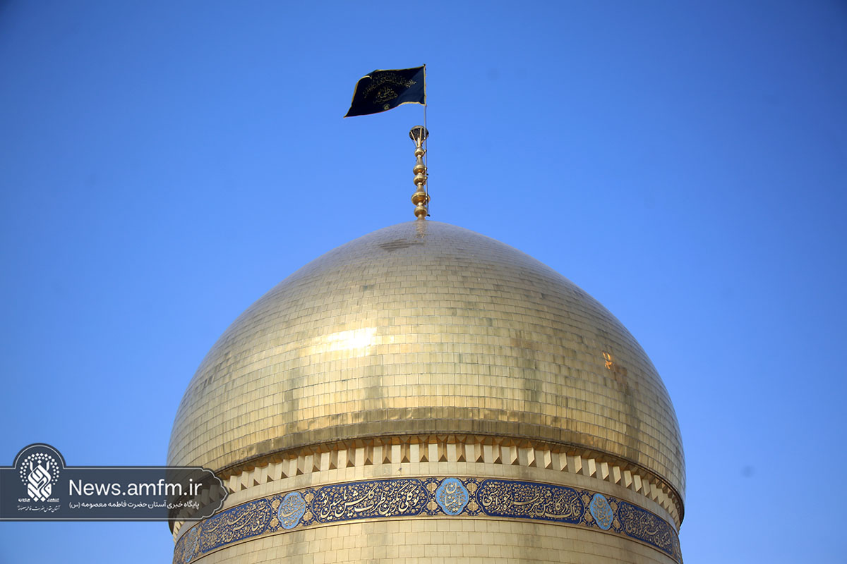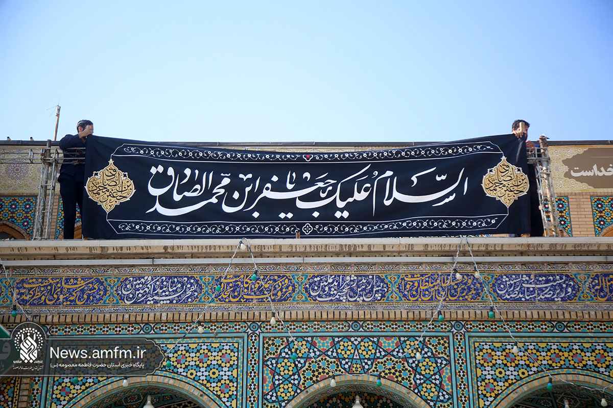 حرم مطهر حضرت فاطمه معصومه سلام الله علیها در آستانه سالروز شهادت امام صادق علیه السلام با اهتزاز پرچم عزا برفراز گنبد مطهر و نصب پرچم ها و بنرهای مشکی در صحن ها، رواق‌ها و شبستان‌ها سیاهپوش شد.