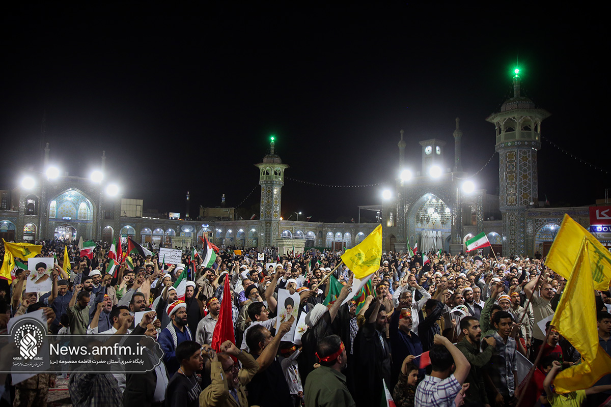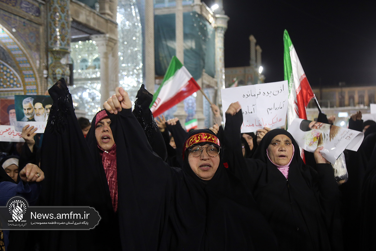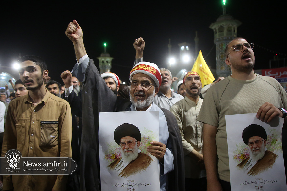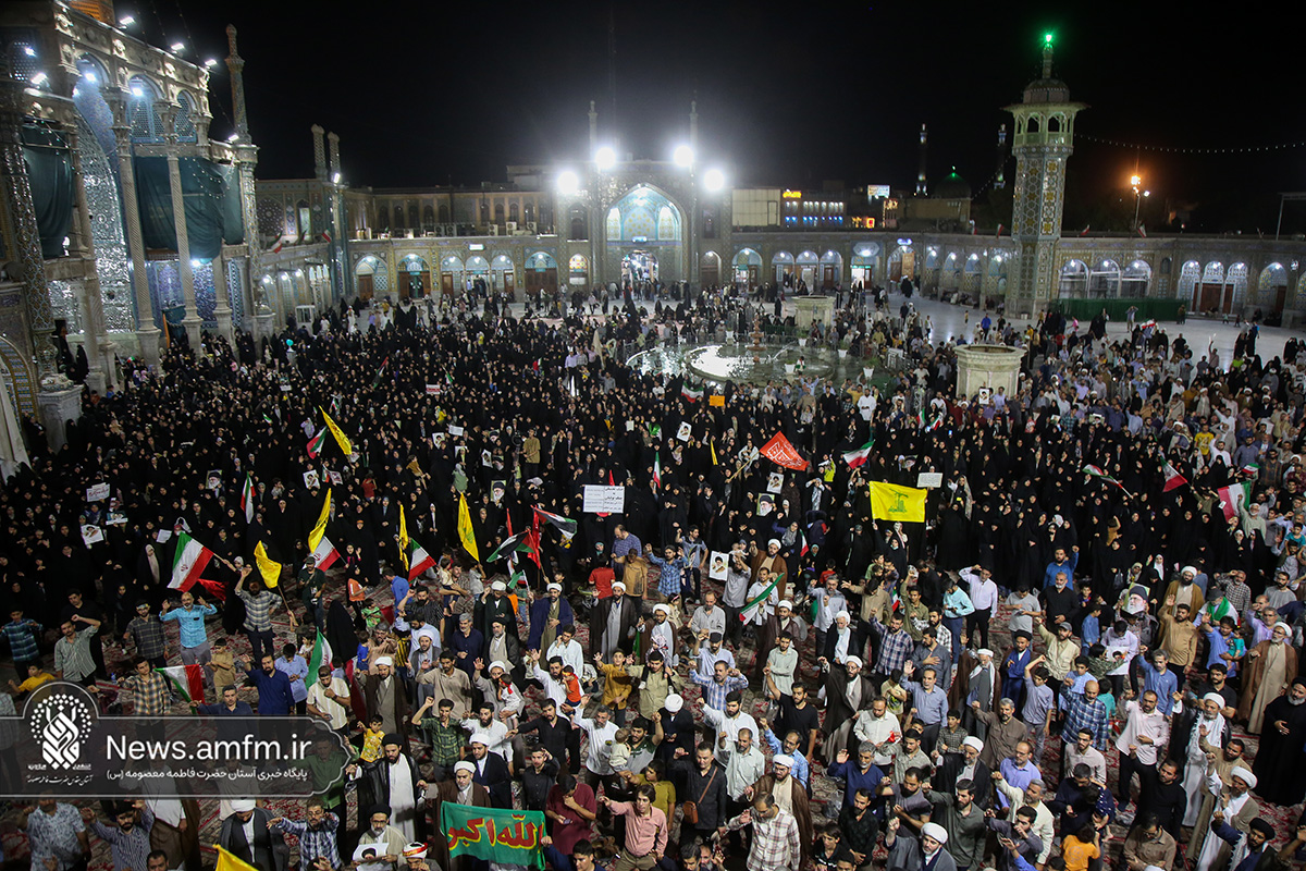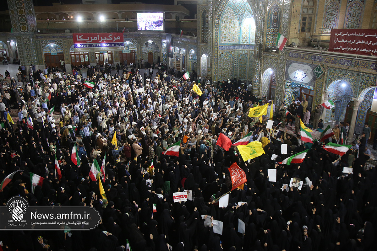 مردم متدین و انقلابی قم با حضور پرشور در حرم مطهر حضرت فاطمه معصومه سلام الله علیها ضمن اعلام انزجار از تجاوزات آمریکا و رژیم صهیونیستی به خاک کشور فریاد انتقام سر دادند.