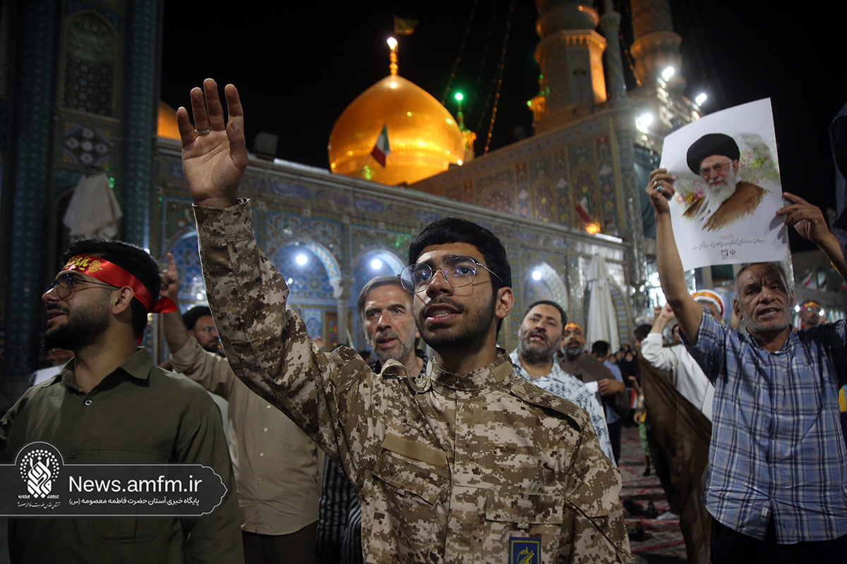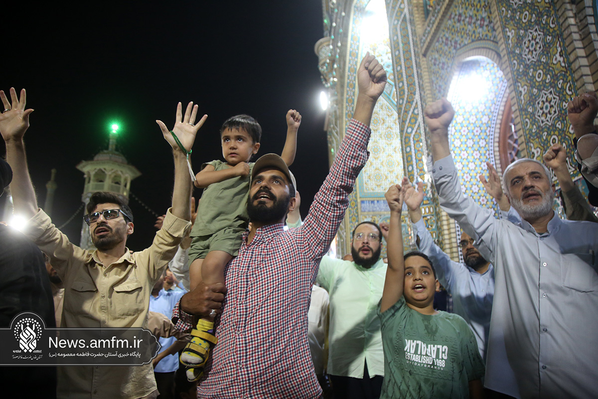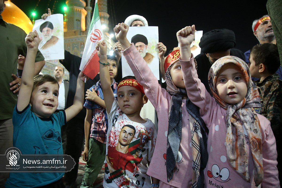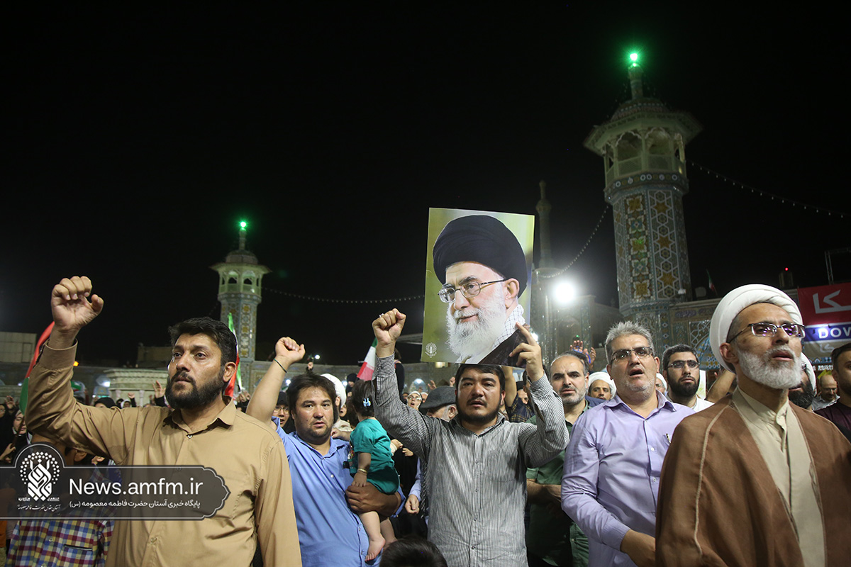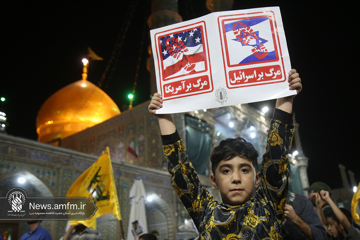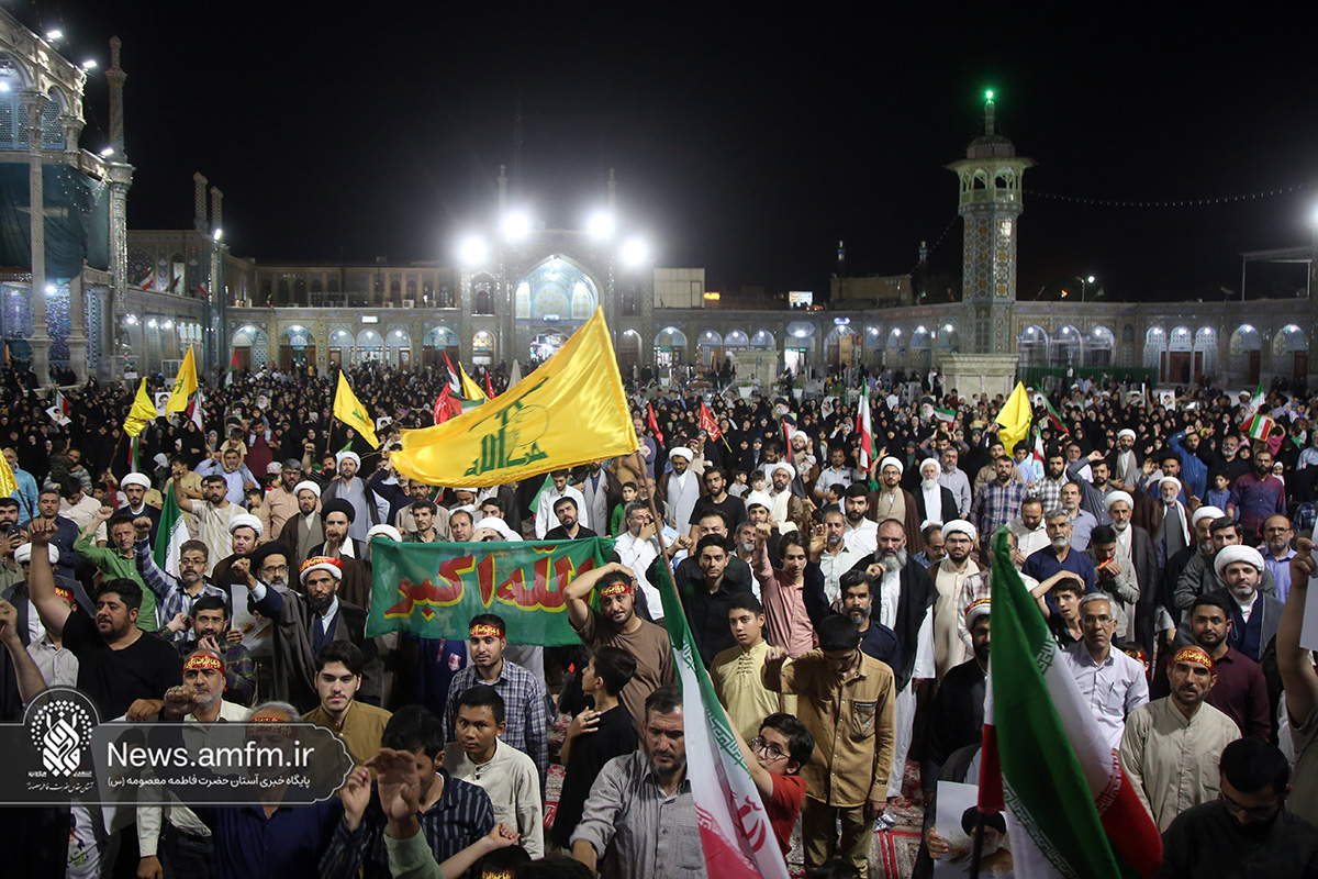 مردم متدین و انقلابی قم با حضور پرشور در حرم مطهر حضرت فاطمه معصومه سلام الله علیها ضمن اعلام انزجار از تجاوزات آمریکا و رژیم صهیونیستی به خاک کشور فریاد انتقام سر دادند.