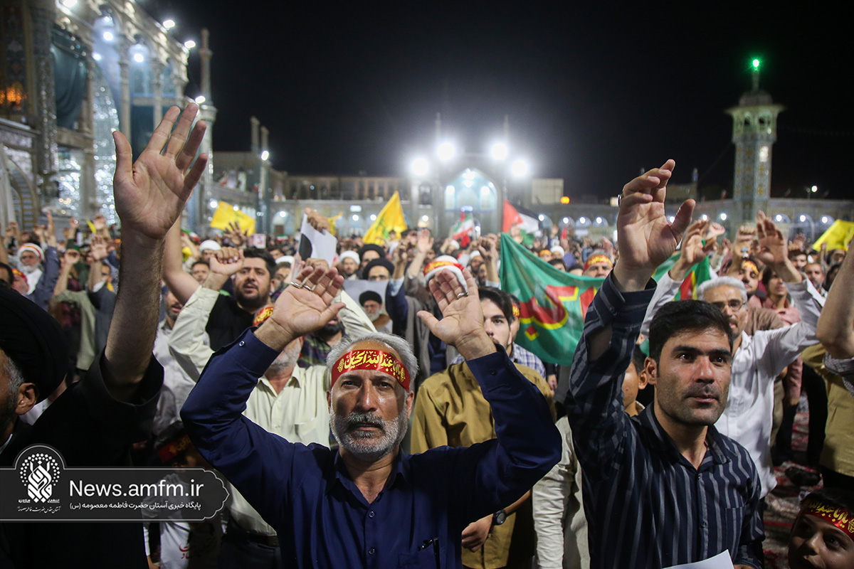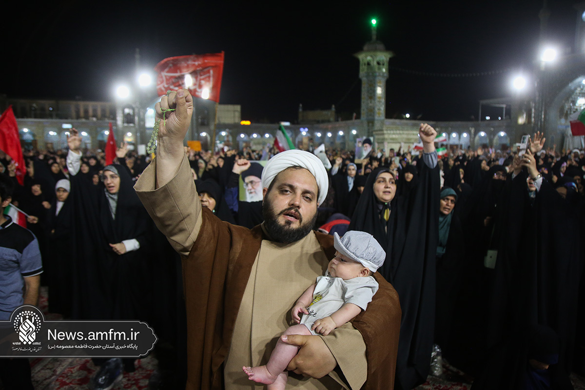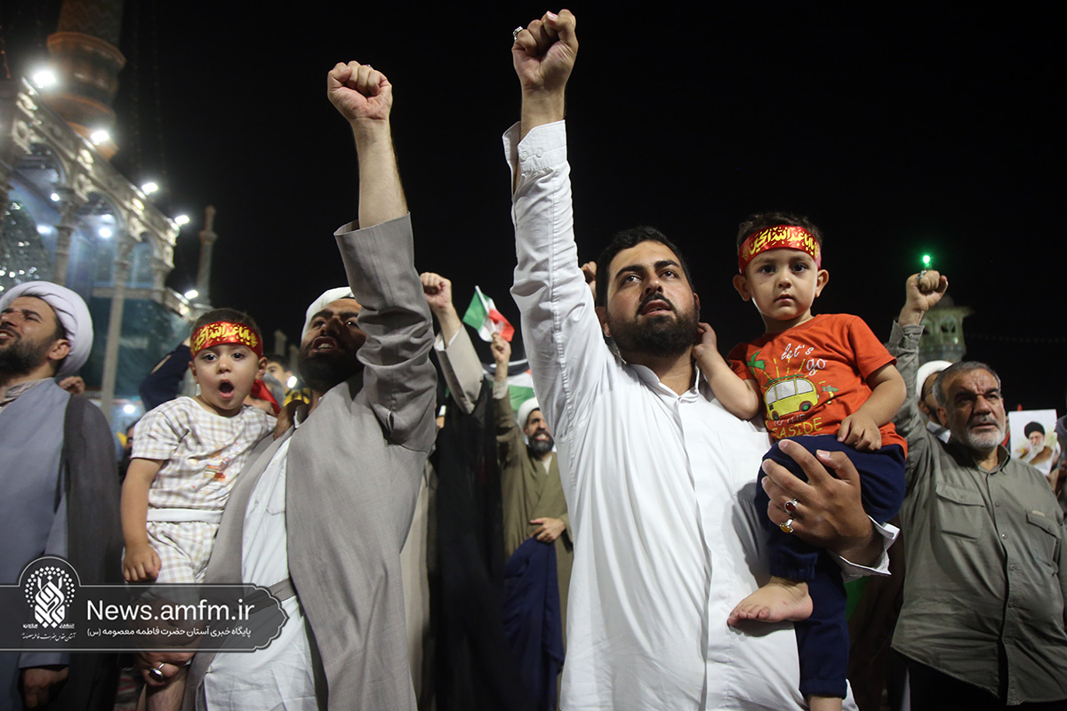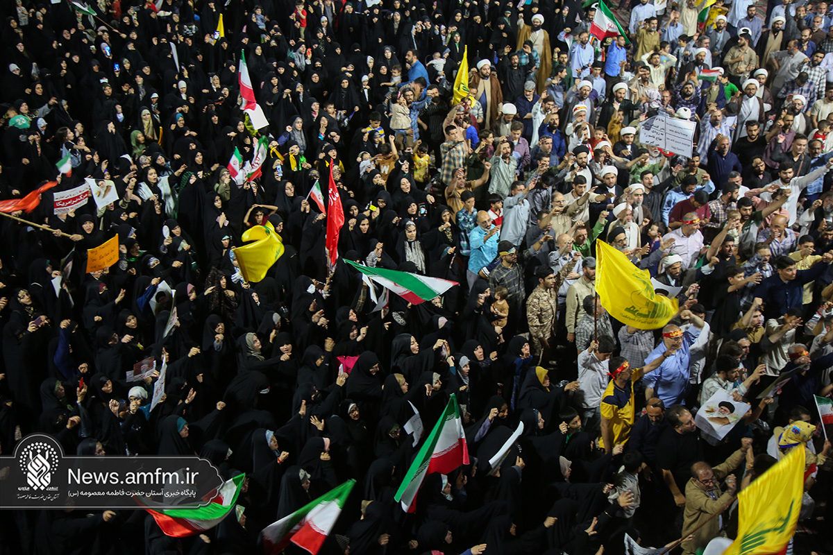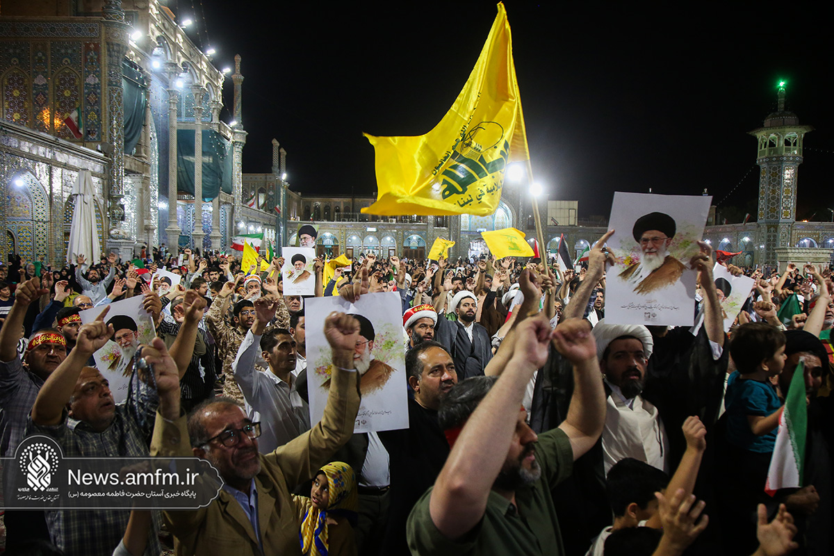 مردم متدین و انقلابی قم با حضور پرشور در حرم مطهر حضرت فاطمه معصومه سلام الله علیها ضمن اعلام انزجار از تجاوزات آمریکا و رژیم صهیونیستی به خاک کشور فریاد انتقام سر دادند.