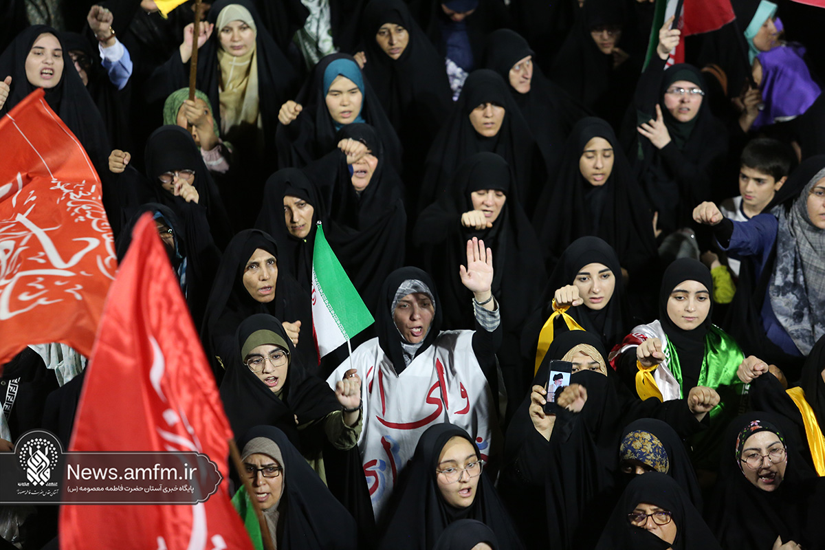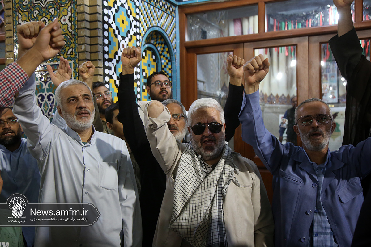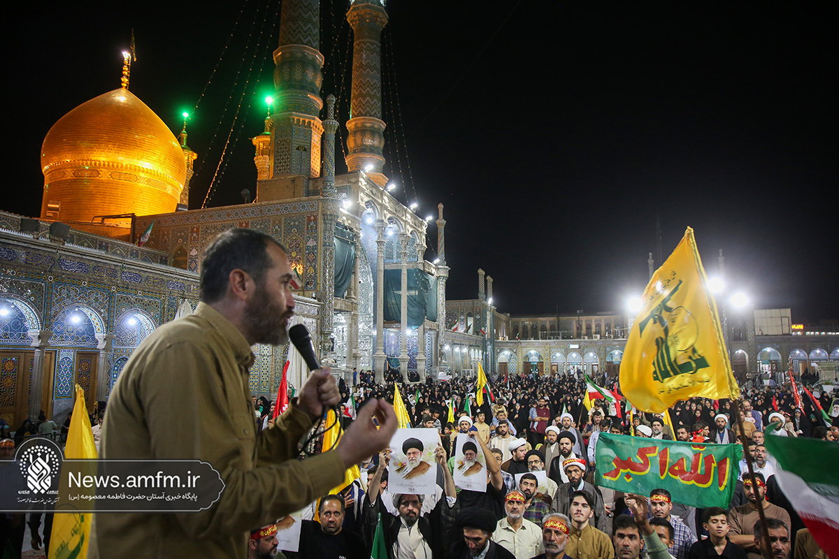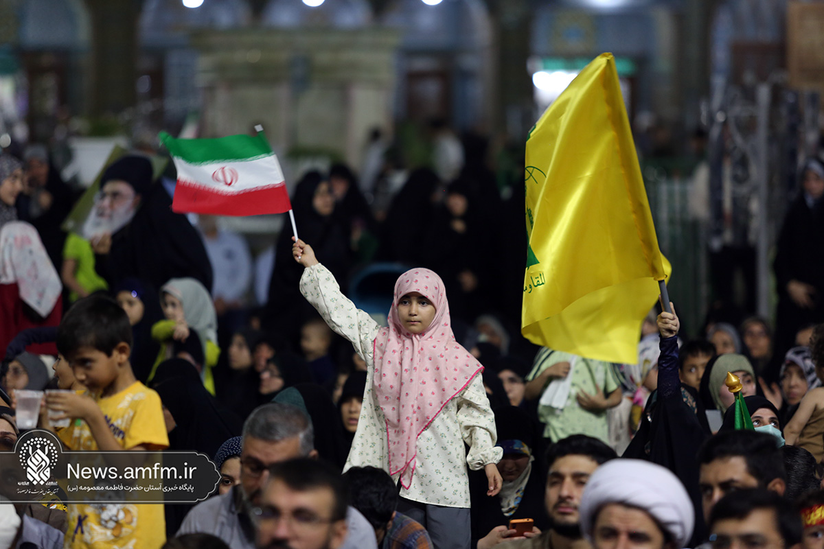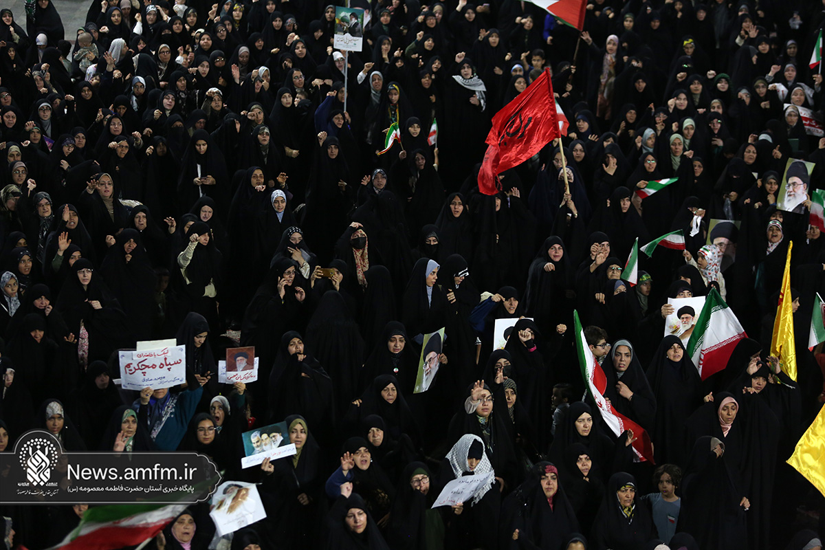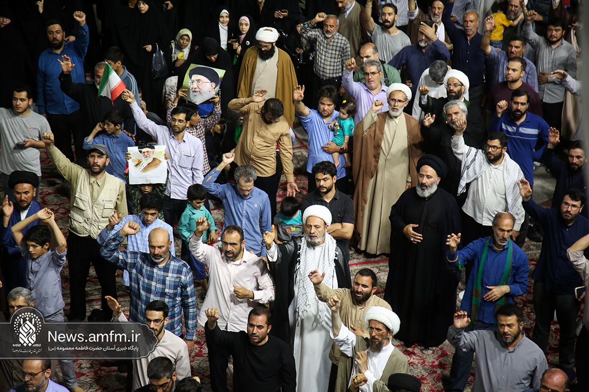 مردم متدین و انقلابی قم با حضور پرشور در حرم مطهر حضرت فاطمه معصومه سلام الله علیها ضمن اعلام انزجار از تجاوزات آمریکا و رژیم صهیونیستی به خاک کشور فریاد انتقام سر دادند.