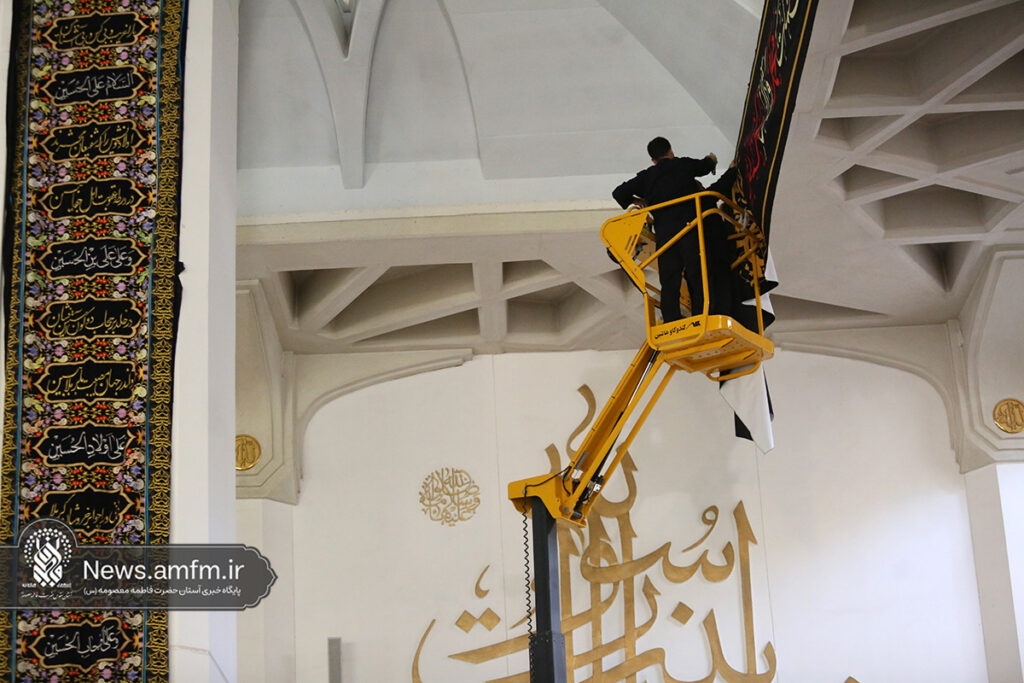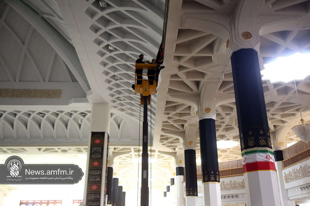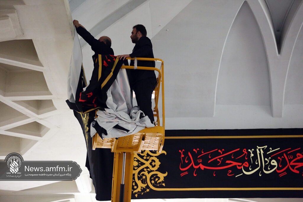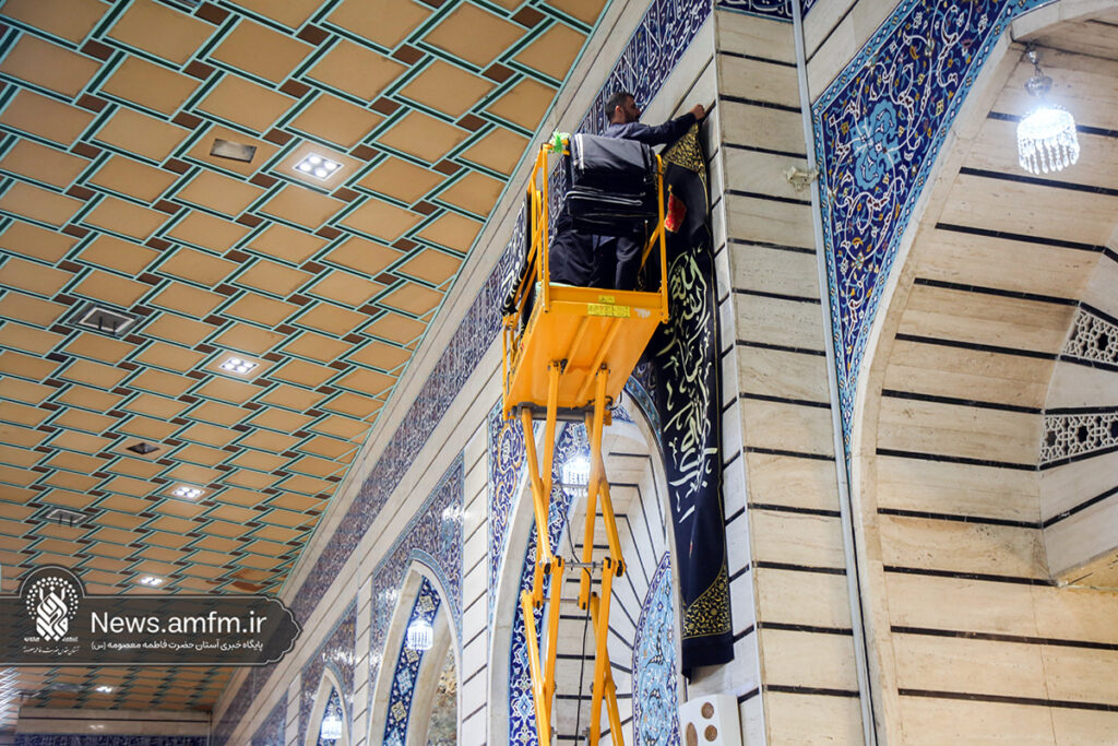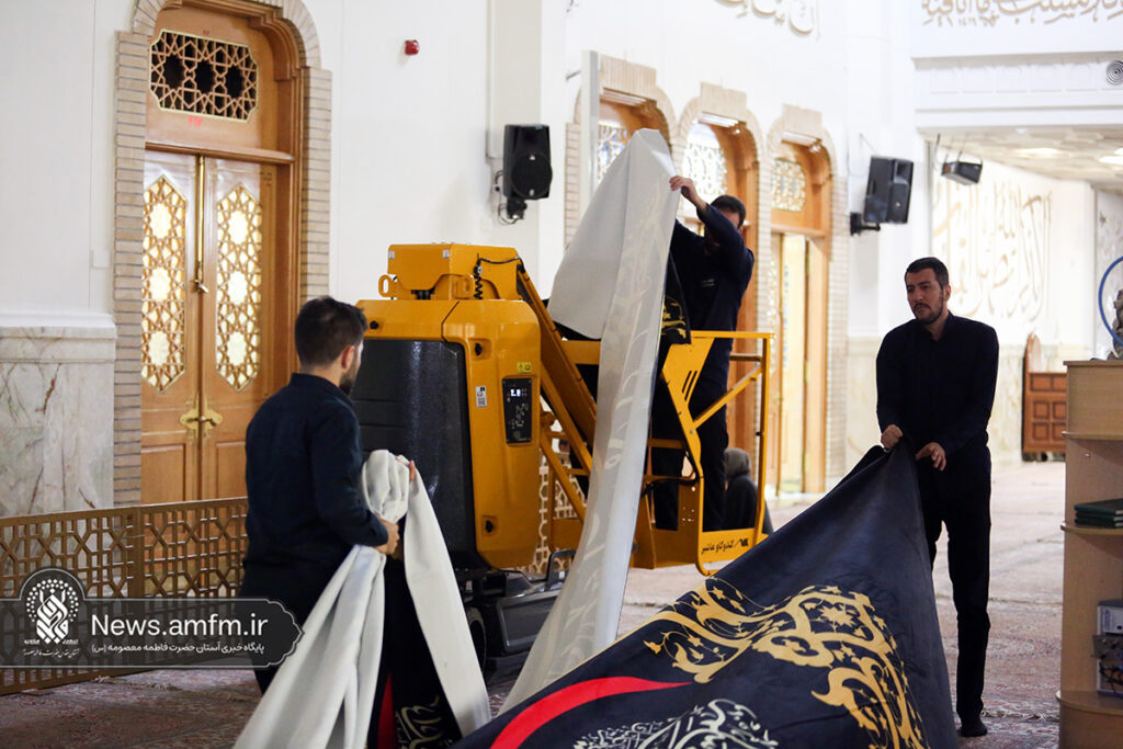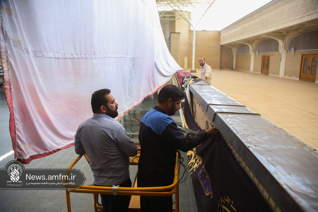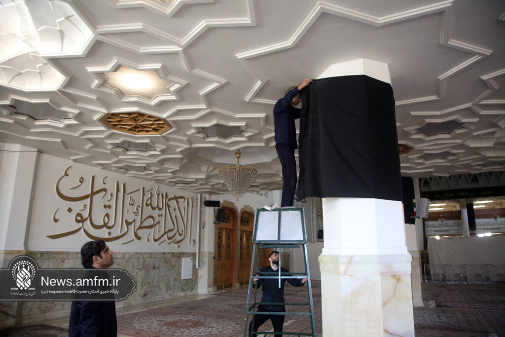 خادمان حرم مطهر بانوی کرامت در آستانه فرارسیدن ماه محرم ضریح مطهر و صحن و سرای حرم را سیاهپوش کردند.