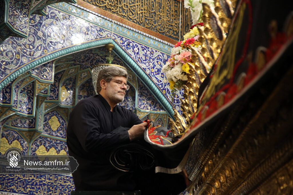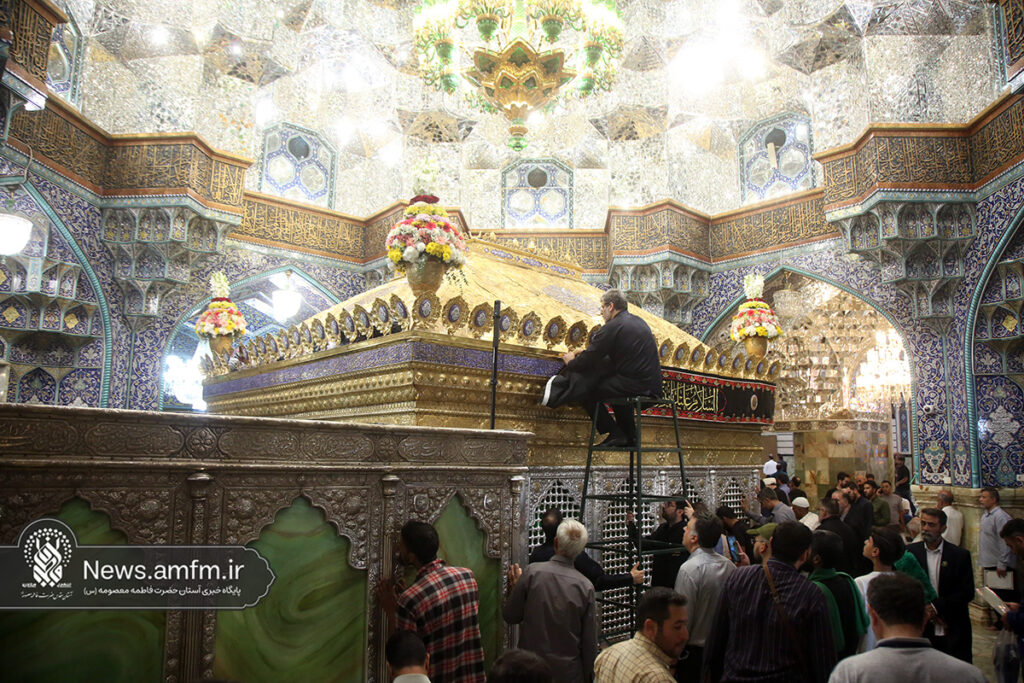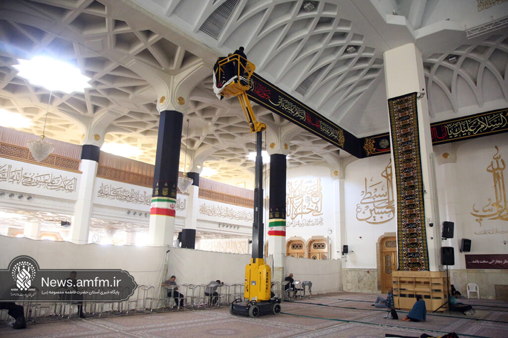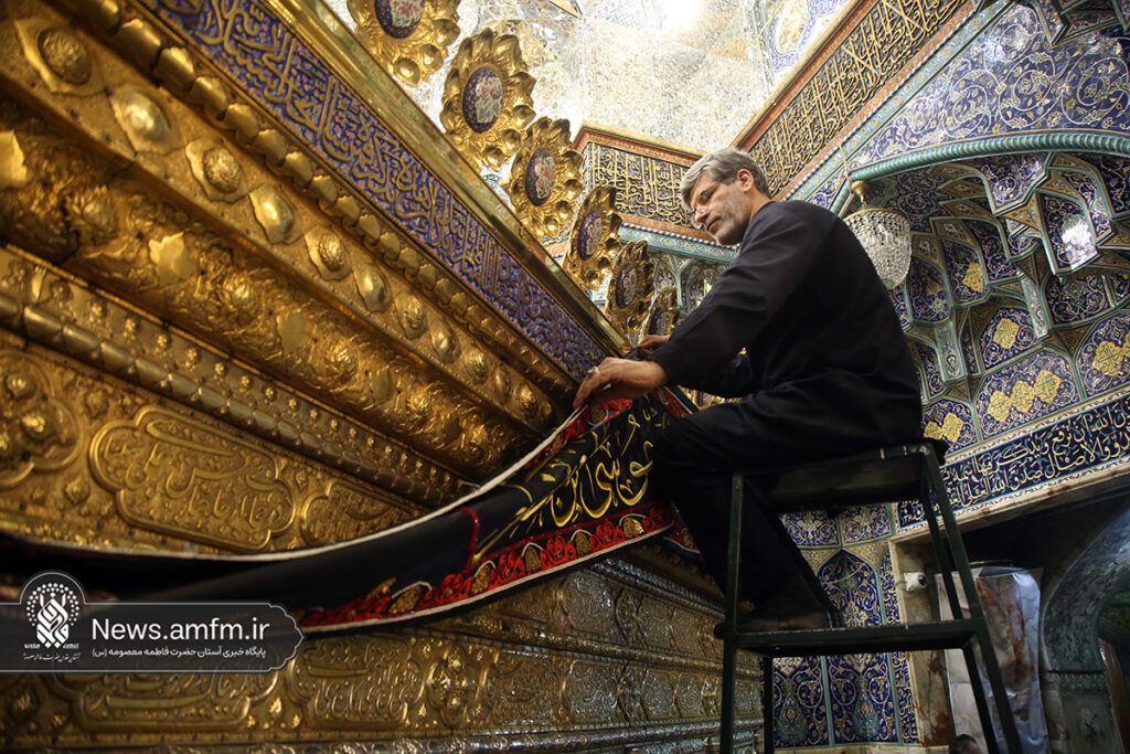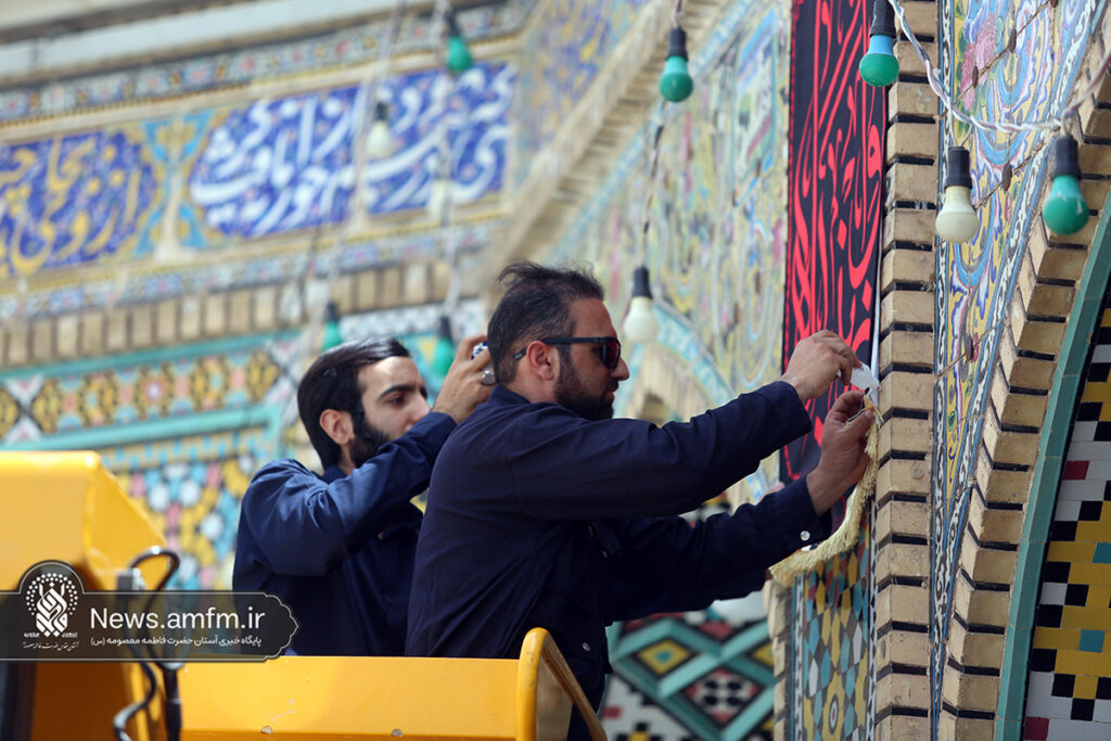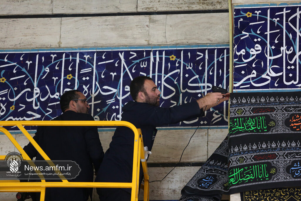 خادمان حرم مطهر بانوی کرامت در آستانه فرارسیدن ماه محرم ضریح مطهر و صحن و سرای حرم را سیاهپوش کردند.
