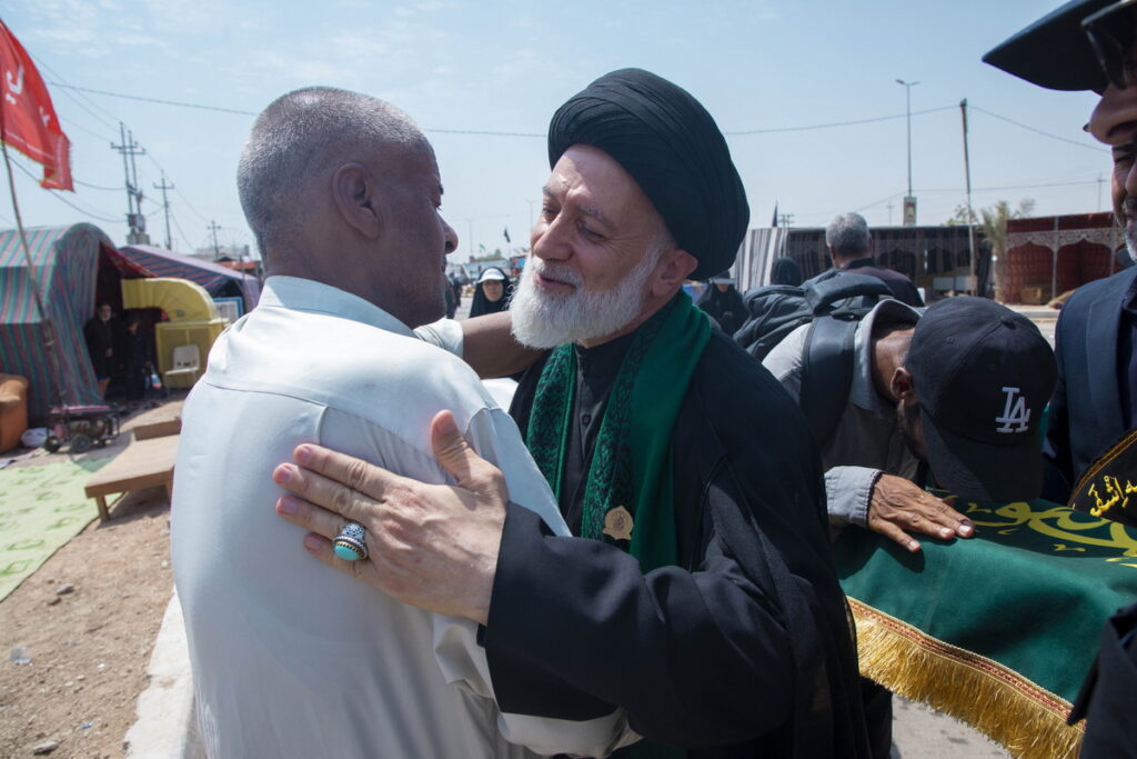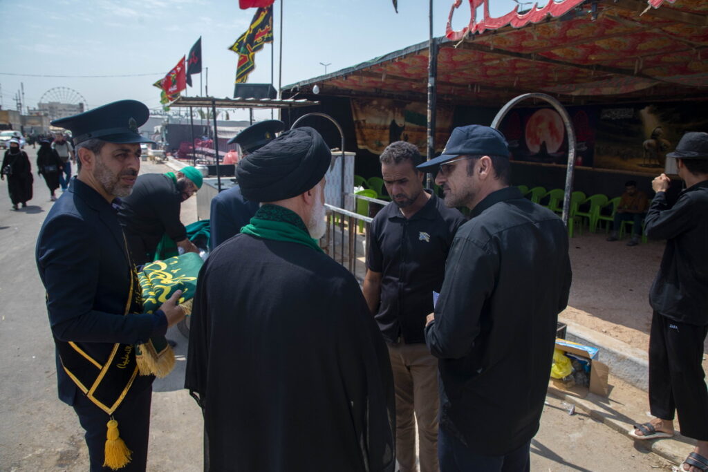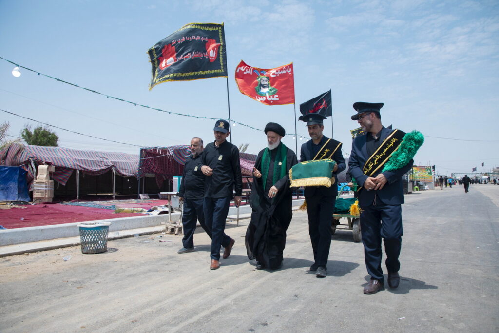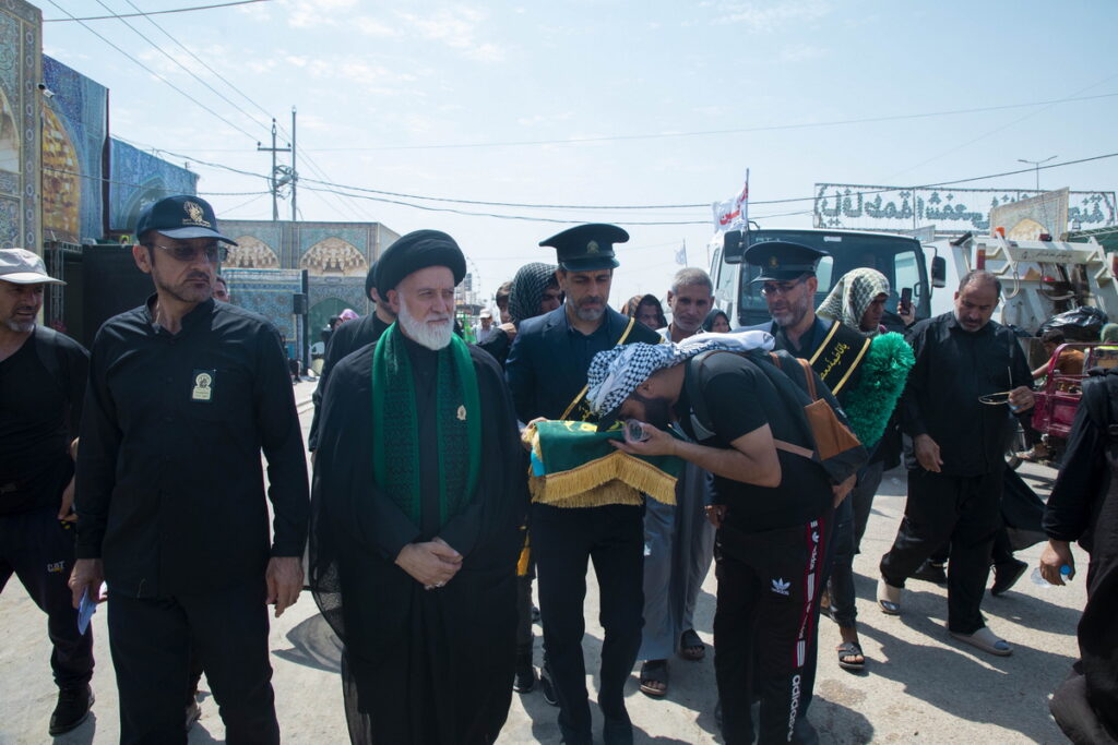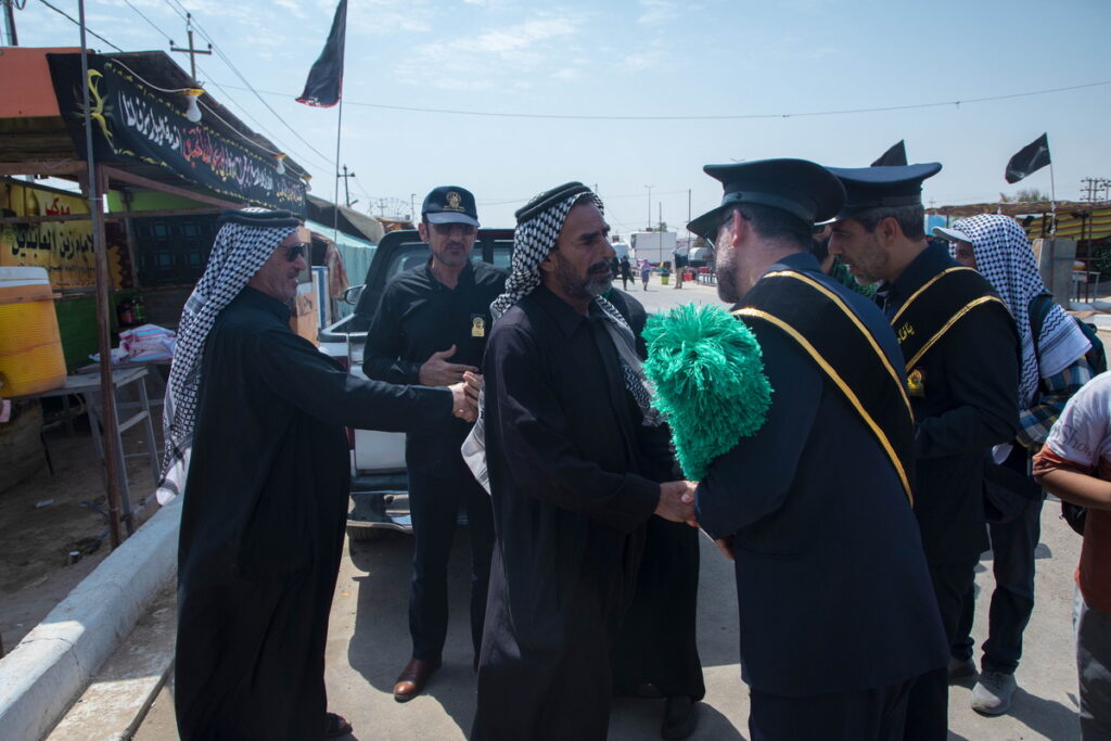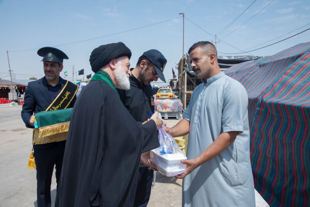 مسئول فرهنگی موکب حرم مطهر بانوی کرامت به همراه جمعی از خدام آستان مقدس حضرت فاطمه معصومه سلام الله علیها با حمل پرچم متبرک گنبد مطهر حرم کریمه اهل بیت(س) و توزیع متبرکات فاطمی برخی از موکبداران عراقی مسیر نجف تا کربلا را تکریم کردند.