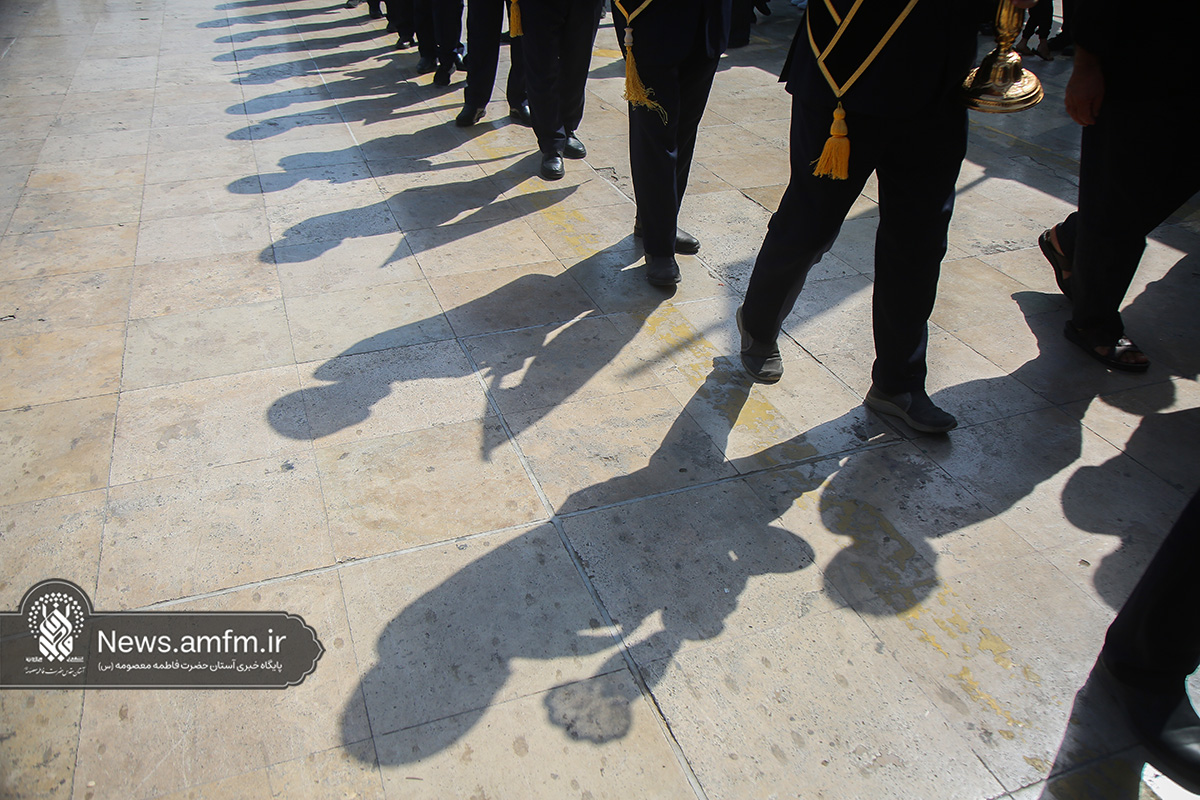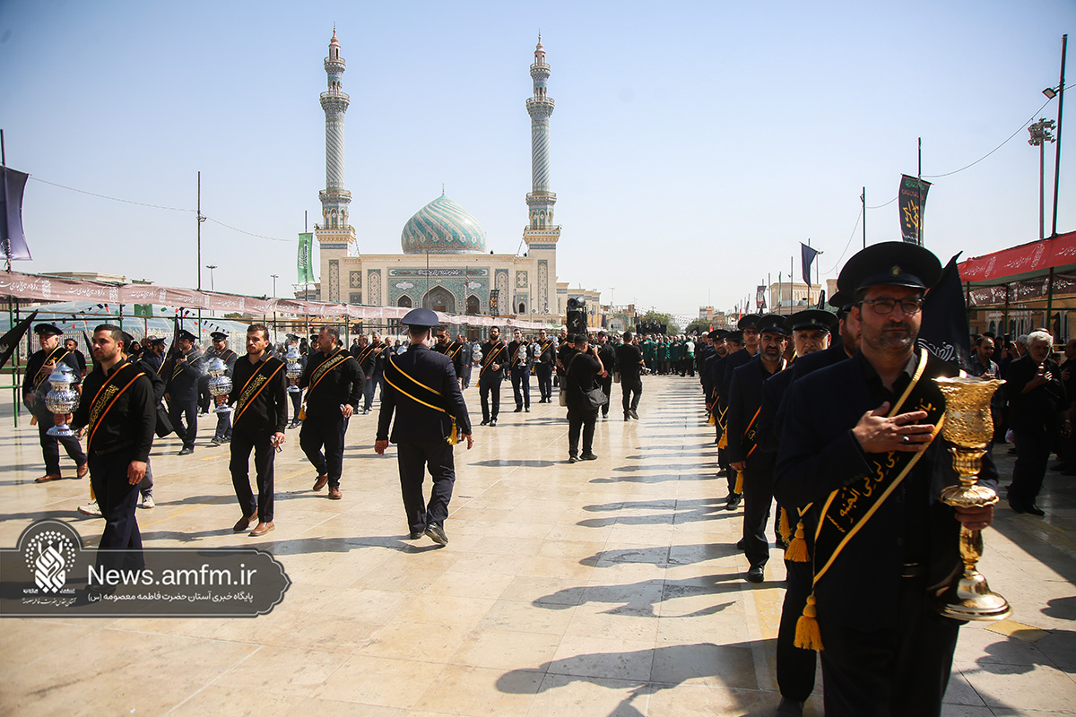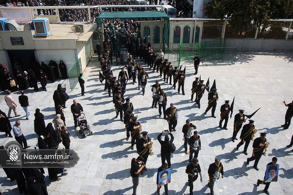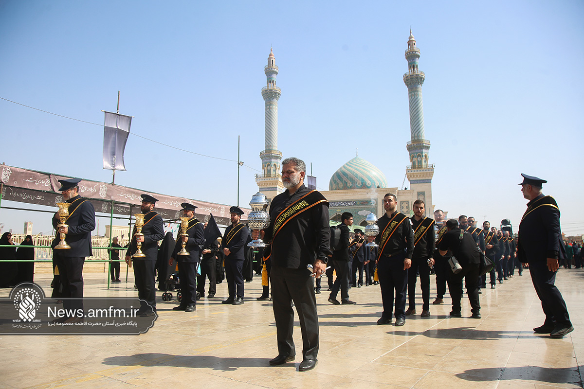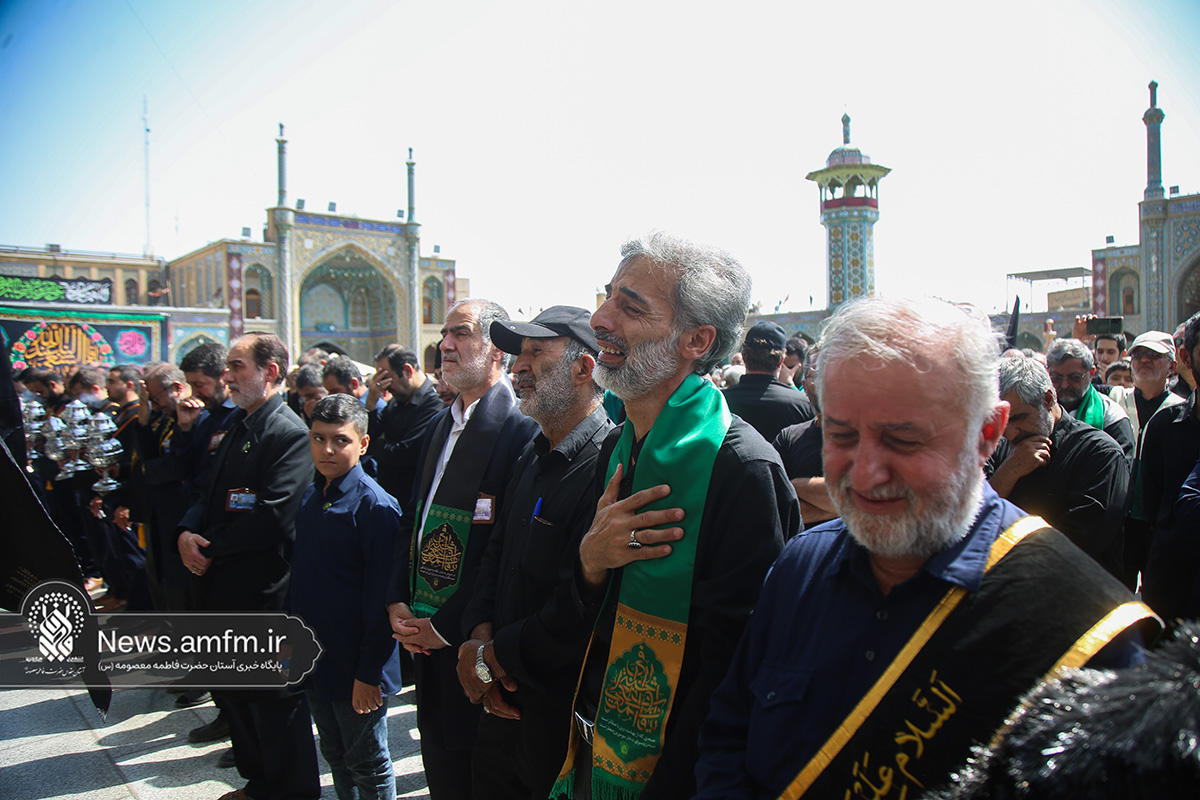 خادمان حرم مطهر حضرت فاطمه معصومه سلاماللهعلیها در سالروز شهادت امام رضا علیهالسلام از مسجد امام حسن عسکری علیهالسلام به سمت حرم مطهر دسته عزا برپا کردند و در صحن امام رضا علیهالسلام به عزاداری پرداختند.