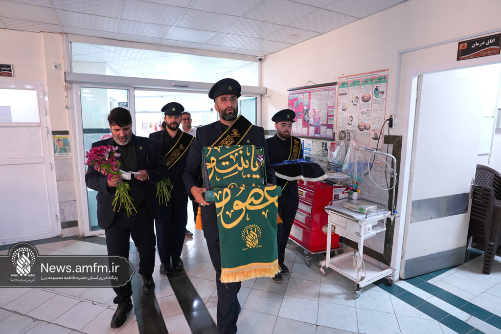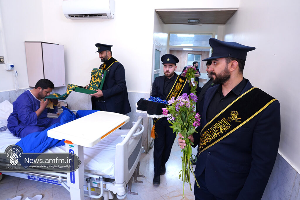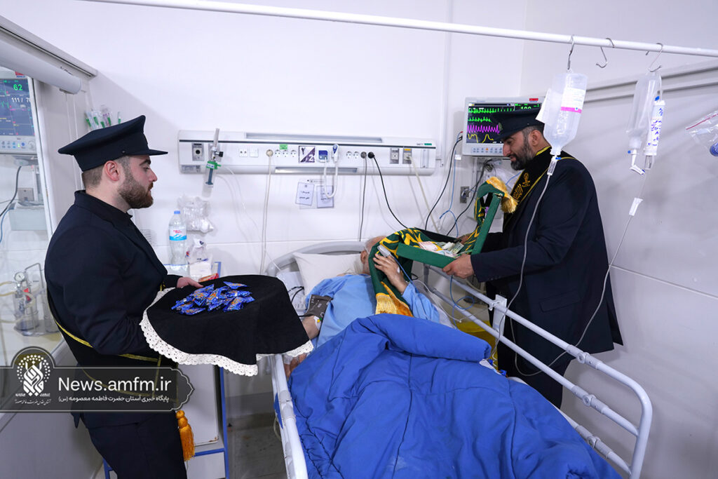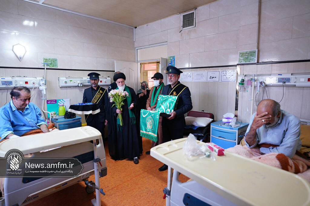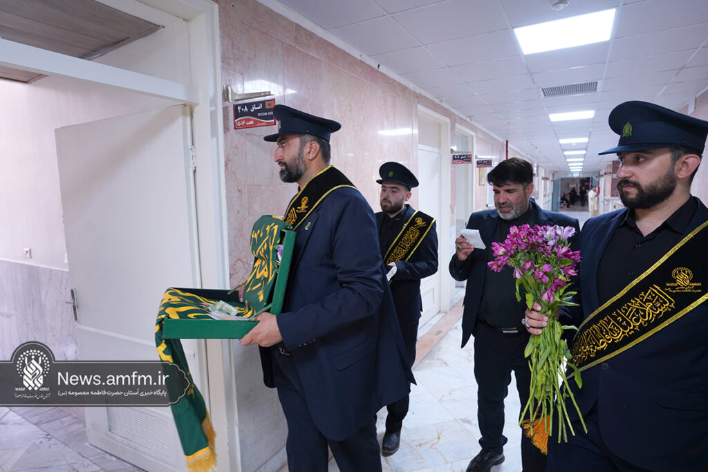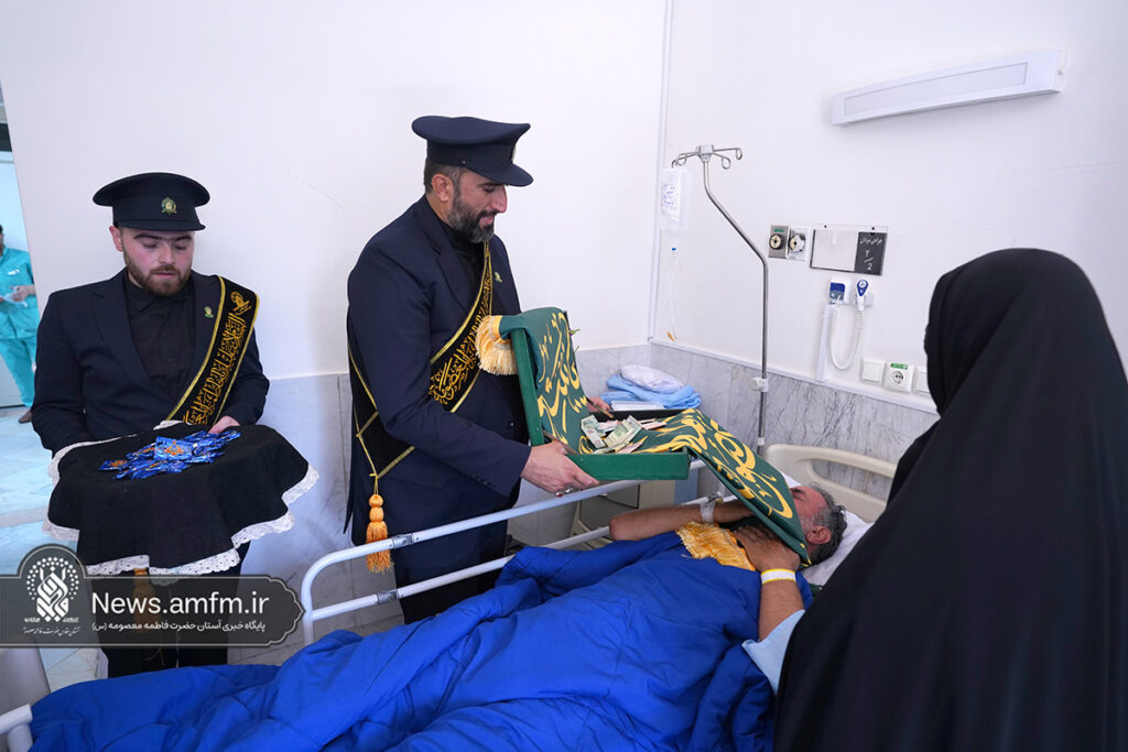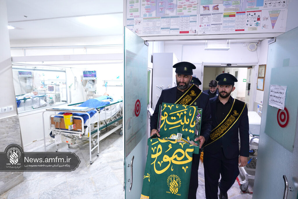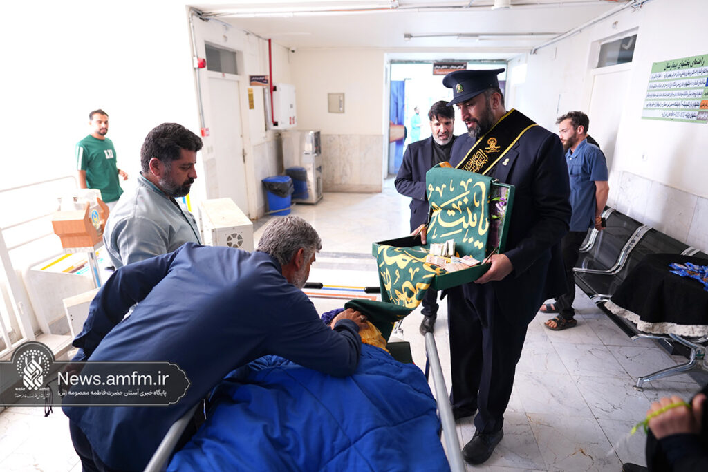 خادمان حرم مطهر حضرت فاطمه معصومه سلام الله علیها به همراه پرچم متبرک حرم مطهر در آستانه سالروز رحلت بانوی کرامت با حضور در دو بیمارستان از بیماران عیادت کردند.