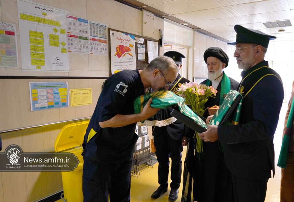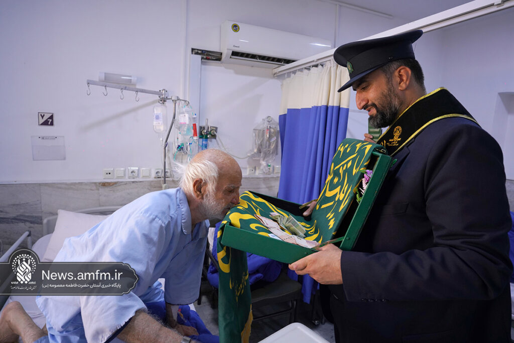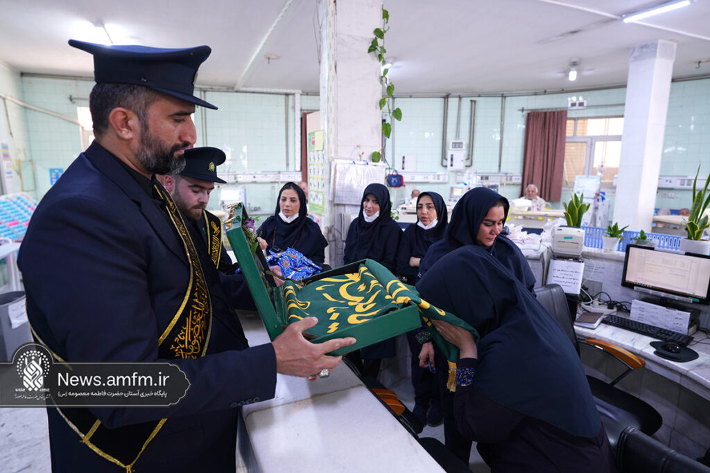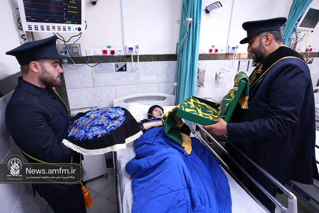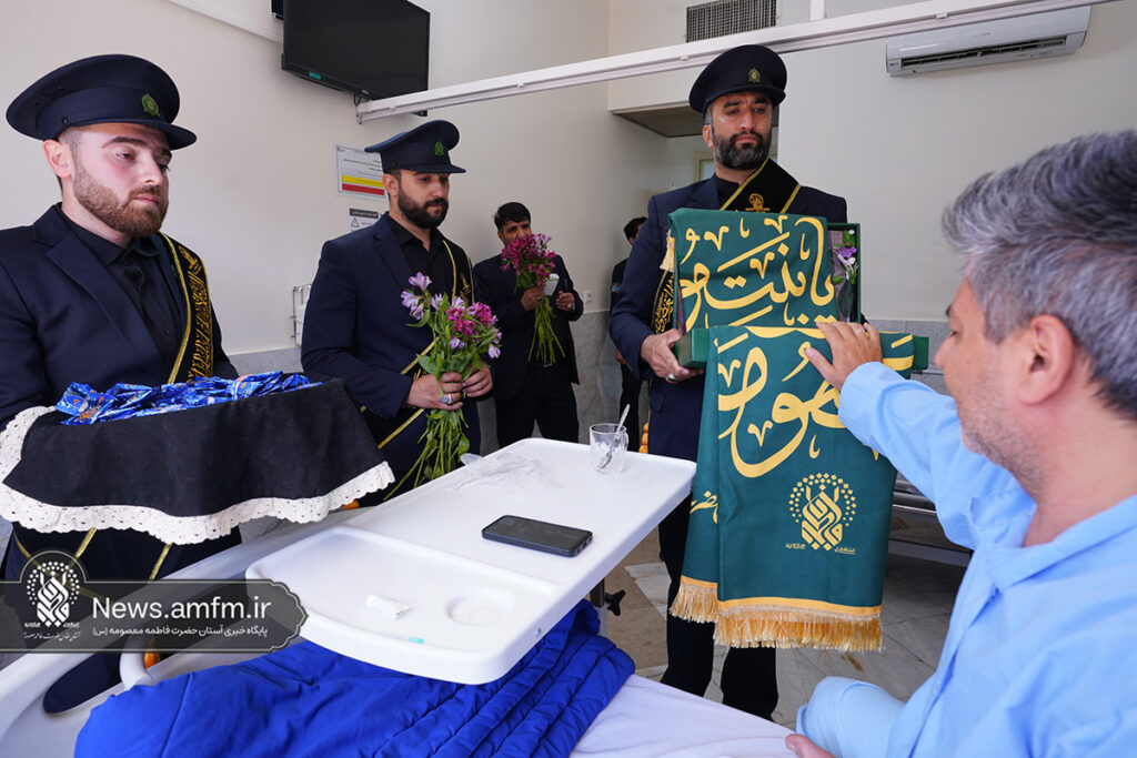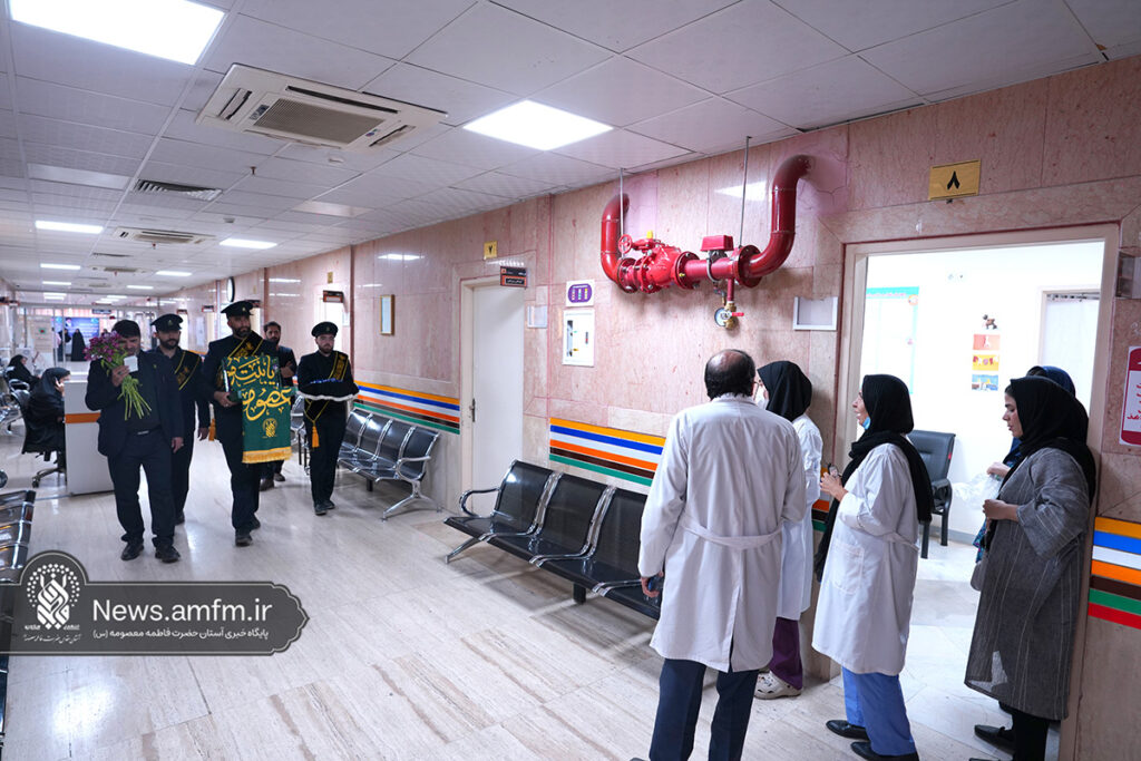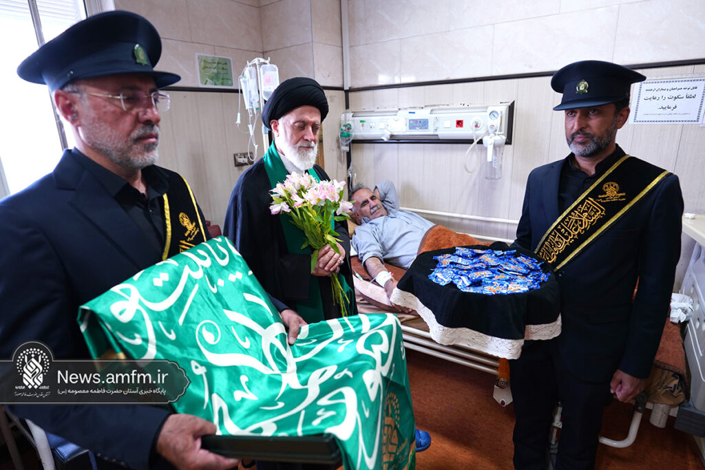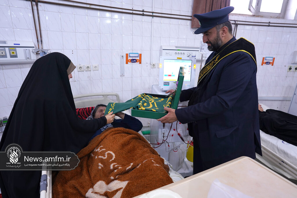 خادمان حرم مطهر حضرت فاطمه معصومه سلام الله علیها به همراه پرچم متبرک حرم مطهر در آستانه سالروز رحلت بانوی کرامت با حضور در دو بیمارستان از بیماران عیادت کردند.