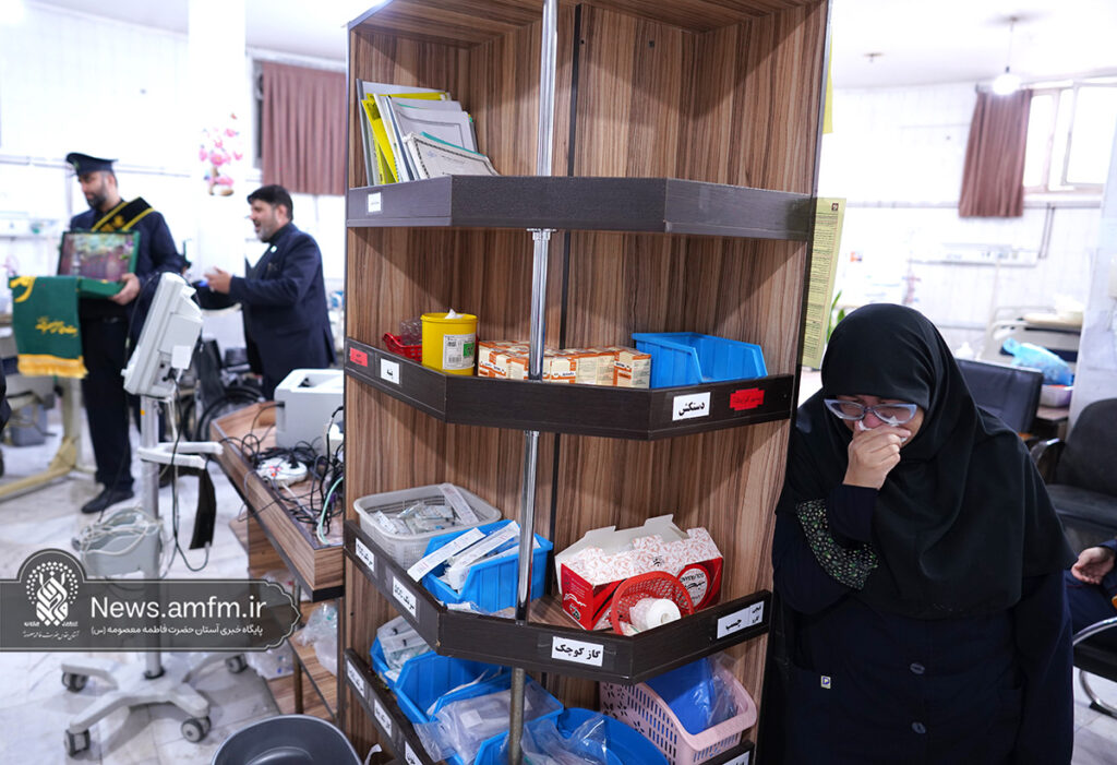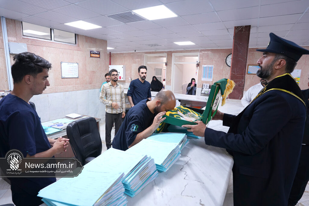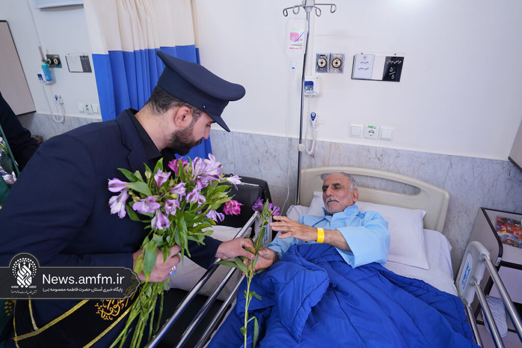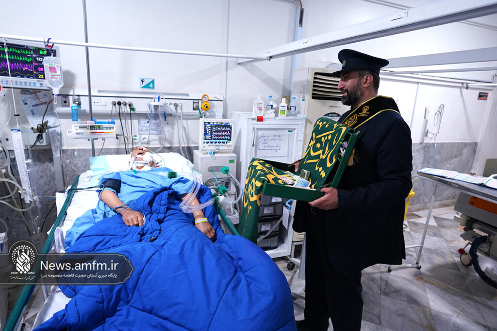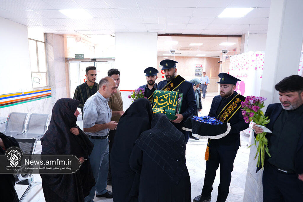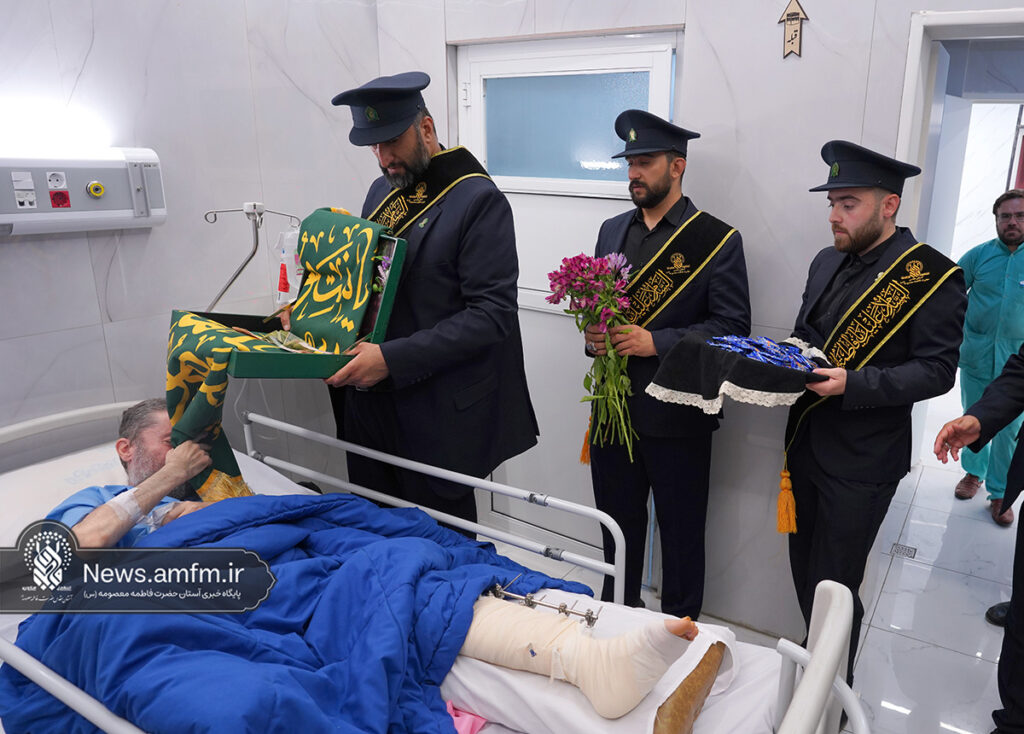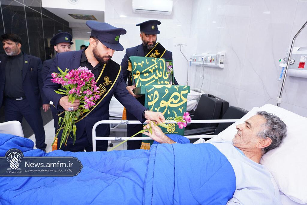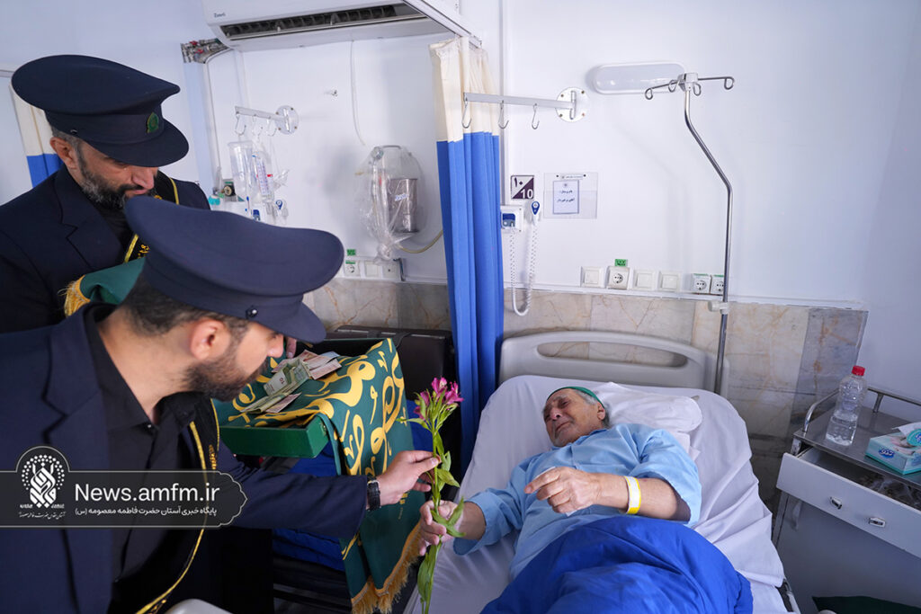 خادمان حرم مطهر حضرت فاطمه معصومه سلام الله علیها به همراه پرچم متبرک حرم مطهر در آستانه سالروز رحلت بانوی کرامت با حضور در دو بیمارستان از بیماران عیادت کردند.
