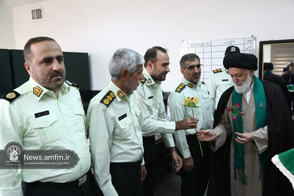 جمعی از خادمان حرم حضرت فاطمه معصومه سلام الله علیها به مناسبت هفته نیروی انتظامی با حضور در مرکز فرماندهی انتظامی استان قم از محمدرضا میرحیدری فرمانده انتظامی استان قم و جمعی از کارکنان انتظامی با اهدای گل و متبرکات فاطمی تجلیل کردند.