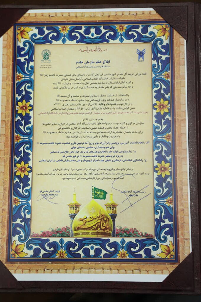 در این حکم قید شده است که «در چارچوب رهنمودها و وظایف ابلاغی از سوی مقام معظم رهبری مدظلهالعالی ضمن گرامیداشت یاد و خاطره مقام والای امام راحل و شهدای انقلاب اسلامی به ویژه شهید دکتر محمد مهدی طهرانچی و سایر شهدای گرانقدر عرصه علم، عمل و اقتدار در دانشگاه آزاد اسلامی به موجب این ابلاغ سازمان مرکزی و کلیه موسسات و واحدهای تابعه دانشگاه آزاد اسلامی در ایران و سایر کشورها از جمله اعضای محترم هیات علمی، اساتید، کارکنان و دانشجویان برای مدت یک سال مفتخر به ارائه خدمت به آستان مقدس حضرت فاطمه معصومه سلام الله علیها با محوریت وظایف محوله و مأموریتهای ابلاغی خواهند بود».