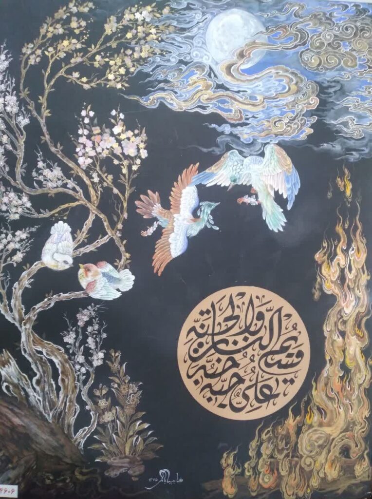 وی افزود: در این اثر، هر عنصر تصویری حامل پیام معنوی است؛ پرندگان نماد صعود روح و آزادی معنوی، درخت و شکوفهها نشانه حیات و بالندگی، ماه نماد هدایت و نور، ابرها نشانه حرکت ملکوتی و آتش رمز تطهیر و گذر از آزمونهای معنوی هستند که همگی در خدمت تبیین مفهوم ولایت علوی قرار گرفتهاند.»