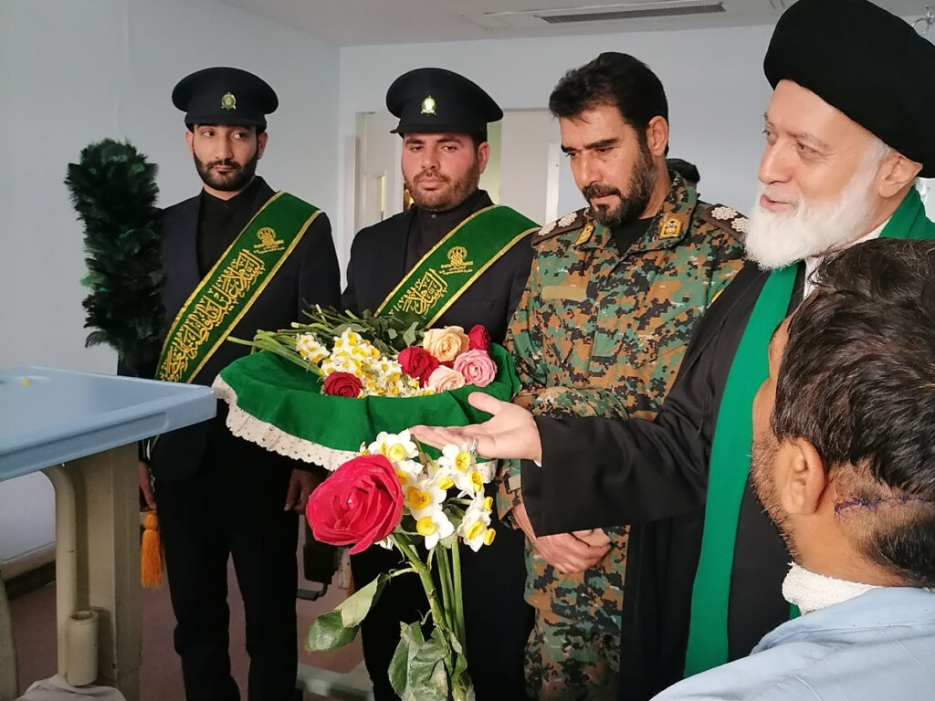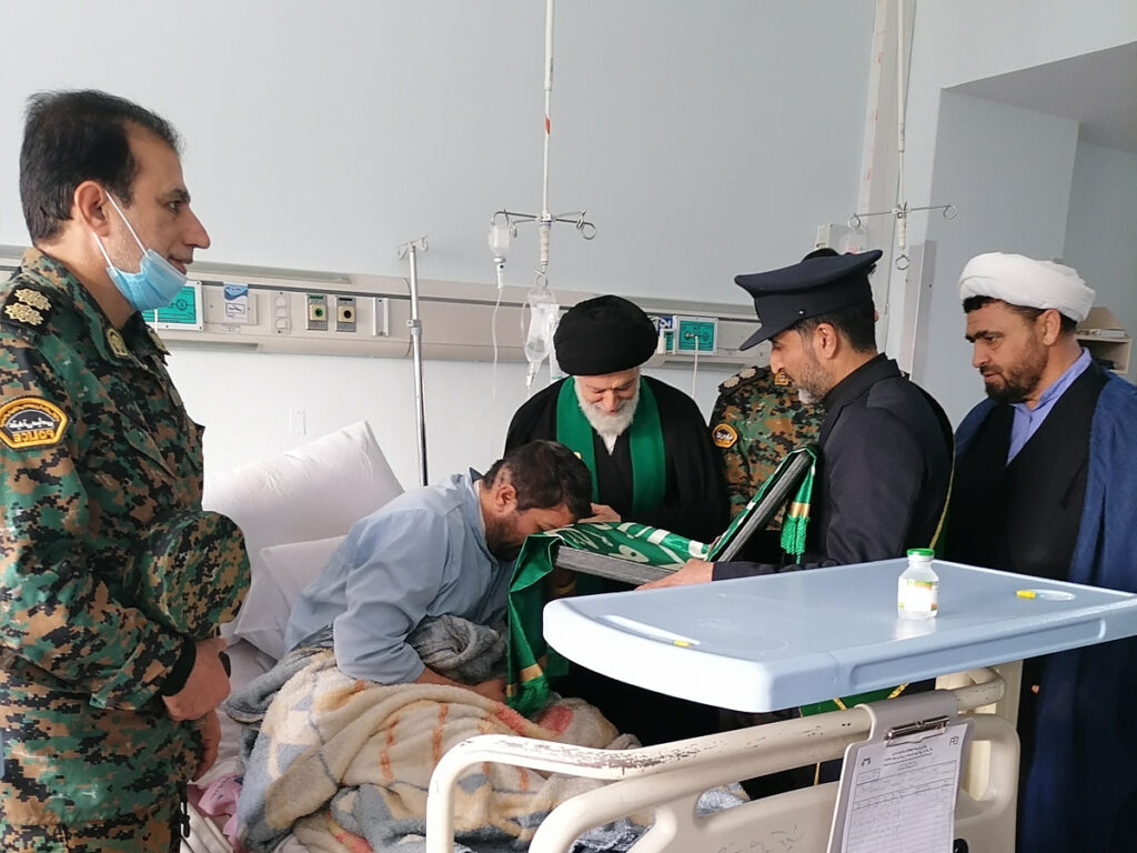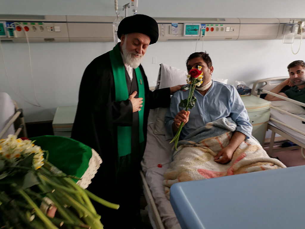 جمعی از خادمان حرم مطهر حضرت فاطمه معصومه سلاماللهعلیها به همراه پرچم متبرک این آستان مقدس با حضور در بیمارستان شهید بهشتی قم ضمن عیادت از مجروحان حملات اغتشاشات و حوادث تروریستی اخیر در شهر قم از ایشان تقدیر کردند.
