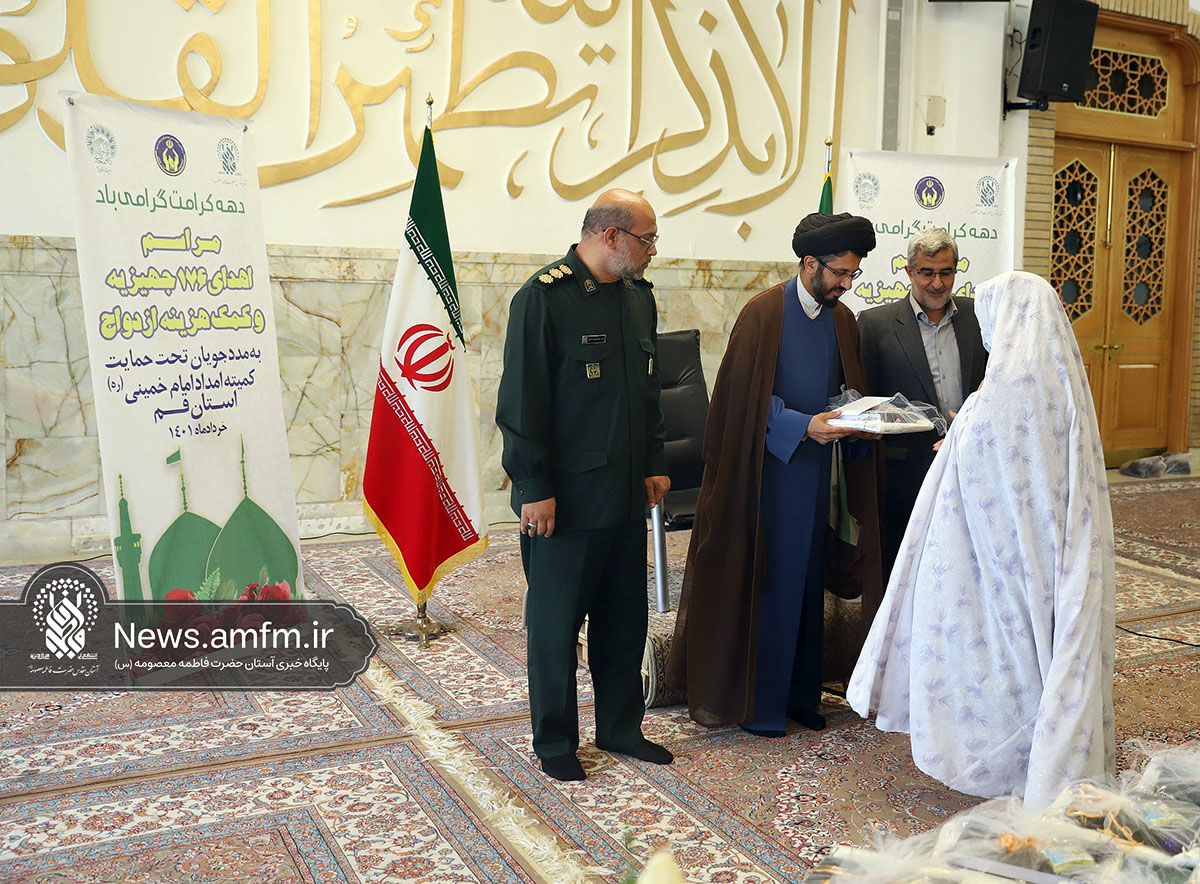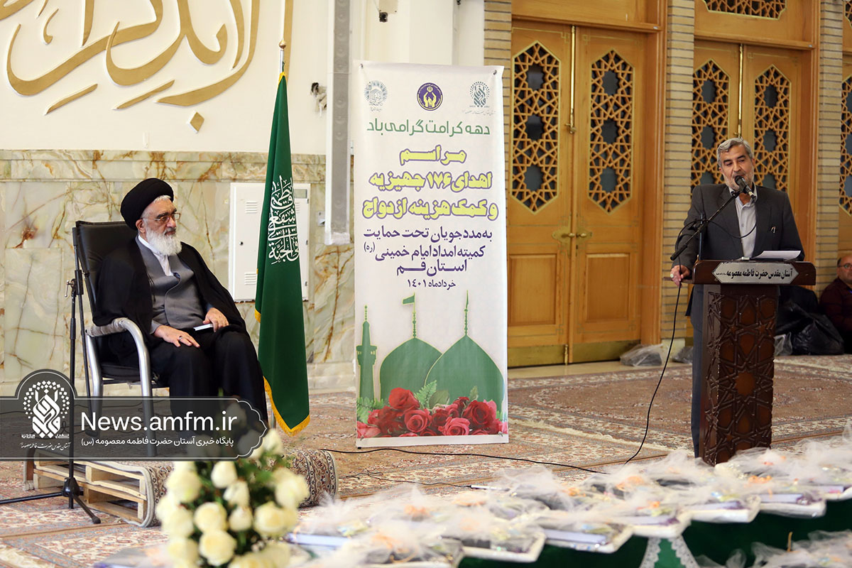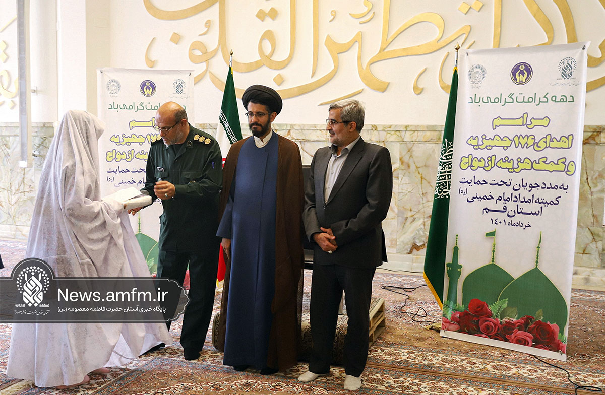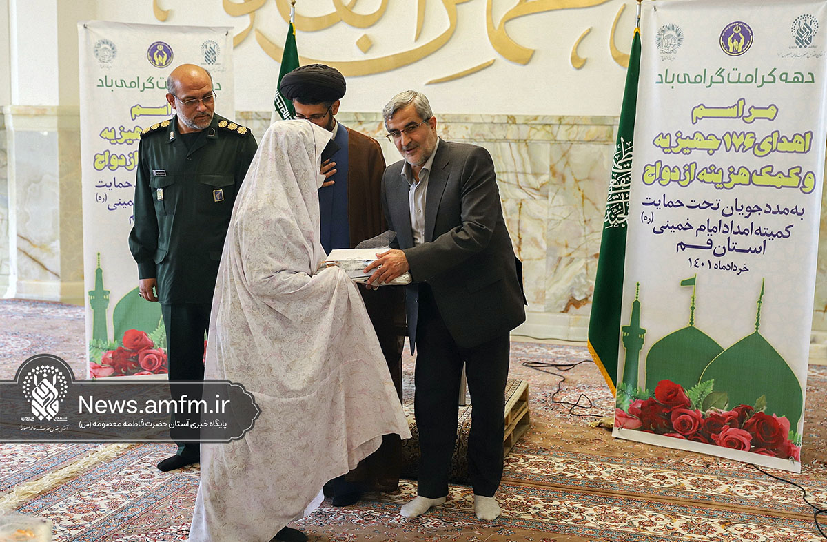 به گزارش پایگاه خبری آستان مقدس حضرت معصومه سلام الله علیها، مراسم اهدای ۱۷۶ جهیزیه و کمک هزینه ازدواج به زوج های جوان نیازمند با مشارکت آستان مقدس بانوی کرامت، کمیته امداد امام خمینی(ره) و آستان قدس رضوی پیش از ظهر امروز با حضور آیت الله سید محمد سعیدی، مسئولان کمیته امداد امام خمینی(ره) استان قم و ۸۸ نوعروس در حرم مطهر حضرت معصومه سلام الله علیها برگزار شد.