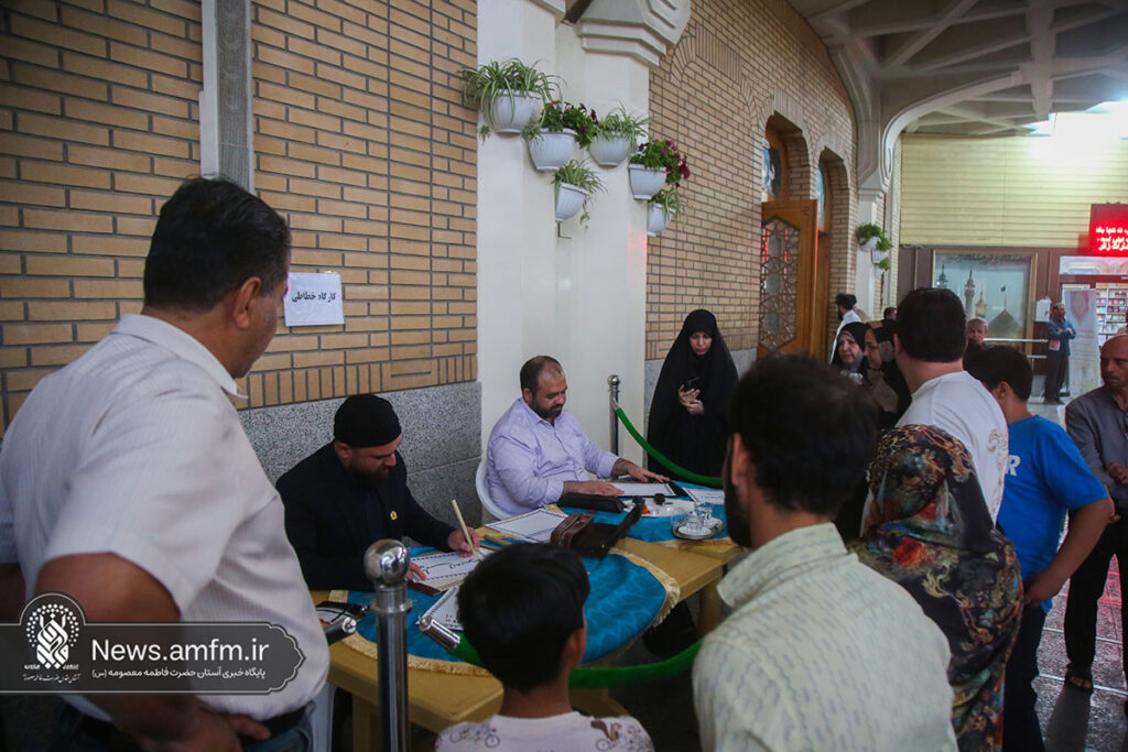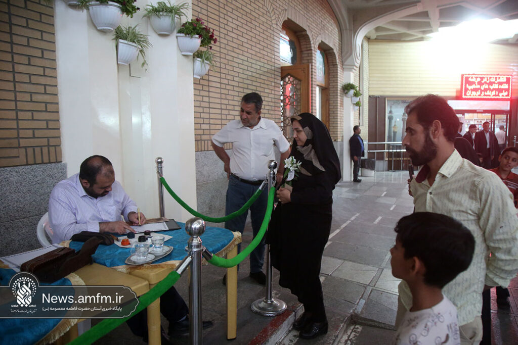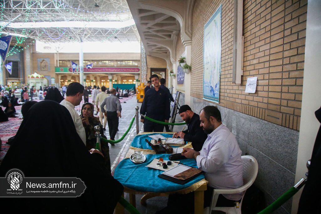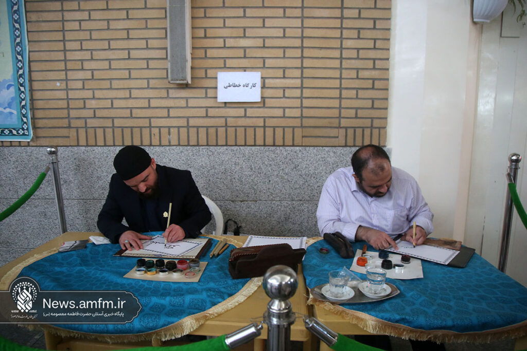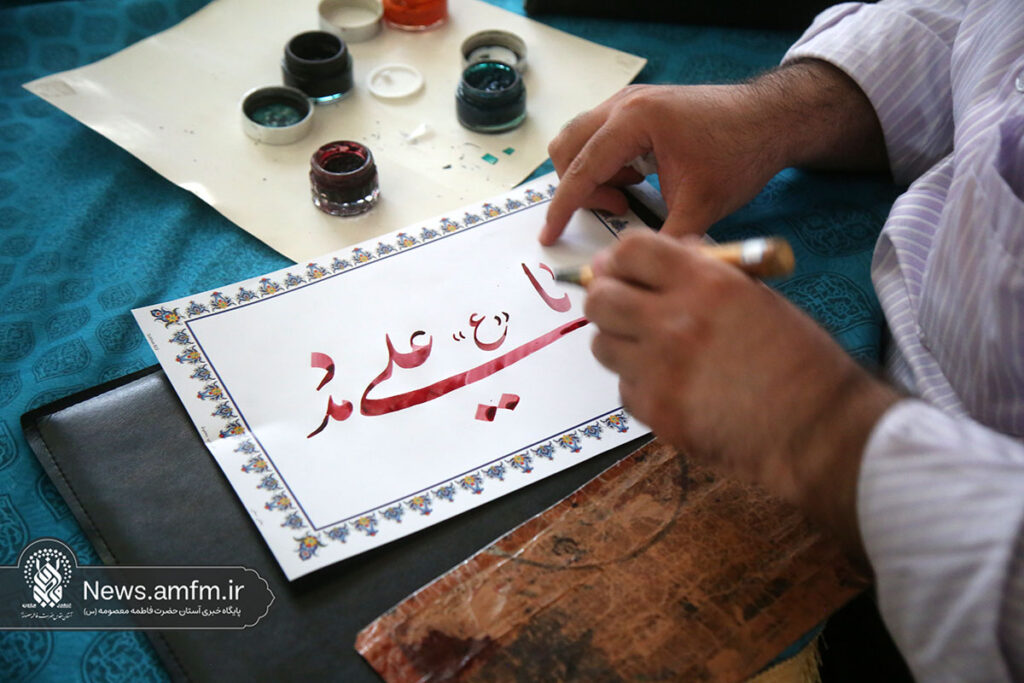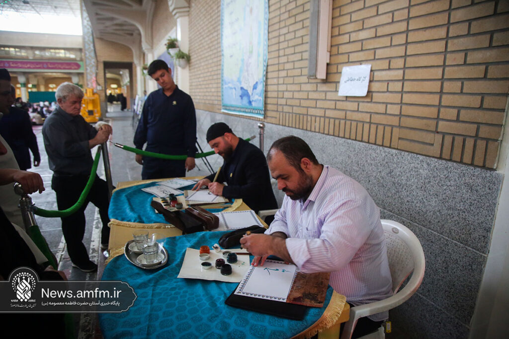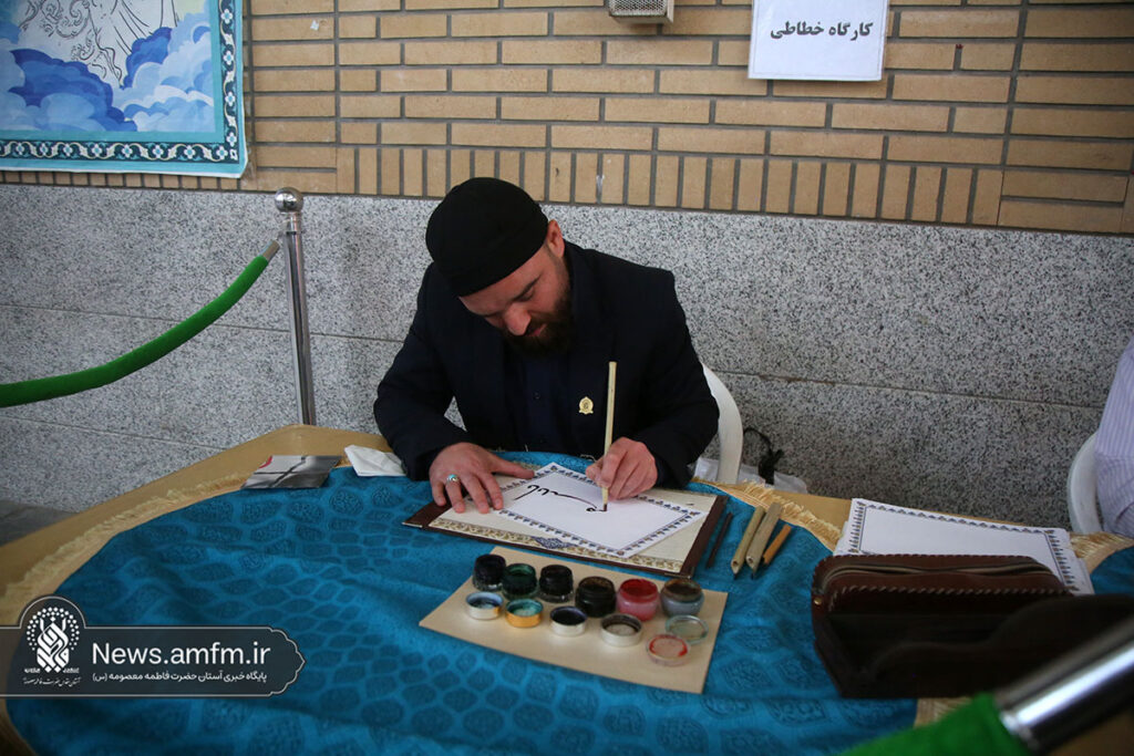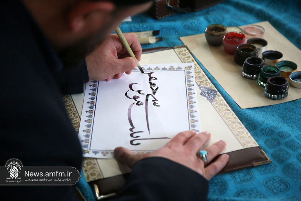 گفتنی است در این میز خوشنویسی اسامی و القاب حضرت معصومه سلام الله علیها و سایر اهل بیت عصمت و طهارت(ع) به سفارش زائران نوشته و به آنها تقدیم شد.